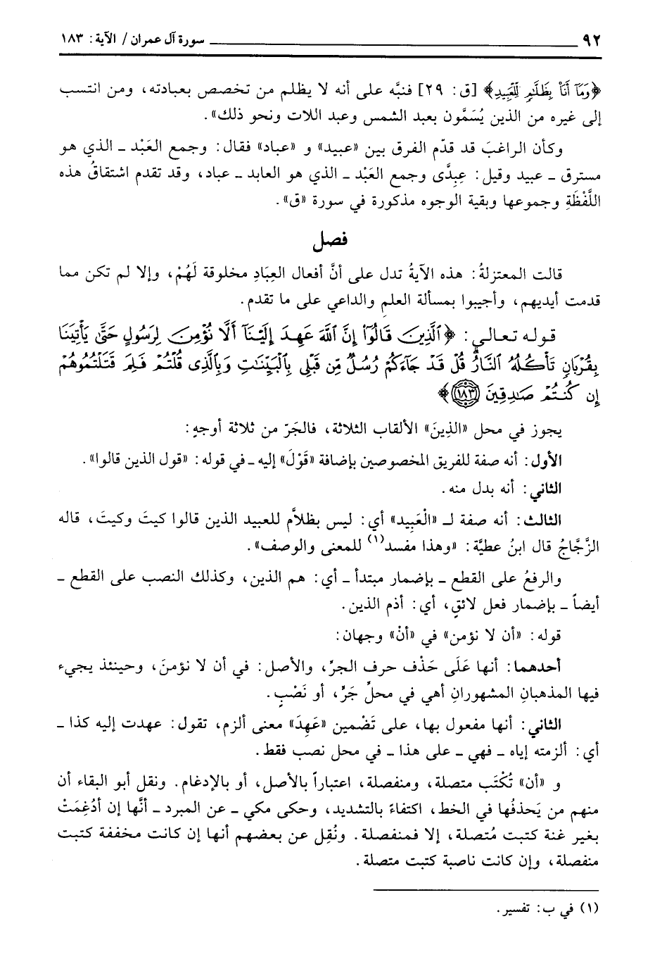الثالث: أنه صفة ل «الْعَبِيد» أي: ليس بظلاَّم للعبيد الذين قالوا كيتَ وكيتَ، قاله الزَّجَّاجُ قال ابنُ عطيَّة: «وهذا مفسد للمعنى والوصف» .