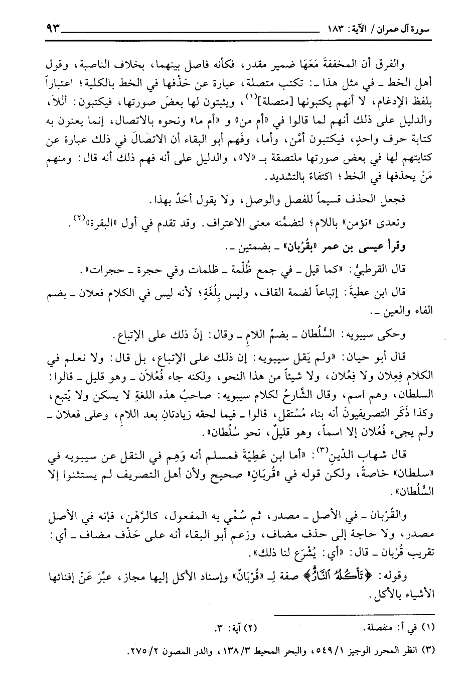 قال شهاب الدِّينِ: «أما ابن عَطِيّةَ فمسلم أنه وَهِم في النقل عن سيبويه في» سلطان «خاصةٌ، ولكن قوله في» قُربَانٍ «صحيح ولأن أهل التصريف لم يستثنوا إلا السُّلُطان» .