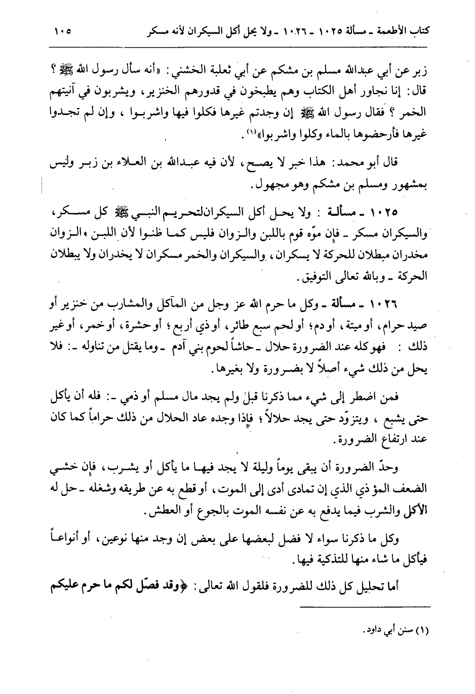 1026 - مَسْأَلَةٌ - وَكُلُّ مَا حَرَّمَ اللَّهُ عَزَّ وَجَلَّ مِنْ الْمَآكِلِ وَالْمَشَارِبِ مِنْ خِنْزِيرٍ أَوْ صَيْدٍ حَرَامٍ، أَوْ مَيْتَةٍ، أَوْ دَمٍ؛ أَوْ لَحْمِ سَبُعٍ أَوْ طَائِرٍ، أَوْ ذِي أَرْبَعٍ؛ أَوْ حَشَرَةٍ، أَوْ خَمْرٍ، أَوْ غَيْرِ ذَلِكَ: فَهُوَ كُلُّهُ عِنْدَ الضَّرُورَةِ حَلَالٌ - حَاشَا لُحُومِ بَنِي آدَمَ - وَمَا يُقْتَلُ مَنْ تَنَاوَلَهُ -: فَلَا يَحِلُّ مِنْ ذَلِكَ شَيْءٌ أَصْلًا لَا بِضَرُورَةٍ وَلَا بِغَيْرِهَا. فَمَنْ اُضْطُرَّ إلَى شَيْءٍ مِمَّا ذَكَرْنَا قَبْلُ وَلَمْ يَجِدْ مَالَ مُسْلِمٍ أَوْ ذِمِّيٍّ -: فَلَهُ أَنْ يَأْكُلَ حَتَّى يَشْبَعَ، وَيَتَزَوَّدَ حَتَّى يَجِدَ حَلَالًا؛ فَإِذَا وَجَدَهُ عَادَ الْحَلَالُ مِنْ ذَلِكَ حَرَامًا كَمَا كَانَ عِنْدَ ارْتِفَاعِ الضَّرُورَةِ. وَحَدُّ الضَّرُورَةِ أَنْ يَبْقَى يَوْمًا وَلَيْلَةً لَا يَجِدُ فِيهَا مَا يَأْكُلُ أَوْ يَشْرَبُ، فَإِنْ خَشِيَ الضَّعْفَ الْمُؤْذِيَ الَّذِي إنْ تَمَادَى أَدَّى إلَى الْمَوْتِ، أَوْ قَطَعَ بِهِ عَنْ طَرِيقِهِ وَشُغْلِهِ - حَلَّ لَهُ الْأَكْلُ وَالشُّرْبُ فِيمَا يَدْفَعُ بِهِ عَنْ نَفْسِهِ الْمَوْتَ بِالْجُوعِ أَوْ الْعَطَشِ. وَكُلُّ مَا ذَكَرْنَا سَوَاءٌ لَا فَضْلَ لِبَعْضِهَا عَلَى بَعْضٍ إنْ وَجَدَ مِنْهَا نَوْعَيْنِ، أَوْ أَنْوَاعًا فَيَأْكُلُ مَا شَاءَ مِنْهَا لِلتَّذْكِيَةِ فِيهَا. أَمَّا تَحْلِيلُ كُلِّ ذَلِكَ لِلضَّرُورَةِ فَلِقَوْلِ اللَّهِ تَعَالَى: {وَقَدْ فَصَّلَ لَكُمْ مَا حَرَّمَ عَلَيْكُمْ إِلا مَا اضْطُرِرْتُمْ إِلَيْهِ} [الأنعام: 119]