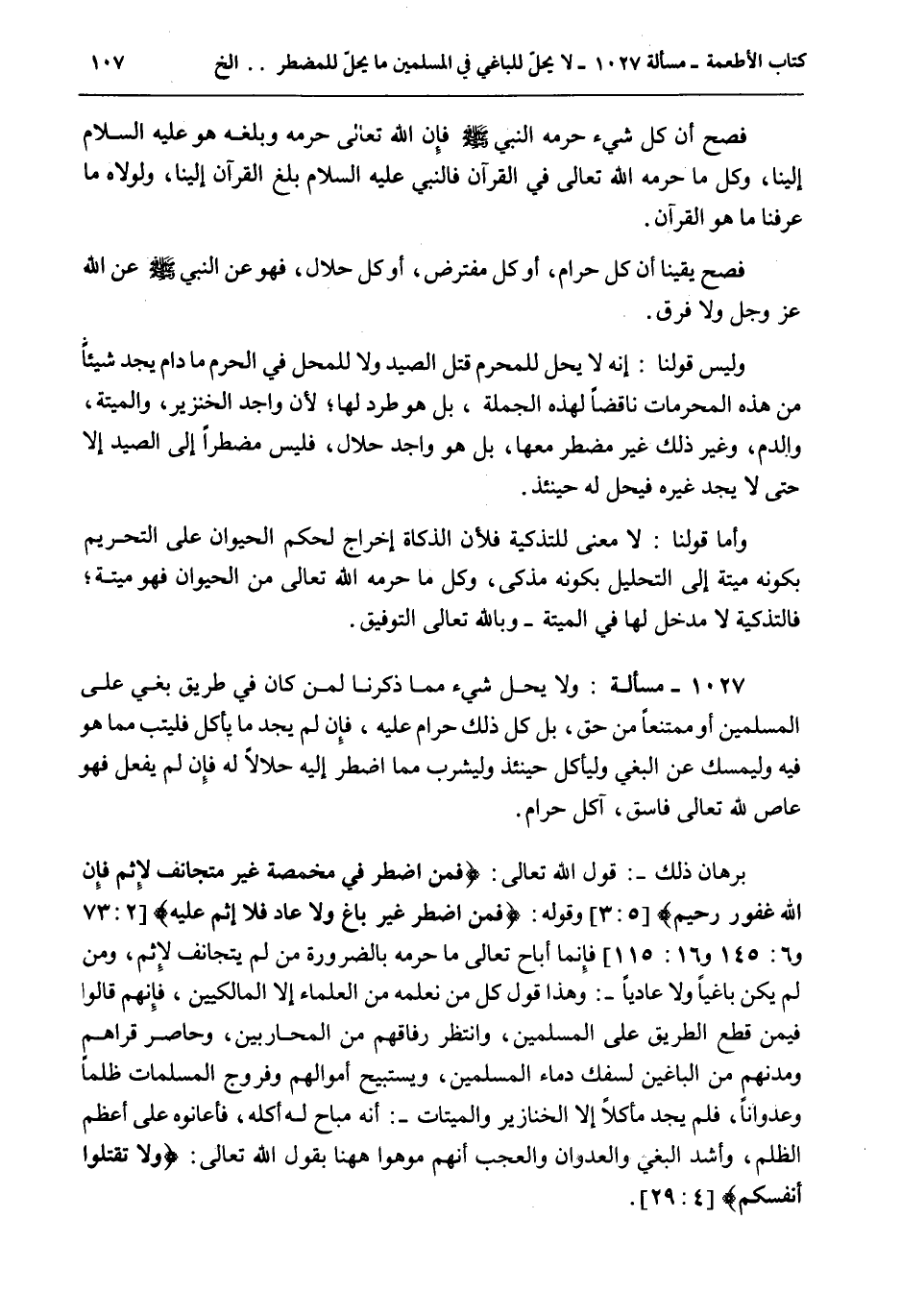 1027 - مَسْأَلَةٌ: وَلَا يَحِلُّ شَيْءٌ مِمَّا ذَكَرْنَا لِمَنْ كَانَ فِي طَرِيقِ بَغْيٍ عَلَى الْمُسْلِمِينَ أَوْ مُمْتَنِعًا مِنْ حَقٍّ، بَلْ كُلُّ ذَلِكَ حَرَامٌ عَلَيْهِ، فَإِنْ لَمْ يَجِدْ مَا يَأْكُلُ فَلْيَتُبْ مِمَّا هُوَ فِيهِ وَلْيُمْسِكْ عَنْ الْبَغْيِ وَلْيَأْكُلْ حِينَئِذٍ وَلْيَشْرَبْ مِمَّا اُضْطُرَّ إلَيْهِ حَلَالًا لَهُ فَإِنْ لَمْ يَفْعَلْ فَهُوَ عَاصٍ لِلَّهِ تَعَالَى فَاسِقٌ، آكِلُ حَرَامٍ. بُرْهَانُ ذَلِكَ -: قَوْلُ اللَّهِ تَعَالَى: {فَمَنِ اضْطُرَّ فِي مَخْمَصَةٍ غَيْرَ مُتَجَانِفٍ لإِثْمٍ فَإِنَّ اللَّهَ غَفُورٌ رَحِيمٌ} [المائدة: 3] وَقَوْلُهُ: {فَمَنِ اضْطُرَّ غَيْرَ بَاغٍ وَلا عَادٍ فَلا إِثْمَ عَلَيْهِ} [البقرة: 173] فَإِنَّمَا أَبَاحَ تَعَالَى مَا حَرَّمَهُ بِالضَّرُورَةِ مَنْ لَمْ يَتَجَانَفْ لِإِثْمٍ، وَمَنْ لَمْ يَكُنْ بَاغِيًا وَلَا عَادِيًا -: وَهَذَا قَوْلُ كُلِّ مَنْ نَعْلَمُهُ مِنْ الْعُلَمَاءِ إلَّا الْمَالِكِيِّينَ، فَإِنَّهُمْ قَالُوا فِيمَنْ قَطَعَ الطَّرِيقَ عَلَى الْمُسْلِمِينَ، وَانْتَظَرَ رِفَاقَهُمْ مِنْ الْمُحَارِبِينَ، وَحَاصَرَ قُرَاهُمْ وَمَدَنَهُمْ مِنْ الْبَاغِينَ لِسَفْكِ دِمَاءِ الْمُسْلِمِينَ، وَيَسْتَبِيحُ أَمْوَالَهُمْ وَفُرُوجَ الْمُسْلِمَاتِ ظُلْمًا وَعُدْوَانًا، فَلَمْ يَجِدْ مَأْكَلًا إلَّا الْخَنَازِيرَ وَالْمَيْتَاتِ -: أَنَّهُ مُبَاحٌ لَهُ أَكْلُهُ، فَأَعَانُوهُ عَلَى أَعْظَمِ الظُّلْمِ، وَأَشَدِّ الْبَغْيِ وَالْعُدْوَانِ وَالْعَجَبُ أَنَّهُمْ مَوَّهُوا هَهُنَا بِقَوْلِ اللَّهِ تَعَالَى: {وَلا تَقْتُلُوا أَنْفُسَكُمْ} [النساء: 29] .