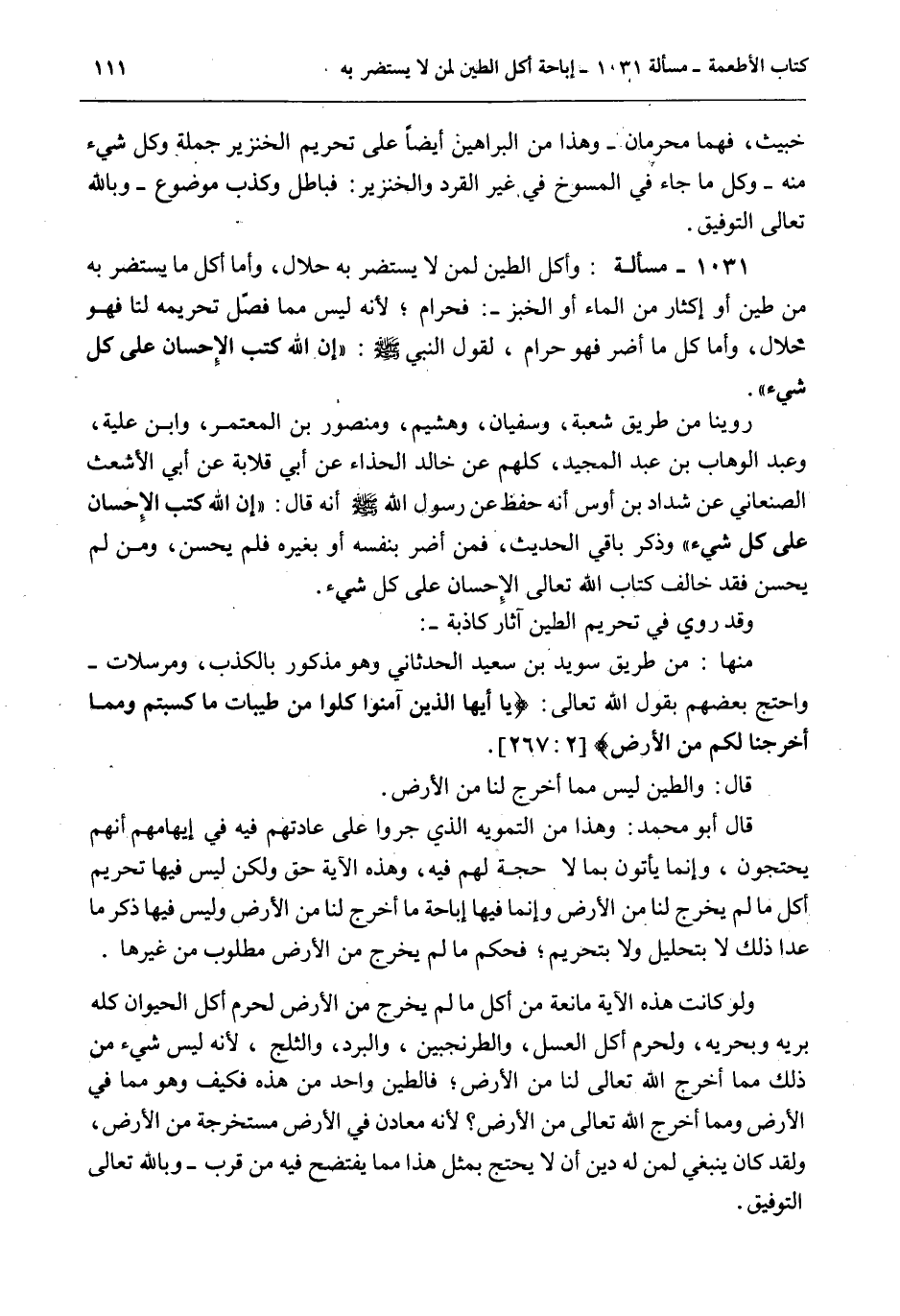 1031 - مَسْأَلَةٌ: وَأَكْلُ الطِّينِ لِمَنْ لَا يَسْتَضِرُّ بِهِ حَلَالٌ، وَأَمَّا أَكْلُ مَا يَسْتَضِرُّ بِهِ مِنْ طِينٍ أَوْ إكْثَارٍ مِنْ الْمَاءِ أَوْ الْخُبْزِ -: فَحَرَامٌ؛ لِأَنَّهُ لَيْسَ مِمَّا فَصَّلَ تَحْرِيمَهُ لَنَا فَهُوَ حَلَالٌ، وَأَمَّا كُلُّ مَا أَضَرَّ فَهُوَ حَرَامٌ، لِقَوْلِ النَّبِيِّ - صَلَّى اللَّهُ عَلَيْهِ وَسَلَّمَ -: «إنَّ اللَّهَ كَتَبَ الْإِحْسَانَ عَلَى كُلِّ شَيْءٍ» . رُوِّينَا مِنْ طَرِيقِ شُعْبَةَ، وَسُفْيَانَ، وَهُشَيْمٍ، وَمَنْصُورِ بْنِ الْمُعْتَمِرِ، وَابْنِ عُلَيَّةَ، وَعَبْدِ الْوَهَّابِ بْنِ عَبْدِ الْمَجِيدِ، كُلُّهُمْ عَنْ خَالِدٍ الْحَذَّاءِ عَنْ أَبِي قِلَابَةَ عَنْ أَبِي الْأَشْعَثِ الصَّنْعَانِيِّ عَنْ شَدَّادِ بْنِ أَوْسٍ أَنَّهُ حَفِظَ عَنْ رَسُولِ اللَّهِ - صَلَّى اللَّهُ عَلَيْهِ وَسَلَّمَ - أَنَّهُ قَالَ: «إنَّ اللَّهَ كَتَبَ الْإِحْسَانَ عَلَى كُلِّ شَيْءٍ» وَذَكَرَ بَاقِيَ الْحَدِيثِ، فَمَنْ أَضَرَّ بِنَفْسِهِ أَوْ بِغَيْرِهِ فَلَمْ يُحْسِنْ، وَمَنْ لَمْ يُحْسِنْ فَقَدْ خَالَفَ كِتَابَ اللَّهِ تَعَالَى الْإِحْسَانَ عَلَى كُلِّ شَيْءٍ. وَقَدْ رُوِيَ فِي تَحْرِيمِ الطِّينِ آثَارٌ كَاذِبَةٌ -: مِنْهَا: مِنْ طَرِيقِ سُوَيْد بْنِ سَعِيدٍ الْحَدَثَانِيِّ وَهُوَ مَذْكُورٌ بِالْكَذِبِ، وَمُرْسَلَاتٌ - وَاحْتَجَّ بَعْضُهُمْ بِقَوْلِ اللَّهِ تَعَالَى: {يَا أَيُّهَا الَّذِينَ آمَنُوا أَنْفِقُوا مِنْ طَيِّبَاتِ مَا كَسَبْتُمْ وَمِمَّا أَخْرَجْنَا لَكُمْ مِنَ الأَرْضِ} [البقرة: 267] . قَالَ: وَالطِّينُ لَيْسَ مِمَّا أَخْرَجَ لَنَا مِنْ الْأَرْضِ. قَالَ أَبُو مُحَمَّدٍ: وَهَذَا مِنْ التَّمْوِيهِ الَّذِي جَرَوْا عَلَى عَادَتِهِمْ فِيهِ فِي إيهَامِهِمْ أَنَّهُمْ يَحْتَجُّونَ، وَإِنَّمَا يَأْتُونَ بِمَا لَا حُجَّةَ لَهُمْ فِيهِ، وَهَذِهِ الْآيَةُ حَقٌّ وَلَكِنْ لَيْسَ فِيهَا تَحْرِيمُ أَكْلِ مَا لَمْ يُخْرِجْ لَنَا مِنْ الْأَرْضِ وَإِنَّمَا فِيهَا إبَاحَةُ مَا أَخْرَجَ لَنَا مِنْ الْأَرْضِ وَلَيْسَ فِيهَا ذِكْرُ مَا عَدَا ذَلِكَ لَا بِتَحْلِيلٍ وَلَا بِتَحْرِيمٍ؛ فَحُكْمُ مَا لَمْ يَخْرُجْ مِنْ الْأَرْضِ مَطْلُوبٌ مِنْ غَيْرِهَا. وَلَوْ كَانَتْ هَذِهِ الْآيَةُ مَانِعَةً مِنْ أَكْلِ مَا لَمْ يَخْرُجْ مِنْ الْأَرْضِ لَحَرُمَ أَكْلُ الْحَيَوَانِ كُلِّهِ بَرِّيِّهِ وَبَحْرِيِّهِ، وَلَحَرُمَ أَكْلُ الْعَسَلِ، والطرنجبين، وَالْبَرَدِ، وَالثَّلْجِ، لِأَنَّهُ لَيْسَ شَيْءٌ مِنْ ذَلِكَ مِمَّا أَخْرَجَ اللَّهُ تَعَالَى لَنَا مِنْ الْأَرْضِ؛ فَالطِّينُ وَاحِدٌ مِنْ هَذِهِ فَكَيْفَ وَهُوَ مِمَّا فِي الْأَرْضِ وَمِمَّا أَخْرَجَ اللَّهُ تَعَالَى مِنْ الْأَرْضِ؟ لِأَنَّهُ مَعَادِنُ فِي الْأَرْضِ مُسْتَخْرَجَةً مِنْ الْأَرْضِ، وَلَقَدْ كَانَ يَنْبَغِي لِمَنْ لَهُ دِينٌ أَنْ لَا يَحْتَجَّ بِمِثْلِ هَذَا مِمَّا يَفْتَضِحُ فِيهِ مِنْ قُرْبٍ - وَبِاَللَّهِ تَعَالَى التَّوْفِيقُ.