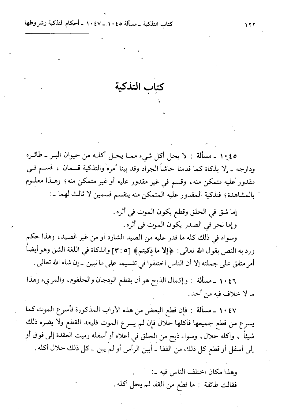 ِ 1045 - مَسْأَلَةٌ: لَا يَحِلُّ أَكْلُ شَيْءٍ مِمَّا يَحِلُّ أَكْلُهُ مِنْ حَيَوَانِ الْبَرِّ - طَائِرُهُ وَدَارِجُهُ - إلَّا بِذَكَاةٍ كَمَا قَدَّمْنَا حَاشَا الْجَرَادِ وَقَدْ بَيَّنَّا أَمْرَهُ وَالتَّذْكِيَةُ قِسْمَانِ، قِسْمٌ فِي مَقْدُورٍ عَلَيْهِ مُتَمَكِّنٌ مِنْهُ، وَقِسْمٌ فِي غَيْرِ مَقْدُورٍ عَلَيْهِ أَوْ غَيْرِ مُتَمَكِّنٍ مِنْهُ؛ وَهَذَا مَعْلُومٌ بِالْمُشَاهَدَةِ؛ فَتَذْكِيَةُ الْمَقْدُورِ عَلَيْهِ الْمُتَمَكِّنِ مِنْهُ يَنْقَسِمُ قِسْمَيْنِ لَا ثَالِثَ لَهُمَا -: إمَّا شَقٌّ فِي الْحَلْقِ وَقَطْعٌ يَكُونُ الْمَوْتُ فِي أَثَرِهِ. وَإِمَّا نَحْرٌ فِي الصَّدْرِ يَكُونُ الْمَوْتُ فِي أَثَرِهِ. وَسَوَاءٌ فِي ذَلِكَ كُلِّهِ مَا قَدَرَ عَلَيْهِ مِنْ الصَّيْدِ الشَّارِدِ أَوْ مِنْ غَيْرِ الصَّيْدِ، وَهَذَا حُكْمٌ وَرَدَ بِهِ النَّصُّ بِقَوْلِ اللَّهِ تَعَالَى: {إِلا مَا ذَكَّيْتُمْ} [المائدة: 3] وَالذَّكَاةُ فِي اللُّغَةِ الشَّقُّ وَهُوَ أَيْضًا أَمْرٌ مُتَّفَقٌ عَلَى جُمْلَتِهِ إلَّا أَنَّ النَّاسَ اخْتَلَفُوا فِي تَقْسِيمِهِ عَلَى مَا نُبَيِّنُ - إنْ شَاءَ اللَّهُ تَعَالَى.