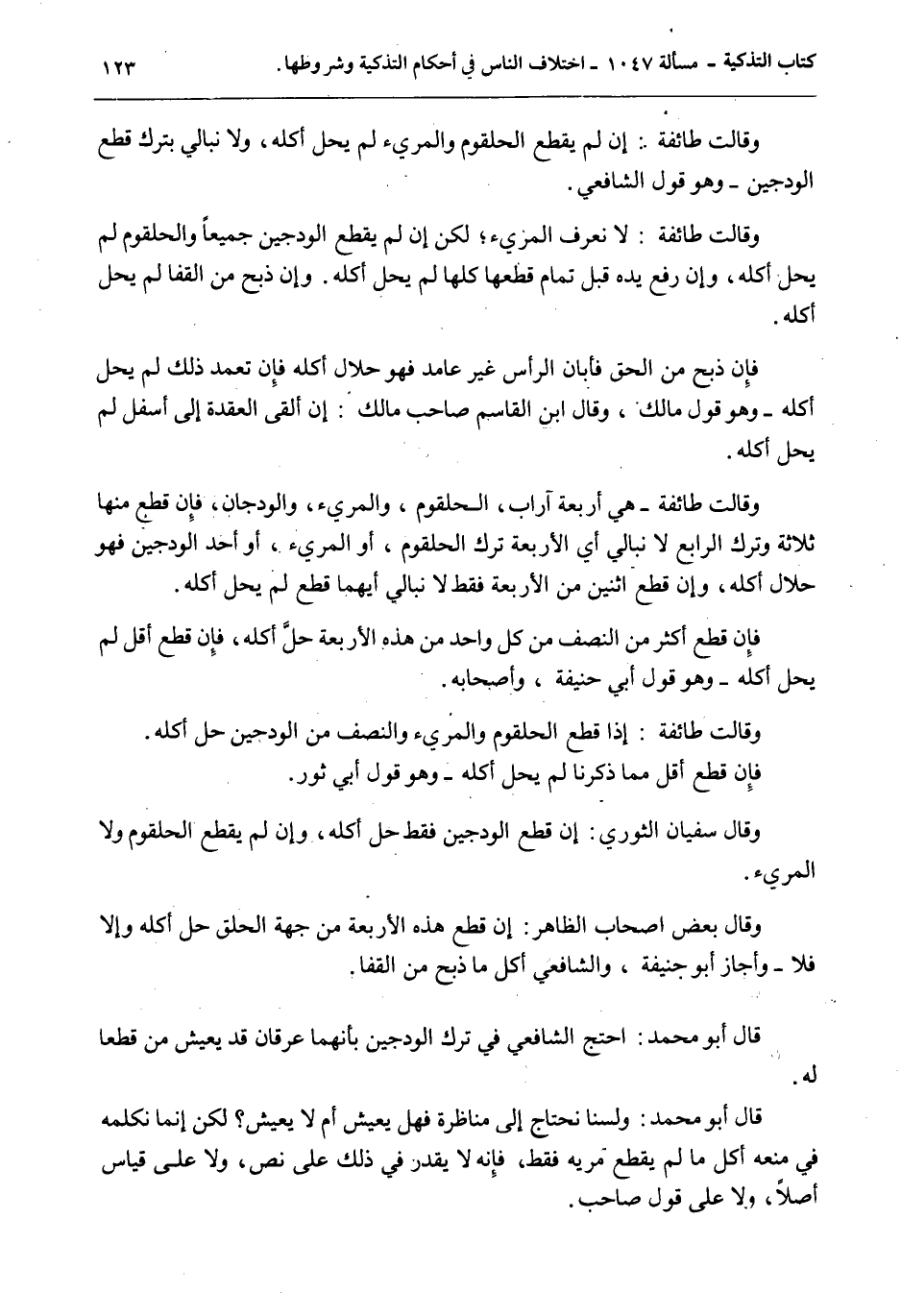 وَقَالَتْ طَائِفَةٌ: إنْ لَمْ يَقْطَعْ الْحُلْقُومَ وَالْمَرِيءَ لَمْ يَحِلَّ أَكْلُهُ، وَلَا نُبَالِي بِتَرْكِ قَطْعِ الْوَدَجَيْنِ - وَهُوَ قَوْلُ الشَّافِعِيِّ. وَقَالَتْ طَائِفَةٌ: لَا نَعْرِفُ الْمَرِيءَ؛ لَكِنْ إنْ لَمْ يَقْطَعْ الْوَدَجَيْنِ جَمِيعًا وَالْحُلْقُومَ لَمْ يَحِلَّ أَكْلُهُ، وَإِنْ رَفَعَ يَدَهُ قَبْلَ تَمَامِ قَطْعِهَا كُلِّهَا لَمْ يَحِلَّ أَكْلُهُ. وَإِنْ ذَبَحَ مِنْ الْقَفَا لَمْ يَحِلَّ أَكْلُهُ. فَإِنْ ذَبَحَ مِنْ الْحَلْقِ فَأَبَانَ الرَّأْسَ غَيْرَ عَامِدٍ فَهُوَ حَلَالٌ أَكْلُهُ فَإِنْ تَعَمَّدَ ذَلِكَ لَمْ يَحِلَّ أَكْلُهُ - وَهُوَ قَوْلُ مَالِكٍ، وَقَالَ ابْنُ الْقَاسِمِ صَاحِبُ مَالِكٍ: إنْ أَلْقَى الْعُقْدَةَ إلَى أَسْفَلَ لَمْ يَحِلَّ أَكْلُهُ. وَقَالَتْ طَائِفَةٌ - هِيَ أَرْبَعَةُ آرَابٍ، الْحُلْقُومُ، وَالْمَرِيءُ، وَالْوَدَجَانِ، فَإِنْ قَطَعَ مِنْهَا ثَلَاثَةً وَتَرَكَ الرَّابِعَ لَا نُبَالِي أَيَّ الْأَرْبَعَةِ تَرَكَ الْحُلْقُومَ، أَوْ الْمَرِيءَ أَوْ أَحَدَ الْوَدَجَيْنِ فَهُوَ حَلَالٌ أَكْلُهُ، وَإِنْ قَطَعَ اثْنَيْنِ مِنْ الْأَرْبَعَةِ فَقَطْ لَا نُبَالِي أَيُّهُمَا قَطَعَ لَمْ يَحِلَّ أَكْلُهُ. فَإِنْ قَطَعَ أَكْثَرَ مِنْ النِّصْفِ مِنْ كُلِّ وَاحِدٍ مِنْ هَذِهِ الْأَرْبَعَةِ حَلَّ أَكْلُهُ، فَإِنْ قَطَعَ أَقَلَّ لَمْ يَحِلَّ أَكْلُهُ - وَهُوَ قَوْلُ أَبِي حَنِيفَةَ وَأَصْحَابِهِ. وَقَالَتْ طَائِفَةٌ: إذَا قَطَعَ الْحُلْقُومَ وَالْمَرِيءَ وَالنِّصْفَ مِنْ الْوَدَجَيْنِ حَلَّ أَكْلُهُ. فَإِنْ قَطَعَ أَقَلَّ مِمَّا ذَكَرْنَا لَمْ يَحِلَّ أَكْلُهُ - وَهُوَ قَوْلُ أَبِي ثَوْرٍ. وَقَالَ سُفْيَانُ الثَّوْرِيُّ: إنْ قَطَعَ الْوَدَجَيْنِ فَقَطْ حَلَّ أَكْلُهُ، وَإِنْ لَمْ يَقْطَعْ الْحُلْقُومَ وَلَا الْمَرِيءَ. وَقَالَ بَعْضُ أَصْحَابِ الظَّاهِرِ: إنْ قَطَعَ هَذِهِ الْأَرْبَعَةَ مِنْ جِهَةِ الْحَلْقِ حَلَّ أَكْلُهُ وَإِلَّا فَلَا - وَأَجَازَ أَبُو حَنِيفَةَ، وَالشَّافِعِيُّ أَكْلُ مَا ذُبِحَ مِنْ الْقَفَا. قَالَ أَبُو مُحَمَّدٍ: احْتَجَّ الشَّافِعِيُّ فِي تَرْكِ الْوَدَجَيْنِ بِأَنَّهُمَا عِرْقَانِ قَدْ يَعِيشُ مَنْ قُطِعَا لَهُ. قَالَ أَبُو مُحَمَّدٍ: وَلَسْنَا نَحْتَاجُ إلَى مُنَاظَرَةٍ فَهَلْ يَعِيشُ أَمْ لَا يَعِيشُ؟ لَكِنْ إنَّمَا نُكَلِّمُهُ فِي مَنْعِهِ أَكُلُّ مَا لَمْ يُقْطَعْ مَرِيئُهُ فَقَطْ، فَإِنَّهُ لَا يَقْدِرُ فِي ذَلِكَ عَلَى نَصٍّ، وَلَا عَلَى قِيَاسٍ أَصْلًا، وَلَا عَلَى قَوْلِ صَاحِبٍ.