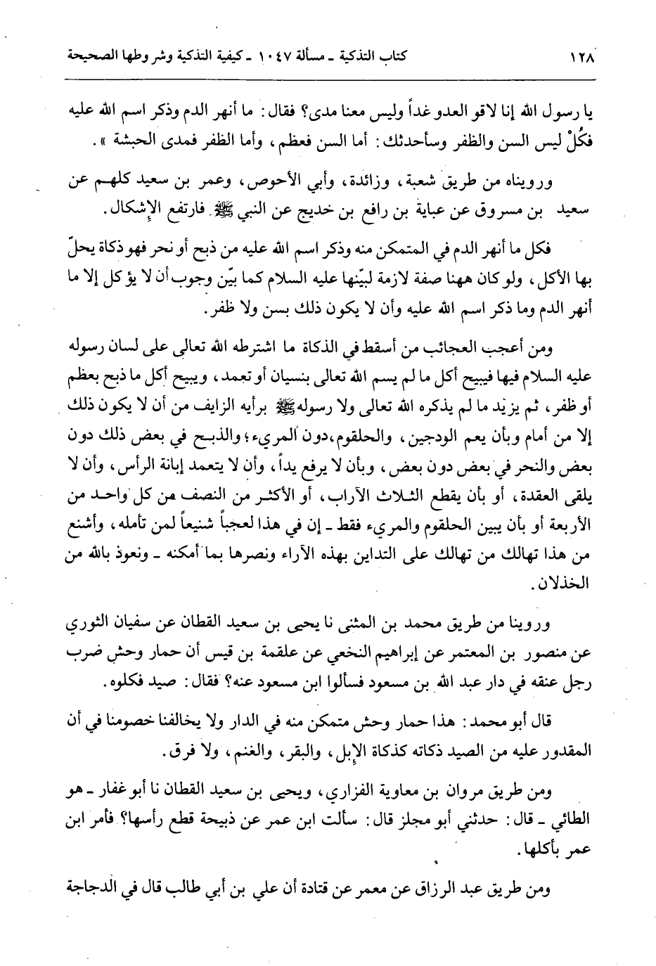 يَا رَسُولَ اللَّهِ إنَّا لَاقُو الْعَدُوِّ غَدًا وَلَيْسَ مَعَنَا مُدًى؟ فَقَالَ: مَا أَنْهَرَ الدَّمَ وَذُكِرَ اسْمُ اللَّهِ عَلَيْهِ فَكُلْ لَيْسَ السِّنَّ وَالظُّفُرَ وَسَأُحَدِّثُكَ: أَمَّا السِّنُّ فَعَظْمٌ، وَأَمَّا الظُّفُرُ فَمُدَى الْحَبَشَةِ» . وَرُوِّينَاهُ مِنْ طَرِيقِ شُعْبَةَ، وَزَائِدَةَ، وَأَبِي الْأَحْوَصِ، وَعَمْرِ بْنِ سَعِيدٍ كُلُّهُمْ عَنْ سَعِيدِ بْنِ مَسْرُوقٍ عَنْ عَبَايَةَ بْنِ رَافِعِ بْنِ خَدِيجٍ عَنْ النَّبِيِّ - صَلَّى اللَّهُ عَلَيْهِ وَسَلَّمَ - فَارْتَفَعَ الْإِشْكَالُ. فَكُلُّ مَا أَنْهَرَ الدَّمَ فِي الْمُتَمَكَّنِ مِنْهُ وَذُكِرَ اسْمُ اللَّهِ عَلَيْهِ مِنْ ذَبْحٍ أَوْ نَحْرٍ فَهُوَ ذَكَاةٌ يَحِلُّ بِهَا الْأَكْلُ، وَلَوْ كَانَ هَهُنَا صِفَةٌ لَازِمَةٌ لَبَيَّنَهَا - عَلَيْهِ السَّلَامُ - كَمَا بَيَّنَ وُجُوبَ أَنْ لَا يُؤْكَلَ إلَّا مَا أَنْهَرَ الدَّمَ وَمَا ذُكِرَ اسْمُ اللَّهِ عَلَيْهِ وَأَنْ لَا يَكُونَ ذَلِكَ بِسِنٍّ وَلَا ظُفْرٍ. وَمِنْ أَعْجَبْ الْعَجَائِبِ مَنْ أَسْقَطَ فِي الذَّكَاةِ مَا اشْتَرَطَهُ اللَّهُ تَعَالَى عَلَى لِسَانِ رَسُولِهِ - عَلَيْهِ السَّلَامُ - فِيهَا فَيُبِيحُ أَكْلَ مَا لَمْ يُسَمِّ اللَّهَ تَعَالَى بِنِسْيَانٍ أَوْ تَعَمُّدٍ، وَيُبِيحُ أَكْلَ مَا ذُبِحَ بِعَظْمٍ أَوْ ظُفْرٍ، ثُمَّ يَزِيدُ مَا لَمْ يَذْكُرْهُ اللَّهُ تَعَالَى وَلَا رَسُولُهُ - صَلَّى اللَّهُ عَلَيْهِ وَسَلَّمَ - بِرَأْيِهِ الزَّائِفِ مِنْ أَنْ لَا يَكُونَ ذَلِكَ إلَّا مِنْ أَمَامَ وَبِأَنْ يَعُمَّ الْوَدَجَيْنِ، وَالْحُلْقُومَ، دُونَ الْمَرِيءِ؛ وَالذَّبْحُ فِي بَعْضِ ذَلِكَ دُونَ بَعْضٍ وَالنَّحْرُ فِي بَعْضٍ دُونَ بَعْضٍ، وَبِأَنْ لَا يَرْفَعَ يَدًا، وَأَنْ لَا يَتَعَمَّدَ إبَانَةَ الرَّأْسِ، وَأَنْ لَا يُلْقِيَ الْعُقْدَةَ، أَوْ بِأَنْ يَقْطَعَ الثَّلَاثَ الْآرَابَ، أَوْ الْأَكْثَرَ مِنْ النِّصْفِ مِنْ كُلِّ وَاحِدٍ مِنْ الْأَرْبَعَةِ أَوْ بِأَنْ يُبَيِّنَ الْحُلْقُومَ وَالْمَرِيءَ فَقَطْ - إنَّ فِي هَذَا لَعَجَبًا شَنِيعًا لِمَنْ تَأَمَّلَهُ، وَأَشْنَعُ مِنْ هَذَا تَهَالُكُ مَنْ تَهَالَكَ عَلَى التَّدَايُنِ بِهَذِهِ الْآرَاءِ وَنَصْرِهَا بِمَا أَمْكَنَهُ - وَنَعُوذُ بِاَللَّهِ مِنْ الْخِذْلَانِ. وَرُوِّينَا مِنْ طَرِيقِ مُحَمَّدِ بْنِ الْمُثَنَّى نا يَحْيَى بْنُ سَعِيدٍ الْقَطَّانُ عَنْ سُفْيَانَ الثَّوْرِيِّ عَنْ مَنْصُورِ بْنِ الْمُعْتَمِرِ عَنْ إبْرَاهِيمَ النَّخَعِيِّ عَنْ عَلْقَمَةَ بْنِ قَيْسٍ أَنَّ حِمَارَ وَحْشٍ ضَرَبَ رَجُلٌ عُنُقَهُ فِي دَارِ عَبْدِ اللَّهِ بْنِ مَسْعُودٍ فَسَأَلُوا ابْنَ مَسْعُودٍ عَنْهُ؟ فَقَالَ: صَيْدٌ فَكُلُوهُ. قَالَ أَبُو مُحَمَّدٍ: هَذَا حِمَارُ وَحْشٍ مُتَمَكَّنٌ مِنْهُ فِي الدَّارِ وَلَا يُخَالِفُنَا خُصُومُنَا فِي أَنَّ الْمَقْدُورَ عَلَيْهِ مِنْ الصَّيْدِ ذَكَاتُهُ كَذَكَاةِ الْإِبِلِ، وَالْبَقَرِ، وَالْغَنَمِ، وَلَا فَرْقَ. وَمِنْ طَرِيقِ مَرْوَانَ بْنِ مُعَاوِيَةَ الْفَزَارِيّ، وَيَحْيَى بْنِ سَعِيدٍ الْقَطَّانِ نا أَبُو غِفَارٍ - هُوَ الطَّائِيُّ - قَالَ: حَدَّثَنِي أَبُو مِجْلَزٍ قَالَ: سَأَلْت ابْنَ عُمَرَ عَنْ ذَبِيحَةٍ قُطِعَ رَأْسُهَا؟ فَأَمَرَ ابْنُ عُمَرَ بِأَكْلِهَا. وَمِنْ طَرِيقِ عَبْدِ الرَّزَّاقِ عَنْ مَعْمَرٍ عَنْ قَتَادَةَ أَنَّ عَلِيَّ بْنَ أَبِي طَالِبٍ قَالَ فِي الدَّجَاجَةِ