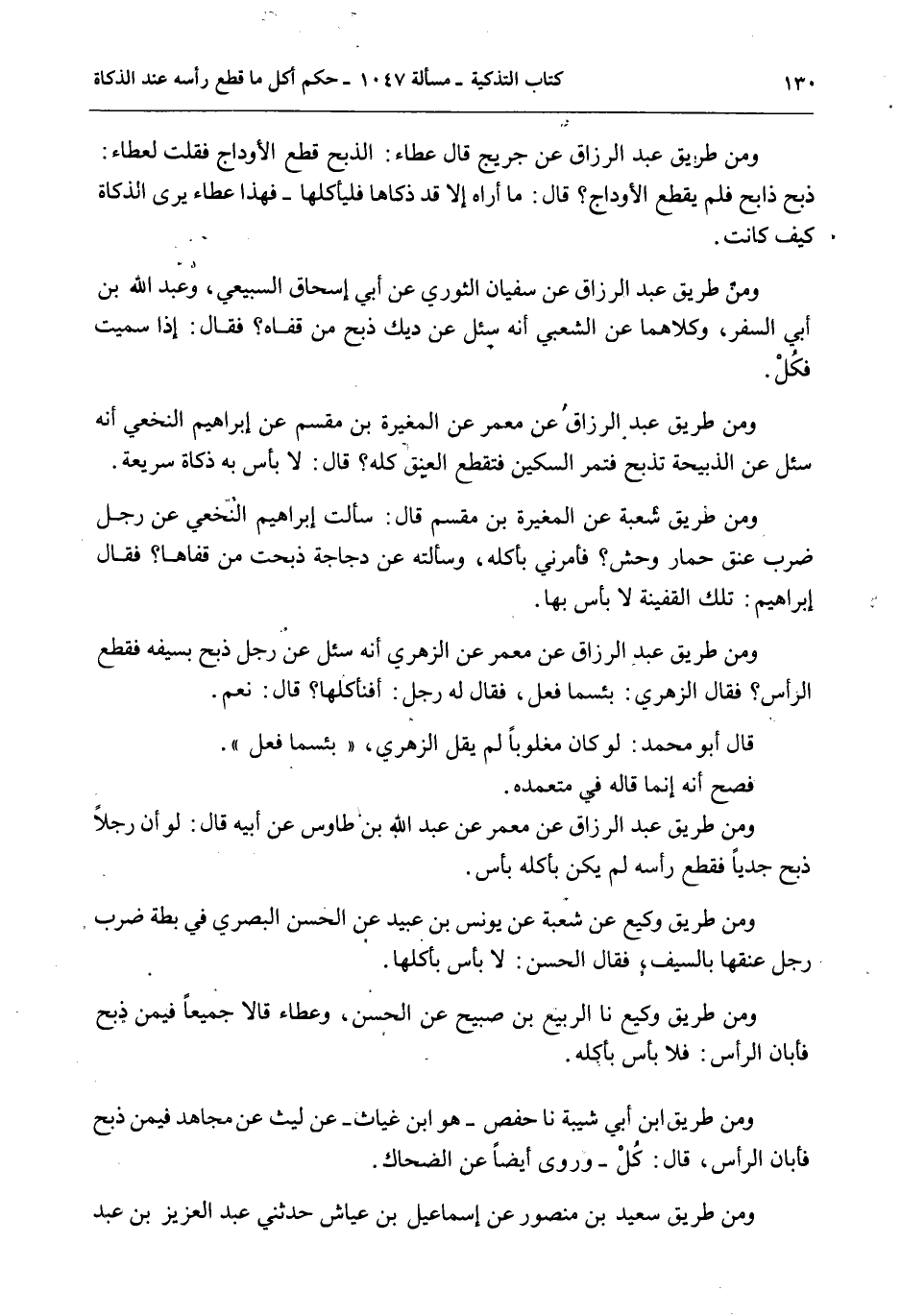 وَمِنْ طَرِيقِ عَبْدِ الرَّزَّاقِ عَنْ جُرَيْجٍ قَالَ عَطَاءٌ: الذَّبْحُ قَطْعُ الْأَوْدَاجِ فَقُلْت لِعَطَاءٍ: ذَبَحَ ذَابِحٌ فَلَمْ يَقْطَعْ الْأَوْدَاجَ؟ قَالَ: مَا أَرَاهُ إلَّا قَدْ ذَكَّاهَا فَلْيَأْكُلْهَا - فَهَذَا عَطَاءٌ يَرَى الذَّكَاةَ كَيْفَ كَانَتْ. وَمِنْ طَرِيقِ عَبْدِ الرَّزَّاقِ عَنْ سُفْيَانَ الثَّوْرِيِّ عَنْ أَبِي إِسْحَاقَ السَّبِيعِيِّ، وَعَبْدِ اللَّهِ بْنِ أَبِي السَّفَرِ، وَكِلَاهُمَا عَنْ الشَّعْبِيِّ أَنَّهُ سُئِلَ عَنْ دِيكٍ ذُبِحَ مِنْ قَفَاهُ؟ فَقَالَ: إذَا سَمَّيْت فَكُلْ. وَمِنْ طَرِيقِ عَبْدِ الرَّزَّاقِ عَنْ مَعْمَرٍ عَنْ الْمُغِيرَةِ بْنِ مِقْسَمٍ عَنْ إبْرَاهِيمَ النَّخَعِيِّ أَنَّهُ سُئِلَ عَنْ الذَّبِيحَةِ تُذْبَحُ فَتَمُرُّ السِّكِّينُ فَتَقْطَعُ الْعُنُقَ كُلَّهُ؟ قَالَ: لَا بَأْسَ بِهِ ذَكَاةٌ سَرِيعَةٌ. وَمِنْ طَرِيقِ شُعْبَةَ عَنْ الْمُغِيرَةِ بْنِ مِقْسَمٍ قَالَ: سَأَلْت إبْرَاهِيمَ النَّخَعِيّ عَنْ رَجُلٍ ضَرَبَ عُنُقَ حِمَارٍ وَحْشٍ؟ فَأَمَرَنِي بِأَكْلِهِ، وَسَأَلْته عَنْ دَجَاجَةٍ ذُبِحَتْ مِنْ قَفَاهَا؟ فَقَالَ إبْرَاهِيمُ: تِلْكَ الْقَفِينَةُ لَا بَأْسَ بِهَا. وَمِنْ طَرِيقِ عَبْدِ الرَّزَّاقِ عَنْ مَعْمَرٍ عَنْ الزُّهْرِيِّ أَنَّهُ سُئِلَ عَنْ رَجُلٍ ذَبَحَ بِسَيْفِهِ فَقَطَعَ الرَّأْسَ؟ فَقَالَ الزُّهْرِيُّ: بِئْسَمَا فَعَلَ، فَقَالَ لَهُ رَجُلٌ: أَفَنَأْكُلُهَا؟ قَالَ: نَعَمْ. قَالَ أَبُو مُحَمَّدٍ: لَوْ كَانَ مَغْلُوبًا لَمْ يَقُلْ الزُّهْرِيُّ، " بِئْسَمَا فَعَلَ ". فَصَحَّ أَنَّهُ إنَّمَا قَالَهُ فِي مُتَعَمَّدِهِ. وَمِنْ طَرِيقِ عَبْدِ الرَّزَّاقِ عَنْ مَعْمَرٍ عَنْ عَبْدِ اللَّهِ بْنِ طَاوُسٍ عَنْ أَبِيهِ قَالَ: لَوْ أَنَّ رَجُلًا ذَبَحَ جَدْيًا فَقَطَعَ رَأْسَهُ لَمْ يَكُنْ بِأَكْلِهِ بَأْسٌ. وَمِنْ طَرِيقِ وَكِيعٍ عَنْ شُعْبَةَ عَنْ يُونُسَ بْنِ عُبَيْدٍ عَنْ الْحَسَنِ الْبَصْرِيِّ فِي بَطَّةٌ ضَرَبَ رَجُلٌ عُنُقَهَا بِالسَّيْفِ، فَقَالَ الْحَسَنُ: لَا بَأْسَ بِأَكْلِهَا. وَمِنْ طَرِيقِ وَكِيعٍ نا الرَّبِيعُ بْنُ صُبَيْحٍ عَنْ الْحَسَنِ، وَعَطَاءٍ قَالَا جَمِيعًا فِيمَنْ ذَبَحَ فَأَبَانَ الرَّأْسَ: فَلَا بَأْسَ بِأَكْلِهِ. وَمِنْ طَرِيقِ ابْنِ أَبِي شَيْبَةَ نا حَفْصٌ - هُوَ ابْنُ غِيَاثٍ - عَنْ لَيْثٍ عَنْ مُجَاهِدٍ فِيمَنْ ذَبَحَ فَأَبَانَ الرَّأْسَ، قَالَ: كُلْ - وَرَوَى أَيْضًا عَنْ الضَّحَّاكِ وَمِنْ طَرِيقِ سَعِيدِ بْنِ مَنْصُورٍ عَنْ إسْمَاعِيلَ بْنِ عَيَّاشٍ حَدَّثَنِي عَبْدُ الْعَزِيزِ بْنُ عَبْدِ اللَّهِ