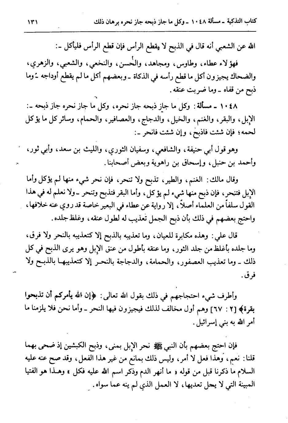 1048 - مَسْأَلَةٌ: وَكُلُّ مَا جَازَ ذَبْحُهُ جَازَ نَحْرُهُ، وَكُلُّ مَا جَازَ نَحْرُهُ جَازَ ذَبْحُهُ -: الْإِبِلُ، وَالْبَقَرُ، وَالْغَنَمُ، وَالْخَيْلُ، وَالدَّجَاجُ، وَالْعَصَافِيرُ، وَالْحَمَامُ، وَسَائِرُ كُلِّ مَا يُؤْكَلُ لَحْمُهُ؛ فَإِنْ شِئْت فَاذْبَحْ، وَإِنْ شِئْت فَانْحَرْ -: وَهُوَ قَوْلُ أَبِي حَنِيفَةَ، وَالشَّافِعِيِّ، وَسُفْيَانَ الثَّوْرِيِّ، وَاللَّيْثِ بْنِ سَعْدٍ، وَأَبِي ثَوْرٍ، وَأَحْمَدَ بْنِ حَنْبَلٍ، وَإِسْحَاقَ بْنِ رَاهْوَيْهِ وَبَعْضُ أَصْحَابِنَا. وَقَالَ مَالِكٌ: الْغَنَمُ، وَالطَّيْرُ، تُذْبَحُ وَلَا تُنْحَرُ، فَإِنْ نُحِرَ شَيْءٌ مِنْهَا لَمْ يُؤْكَلْ وَأَمَّا الْإِبِلُ فَتُنْحَرُ، فَإِنْ ذُبِحَ مِنْهَا شَيْءٌ لَمْ يُؤْكَلْ، وَأَمَّا الْبَقَرُ فَتُذْبَحُ وَتُنْحَرُ - وَلَا نَعْلَمُ لَهُ فِي هَذَا الْقَوْلِ سَلَفًا مِنْ الْعُلَمَاءِ أَصْلًا، إلَّا رِوَايَةً عَنْ عَطَاءٍ فِي الْبَعِيرِ خَاصَّةً قَدْ رُوِيَ عَنْهُ خِلَافُهَا، وَاحْتَجَّ بَعْضُهُمْ فِي ذَلِكَ بِأَنَّ ذَبْحَ الْجَمَلِ تَعْذِيبٌ لَهُ لِطُولِ عُنُقِهِ، وَغِلَظِ جِلْدِهِ. قَالَ عَلِيٌّ: وَهَذِهِ مُكَابَرَةٌ لِلْعِيَانِ، وَمَا تَعْذِيبُهُ بِالذَّبْحِ إلَّا كَتَعْذِيبِهِ بِالنَّحْرِ وَلَا فَرْقَ، وَمَا جِلْدُهُ بِأَغْلَظَ مِنْ جِلْدِ الثَّوْرِ، وَمَا عُنُقُهُ بِأَطْوَلَ مِنْ عُنُقِ الْإِبِلِ وَهُوَ يَرَى الذَّبْحَ فِي كُلِّ ذَلِكَ - وَمَا تَعْذِيبُ الْعُصْفُورِ، وَالْحَمَامَةِ، وَالدَّجَاجَةِ بِالنَّحْرِ إلَّا كَتَعْذِيبِهَا بِالذَّبْحِ وَلَا فَرْقَ. وَأَطْرَفُ شَيْءٍ احْتِجَاجُهُمْ فِي ذَلِكَ بِقَوْلِ اللَّهِ تَعَالَى: {إِنَّ اللَّهَ يَأْمُرُكُمْ أَنْ تَذْبَحُوا بَقَرَةً} [البقرة: 67] وَهُمْ أَوَّلُ مُخَالِفٍ لِذَلِكَ فَيُجِيزُونَ فِيهَا النَّحْرَ - وَأَمَّا نَحْنُ فَلَا يَلْزَمُنَا مَا أَمَرَ اللَّهُ بِهِ بَنِي إسْرَائِيلَ. فَإِنْ احْتَجَّ بَعْضُهُمْ بِأَنَّ «النَّبِيَّ - صَلَّى اللَّهُ عَلَيْهِ وَسَلَّمَ - نَحَرَ الْإِبِلَ بِمِنًى، وَذَبَحَ الْكَبْشَيْنِ إذْ ضَحَّى بِهِمَا» قُلْنَا: نَعَمْ، وَهَذَا فِعْلٌ لَا أَمْرٌ، وَلَيْسَ ذَلِكَ بِمَانِعٍ مِنْ غَيْرِ هَذَا الْفِعْلِ، وَقَدْ صَحَّ عَنْهُ - عَلَيْهِ السَّلَامُ - مَا ذَكَرْنَا قَبْلُ مِنْ قَوْلِهِ «مَا أَنْهَرَ الدَّمَ وَذُكِرَ اسْمُ اللَّهِ عَلَيْهِ فَكُلْ» وَهَذَا هُوَ الْفُتْيَا الْمُبِينَةُ الَّتِي لَا يَحِلُّ تَعَدِّيهَا، لَا الْعَمَلُ الَّذِي لَمْ يُنْهَ عَمَّا سِوَاهُ.