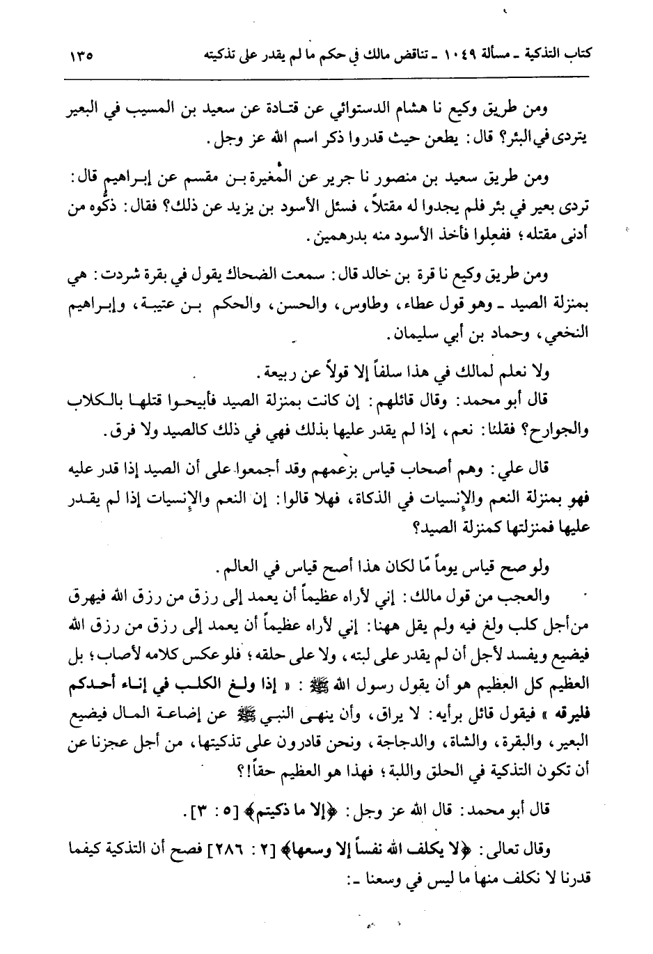 وَمِنْ طَرِيقِ وَكِيعٍ نا هِشَامٌ الدَّسْتُوَائِيُّ عَنْ قَتَادَةَ عَنْ سَعِيدِ بْنِ الْمُسَيِّبِ فِي الْبَعِيرِ يَتَرَدَّى فِي الْبِئْرِ؟ قَالَ: يُطْعَنُ حَيْثُ قَدَرُوا ذِكْرَ اسْمَ اللَّهِ عَزَّ وَجَلَّ. وَمِنْ طَرِيقِ سَعِيدِ بْنِ مَنْصُورٍ نا جَرِيرٌ عَنْ الْمُغِيرَةِ بْنِ مِقْسَمٍ عَنْ إبْرَاهِيمَ قَالَ: تَرَدَّى بَعِيرٌ فِي بِئْرٍ فَلَمْ يَجِدُوا لَهُ مَقْتَلًا فَسُئِلَ الْأَسْوَدُ بْنُ يَزِيدَ عَنْ ذَلِكَ؟ فَقَالَ: ذَكُّوهُ مِنْ أَدْنَى مَقْتَلِهِ؛ فَفَعَلُوا فَأَخَذَ الْأَسْوَدُ مِنْهُ بِدِرْهَمَيْنِ. وَمِنْ طَرِيقِ وَكِيعٍ نا قُرَّةُ بْنُ خَالِدٍ قَالَ: سَمِعْت الضَّحَّاكِ يَقُولُ فِي بَقَرَةٍ شَرَدَتْ: هِيَ بِمَنْزِلَةِ الصَّيْدِ - وَهُوَ قَوْلُ عَطَاءٍ، وَطَاوُسٍ، وَالْحَسَنِ، وَالْحَكَمِ بْنِ عُتَيْبَةَ، وَإِبْرَاهِيمَ النَّخَعِيِّ، وَحَمَّادِ بْنِ أَبِي سُلَيْمَانَ. وَلَا نَعْلَمُ لِمَالِكٍ فِي هَذَا سَلَفًا إلَّا قَوْلًا عَنْ رَبِيعَةَ. قَالَ أَبُو مُحَمَّدٍ: وَقَالَ قَائِلُهُمْ: إنْ كَانَتْ بِمَنْزِلَةِ الصَّيْدِ فَأَبِيحُوا قَتْلَهَا بِالْكِلَابِ وَالْجَوَارِحِ؟ فَقُلْنَا: نَعَمْ، إذَا لَمْ يُقْدَرْ عَلَيْهَا بِذَلِكَ فَهِيَ فِي ذَلِكَ كَالصَّيْدِ وَلَا فَرْقَ. قَالَ عَلِيٌّ: وَهُمْ أَصْحَابُ قِيَاسٍ بِزَعْمِهِمْ وَقَدْ أَجْمَعُوا عَلَى أَنَّ الصَّيْدَ إذَا قُدِرَ عَلَيْهِ فَهُوَ بِمَنْزِلَةِ النَّعَمِ وَالْإِنْسِيَّاتِ فِي الذَّكَاةِ، فَهَلَّا قَالُوا: إنَّ النِّعَمَ وَالْإِنْسِيَّاتِ إذَا لَمْ يُقْدَرْ عَلَيْهَا فَمَنْزِلَتُهَا كَمَنْزِلَةِ الصَّيْدِ؟ وَلَوْ صَحَّ قِيَاسٌ يَوْمًا مَا لَكَانَ هَذَا أَصَحَّ قِيَاسٍ فِي الْعَالَمِ. وَالْعَجَبُ مِنْ قَوْلِ مَالِكٍ: إنِّي لِأَرَاهُ عَظِيمًا أَنْ يُعْمَدَ إلَى رِزْقٍ مِنْ رِزْقِ اللَّهِ فَيُهْرَقَ مِنْ أَجْلِ كَلْبٍ وَلَغَ فِيهِ وَلَمْ يَقُلْ هَهُنَا: إنِّي لِأَرَاهُ عَظِيمًا أَنْ يُعْمَدَ إلَى رِزْقٍ مِنْ رِزْقِ اللَّهِ فَيُضَيَّعَ وَيُفْسَدَ لِأَجْلِ أَنْ لَمْ يَقْدِرْ عَلَى لَبَّتِهِ، وَلَا عَلَى حَلْقِهِ؛ فَلَوْ عُكِسَ كَلَامُهُ لَأَصَابَ؛ بَلْ الْعَظِيمُ كُلُّ الْعَظِيمِ هُوَ أَنْ يَقُولَ رَسُولُ اللَّهِ - صَلَّى اللَّهُ عَلَيْهِ وَسَلَّمَ -: «إذَا وَلَغَ الْكَلْبُ فِي إنَاءِ أَحَدِكُمْ فَلْيُرِقْهُ» فَيَقُولُ قَائِلٌ بِرَأْيِهِ: لَا يُرَاقُ، وَأَنْ يَنْهَى النَّبِيُّ - صَلَّى اللَّهُ عَلَيْهِ وَسَلَّمَ - عَنْ إضَاعَةِ الْمَالِ فَيُضَيَّعُ الْبَعِيرُ، وَالْبَقَرَةُ، وَالشَّاةُ، وَالدَّجَاجَةُ، وَنَحْنُ قَادِرُونَ عَلَى تَذْكِيَتِهَا مِنْ أَجْلِ عَجْزِنَا عَنْ أَنْ تَكُونَ التَّذْكِيَةُ فِي الْحَلْقِ وَاللَّبَّةِ؛ فَهَذَا هُوَ الْعَظِيمُ حَقًّا؟ قَالَ أَبُو مُحَمَّدٍ: قَالَ اللَّهُ عَزَّ وَجَلَّ: {إِلا مَا ذَكَّيْتُمْ} [المائدة: 3] . وَقَالَ تَعَالَى: {لا يُكَلِّفُ اللَّهُ نَفْسًا إِلا وُسْعَهَا} [البقرة: 286] فَصَحَّ أَنَّ التَّذْكِيَةَ كَيْفَمَا قَدَرْنَا لَا نُكَلَّفُ مِنْهَا مَا لَيْسَ فِي وُسْعِنَا -: