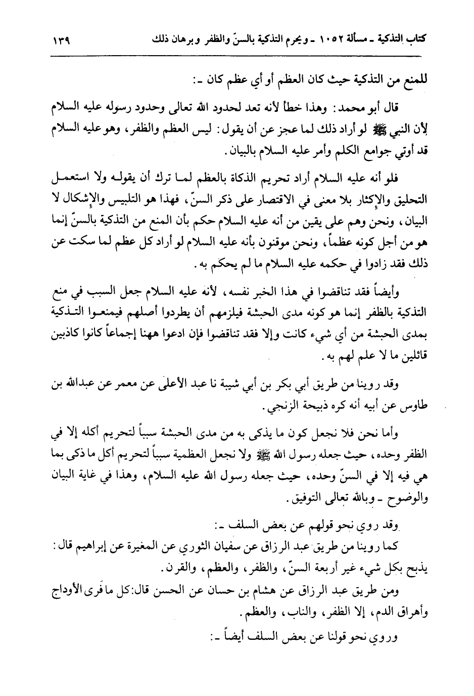 لِلْمَنْعِ مِنْ التَّذْكِيَةِ حَيْثُ كَانَ الْعَظْمُ أَوْ أَيُّ عَظْمٍ كَانَ -: قَالَ أَبُو مُحَمَّدٍ: وَهَذَا خَطَأٌ لِأَنَّهُ تَعَدٍّ لِحُدُودِ اللَّهِ تَعَالَى وَحُدُودِ رَسُولِهِ - عَلَيْهِ السَّلَامُ - لِأَنَّ النَّبِيَّ - صَلَّى اللَّهُ عَلَيْهِ وَسَلَّمَ - لَوْ أَرَادَ ذَلِكَ لَمَا عَجَزَ عَنْ أَنْ يَقُولَ: لَيْسَ الْعَظْمُ وَالظُّفْرُ، وَهُوَ - عَلَيْهِ السَّلَامُ - قَدْ أُوتِيَ جَوَامِعَ الْكَلِمِ وَأُمِرَ - عَلَيْهِ السَّلَامُ - بِالْبَيَانِ. فَلَوْ أَنَّهُ - عَلَيْهِ السَّلَامُ - أَرَادَ تَحْرِيمَ الذَّكَاةِ بِالْعَظْمِ لَمَا تَرَكَ أَنْ يَقُولَهُ وَلَا اسْتَعْمَلَ التَّحْلِيقَ وَالْإِكْثَارَ بِلَا مَعْنَى فِي الِاقْتِصَارِ عَلَى ذِكْرِ السِّنِّ، فَهَذَا هُوَ التَّلْبِيسُ وَالْإِشْكَالُ لَا الْبَيَانُ، وَنَحْنُ وَهُمْ عَلَى يَقِينٍ مِنْ أَنَّهُ - عَلَيْهِ السَّلَامُ - حَكَمَ بِأَنَّ الْمَنْعَ مِنْ التَّذْكِيَةِ بِالسِّنِّ إنَّمَا هُوَ مِنْ أَجْلِ كَوْنِهِ عَظْمًا، وَنَحْنُ مُوقِنُونَ بِأَنَّهُ - عَلَيْهِ السَّلَامُ - لَوْ أَرَادَ كُلَّ عَظْمٍ لَمَا سَكَتَ عَنْ ذَلِكَ فَقَدْ زَادُوا فِي حُكْمِهِ - عَلَيْهِ السَّلَامُ - مَا لَمْ يَحْكُمْ بِهِ. وَأَيْضًا فَقَدْ تَنَاقَضُوا فِي هَذَا الْخَبَرِ نَفْسِهِ، لِأَنَّهُ - عَلَيْهِ السَّلَامُ - جَعَلَ السَّبَبَ فِي مَنْعِ التَّذْكِيَةِ بِالظُّفْرِ إنَّمَا هُوَ كَوْنُهُ مُدَى الْحَبَشَةِ فَيَلْزَمُهُمْ أَنْ يَطْرُدُوا أَصْلَهُمْ فَيَمْنَعُوا التَّذْكِيَةَ بِمُدَى الْحَبَشَةِ مِنْ أَيِّ شَيْءٍ كَانَتْ وَإِلَّا فَقَدْ تَنَاقَضُوا فَإِنْ ادَّعَوْا هَهُنَا إجْمَاعًا كَانُوا كَاذِبِينَ قَائِلِينَ مَا لَا عِلْمَ لَهُمْ بِهِ. وَقَدْ رُوِّينَا مِنْ طَرِيقِ أَبِي بَكْرِ بْنِ أَبِي شَيْبَةَ نا عَبْدُ الْأَعْلَى عَنْ مَعْمَرٍ عَنْ عَبْدِ اللَّهِ بْنِ طَاوُسٍ عَنْ أَبِيهِ أَنَّهُ كَرِهَ ذَبِيحَةَ الزِّنْجِيِّ. وَأَمَّا نَحْنُ فَلَا نَجْعَلُ كَوْنَ مَا يُذَكَّى بِهِ مِنْ مُدَى الْحَبَشَةِ سَبَبًا لِتَحْرِيمِ أَكْلِهِ إلَّا فِي الظُّفْرِ وَحْدَهُ، حَيْثُ جَعَلَهُ رَسُولُ اللَّهِ - صَلَّى اللَّهُ عَلَيْهِ وَسَلَّمَ - وَلَا نَجْعَلُ الْعَظْمِيَّةَ سَبَبًا لِتَحْرِيمِ أَكْلِ مَا ذُكِّيَ بِمَا هِيَ فِيهِ إلَّا فِي السِّنِّ وَحْدَهُ، حَيْثُ جَعَلَهُ رَسُولُ اللَّهِ - عَلَيْهِ السَّلَامُ -، وَهَذَا فِي غَايَةِ الْبَيَانِ وَالْوُضُوحِ - وَبِاَللَّهِ تَعَالَى التَّوْفِيقُ.