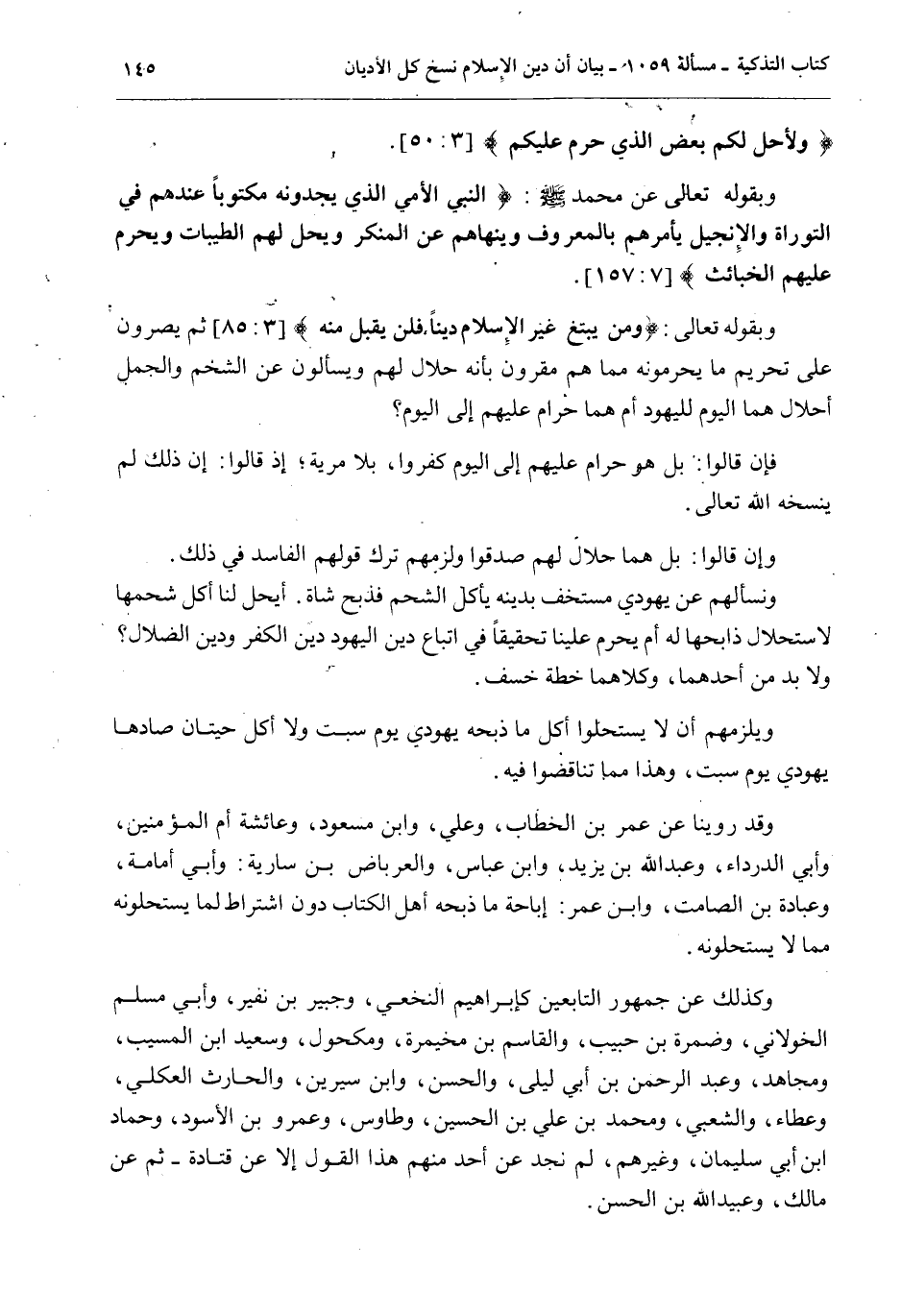 وَبِقَوْلِهِ تَعَالَى عَنْ مُحَمَّدٍ - صَلَّى اللَّهُ عَلَيْهِ وَسَلَّمَ -: {النَّبِيَّ الأُمِّيَّ الَّذِي يَجِدُونَهُ مَكْتُوبًا عِنْدَهُمْ فِي التَّوْرَاةِ وَالإِنْجِيلِ يَأْمُرُهُمْ بِالْمَعْرُوفِ وَيَنْهَاهُمْ عَنِ الْمُنْكَرِ وَيُحِلُّ لَهُمُ الطَّيِّبَاتِ وَيُحَرِّمُ عَلَيْهِمُ الْخَبَائِثَ} [الأعراف: 157] . وَبِقَوْلِهِ تَعَالَى: {وَمَنْ يَبْتَغِ غَيْرَ الإِسْلامِ دِينًا فَلَنْ يُقْبَلَ مِنْهُ} [آل عمران: 85] ثُمَّ يُصِرُّونَ عَلَى تَحْرِيمِ مَا يُحَرِّمُونَهُ مِمَّا هُمْ مُقِرُّونَ بِأَنَّهُ حَلَالٌ لَهُمْ وَيَسْأَلُونَ عَنْ الشَّحْمِ وَالْجَمَلِ أَحَلَالٌ هُمَا الْيَوْمَ لِلْيَهُودِ أَمْ هُمَا حَرَامٌ عَلَيْهِمْ إلَى الْيَوْمِ؟ فَإِنْ قَالُوا: بَلْ هُوَ حَرَامٌ عَلَيْهِمْ إلَى الْيَوْمِ كَفَرُوا، بِلَا مِرْيَةٍ؛ إذْ قَالُوا: إنَّ ذَلِكَ لَمْ يَنْسَخْهُ اللَّهُ تَعَالَى. وَإِنْ قَالُوا: بَلْ هُمَا حَلَالٌ صُدِّقُوا وَلَزِمَهُمْ تَرْكُ قَوْلِهِمْ الْفَاسِدِ فِي ذَلِكَ. وَنَسْأَلُهُمْ عَنْ يَهُودِيٍّ مُسْتَخْفٍ بِدِينِهِ يَأْكُلُ الشَّحْمَ فَذَبَحَ شَاةً. أَيَحِلُّ لَنَا أَكْلُ شَحْمِهَا لِاسْتِحْلَالِ ذَابِحِهَا لَهُ أَمْ يَحْرُمُ عَلَيْنَا تَحْقِيقًا فِي اتِّبَاعِ دِينِ الْيَهُودِ دِينِ الْكُفْرِ وَدِينِ الضَّلَالِ؟ وَلَا بُدَّ مِنْ أَحَدِهِمَا، وَكِلَاهُمَا خُطَّةُ خَسْفٍ. وَيَلْزَمُهُمْ أَنْ لَا يَسْتَحِلُّوا أَكْلَ مَا ذَبَحَهُ يَهُودِيٌّ يَوْمَ سَبْتٍ وَلَا أَكْلَ حِيتَانٍ صَادَهَا يَهُودِيٌّ يَوْمَ سَبْتٍ، وَهَذَا مِمَّا تَنَاقَضُوا فِيهِ. وَقَدْ رُوِّينَا عَنْ عُمَرَ بْنِ الْخَطَّابِ، وَعَلِيٍّ، وَابْنِ مَسْعُودٍ، وَعَائِشَةَ أُمِّ الْمُؤْمِنِينَ، وَأَبِي الدَّرْدَاءِ، وَعَبْدِ اللَّهِ بْنِ يَزِيدَ، وَابْنِ عَبَّاسٍ، وَالْعِرْبَاضِ بْنِ سَارِيَةَ: وَأَبِي أُمَامَةَ، وَعُبَادَةَ بْنِ الصَّامِتِ، وَابْنِ عُمَرَ: إبَاحَةَ مَا ذَبَحَهُ أَهْلُ الْكِتَابِ دُونَ اشْتِرَاطٍ لِمَا يَسْتَحِلُّونَهُ مِمَّا لَا يَسْتَحِلُّونَهُ.