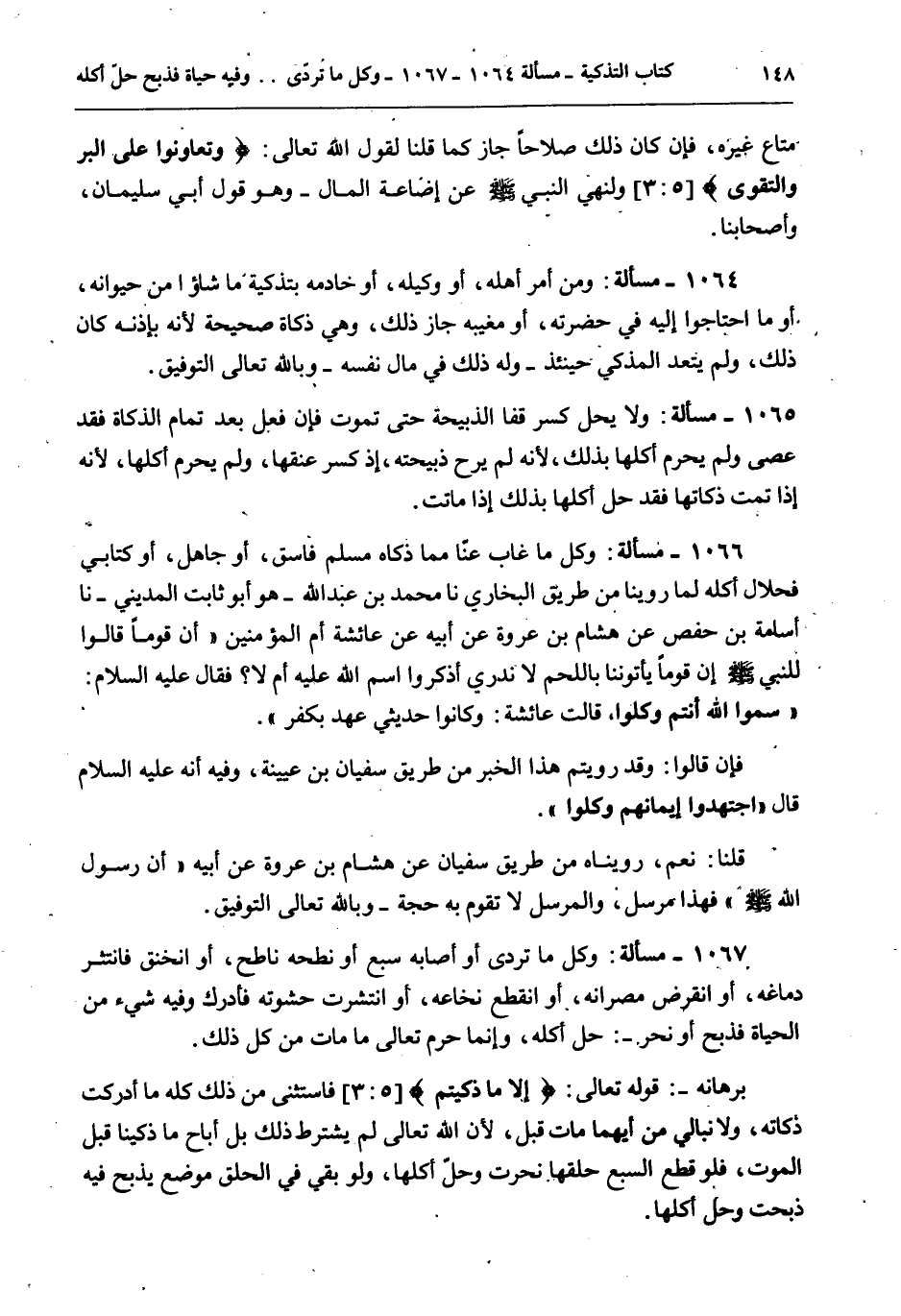 1067 - مَسْأَلَةٌ: وَكُلُّ مَا تَرَدَّى أَوْ أَصَابَهُ سَبُعٌ أَوْ نَطَحَهُ نَاطِحٌ، أَوْ انْخَنَقَ فَانْتَثَرَ دِمَاغُهُ، أَوْ انْقَرَضَ مُصْرَانُهُ، أَوْ انْقَطَعَ نُخَاعُهُ، أَوْ انْتَشَرَتْ حَشْوَتُهُ فَأُدْرِكَ وَفِيهِ شَيْءٌ مِنْ الْحَيَاةِ فَذُبِحَ أَوْ نُحِرَ -: حَلَّ أَكْلُهُ، وَإِنَّمَا حَرَّمَ تَعَالَى مَا مَاتَ مِنْ كُلِّ ذَلِكَ. بُرْهَانُهُ -: قَوْله تَعَالَى: {إِلا مَا ذَكَّيْتُمْ} [المائدة: 3] فَاسْتَثْنَى مِنْ ذَلِكَ كُلِّهِ مَا أُدْرِكَتْ ذَكَاتُهُ، وَلَا نُبَالِي مِنْ أَيِّهِمَا مَاتَ قَبْلُ، لِأَنَّ اللَّهَ تَعَالَى لَمْ يَشْتَرِطْ ذَلِكَ بَلْ أَبَاحَ مَا ذَكَّيْنَا قَبْلَ الْمَوْتِ، فَلَوْ قَطَعَ السَّبُعُ حَلْقَهَا نُحِرَتْ وَحَلَّ أَكْلُهَا، وَلَوْ بَقِيَ فِي الْحَلْقِ مَوْضِعٌ يُذْبَحُ فِيهِ ذُبِحَتْ وَحَلَّ أَكْلُهَا.