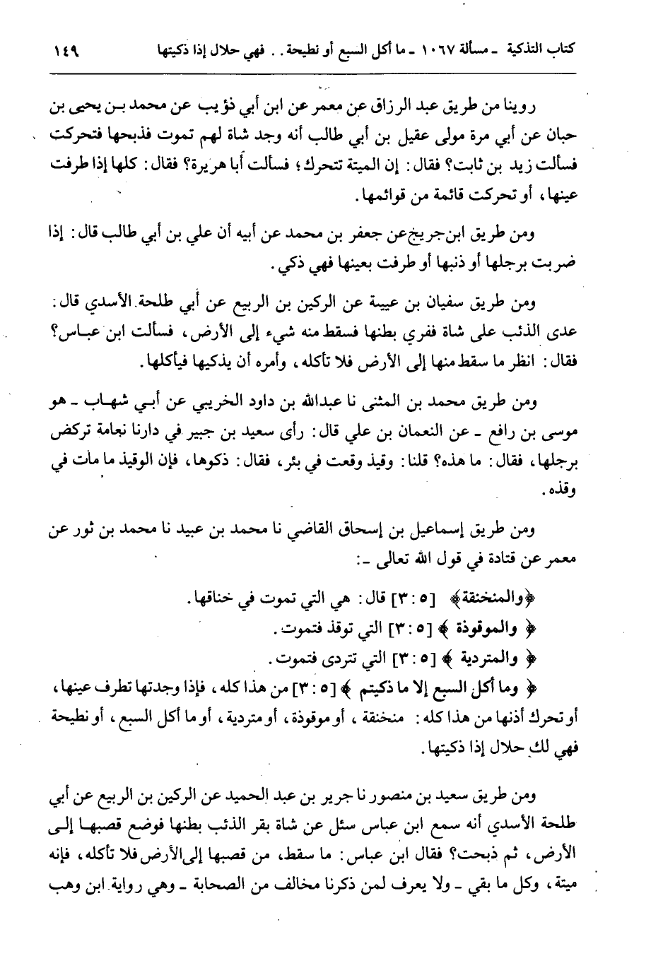 وَمِنْ طَرِيقِ ابْنِ جُرَيْجٍ عَنْ جَعْفَرِ بْنِ مُحَمَّدٍ عَنْ أَبِيهِ أَنَّ عَلِيَّ بْنَ أَبِي طَالِبٍ قَالَ: إذَا ضَرَبَتْ بِرِجْلِهَا أَوْ ذَنَبِهَا أَوْ طَرَفَتْ بِعَيْنِهَا فَهِيَ ذَكِيٌّ. وَمِنْ طَرِيقِ سُفْيَانَ بْنِ عُيَيْنَةَ عَنْ الرُّكَيْنِ بْنِ الرَّبِيعِ عَنْ أَبِي طَلْحَةَ الْأَسَدِيِّ قَالَ: عَدَا الذِّئْبُ عَلَى شَاةٍ فَفَرَى بَطْنَهَا فَسَقَطَ مِنْهُ شَيْءٌ إلَى الْأَرْضِ، فَسَأَلْتُ ابْنَ عَبَّاسٍ؟ فَقَالَ: اُنْظُرْ مَا سَقَطَ مِنْهَا إلَى الْأَرْضِ فَلَا تَأْكُلْهُ، وَأَمَرَهُ أَنْ يُذَكِّيَهَا فَيَأْكُلَهَا. وَمِنْ طَرِيقِ مُحَمَّدِ بْنِ الْمُثَنَّى نا عَبْدُ اللَّهِ بْنُ دَاوُد الْخُرَيْبِيُّ عَنْ أَبِي شِهَابٍ هُوَ مُوسَى بْنُ رَافِعٍ - عَنْ النُّعْمَانِ بْنِ عَلِيٍّ قَالَ: رَأَى سَعِيدُ بْنُ جُبَيْرٍ فِي دَارِنَا نَعَامَةً تَرْكُضُ بِرِجْلِهَا، فَقَالَ: مَا هَذِهِ؟ قُلْنَا: وَقِيذٌ وَقَعَتْ فِي بِئْرٍ، فَقَالَ: ذَكُّوهَا، فَإِنَّ الْوَقِيذَ مَا مَاتَ فِي وَقْذِهِ. وَمِنْ طَرِيقِ إسْمَاعِيلَ بْنِ إِسْحَاقَ الْقَاضِي نا مُحَمَّدُ بْنُ عُبَيْدٍ نا مُحَمَّدُ بْنُ ثَوْرٍ عَنْ مَعْمَرٍ عَنْ قَتَادَةَ فِي قَوْلِ اللَّهِ تَعَالَى -: {وَالْمُنْخَنِقَةُ} [المائدة: 3] قَالَ: هِيَ الَّتِي تَمُوتُ فِي خِنَاقِهَا. {وَالْمَوْقُوذَةُ} [المائدة: 3] الَّتِي تُوقَذُ فَتَمُوتُ. {وَالْمُتَرَدِّيَةُ} [المائدة: 3] الَّتِي تَتَرَدَّى فَتَمُوتُ. {وَمَا أَكَلَ السَّبُعُ إِلا مَا ذَكَّيْتُمْ} [المائدة: 3] مِنْ هَذَا كُلِّهِ، فَإِذَا وَجَدْتهَا تَطْرِفُ عَيْنَهَا، أَوْ تُحَرِّكُ أُذُنَهَا مِنْ هَذَا كُلِّهِ: مُنْخَنِقَةً، أَوْ مَوْقُوذَةً، أَوْ مُتَرَدِّيَةً، أَوْ مَا أَكَلَ السَّبُعُ، أَوْ نَطِيحَةً فَهِيَ لَك حَلَالٌ إذَا ذَكَّيْتَهَا.