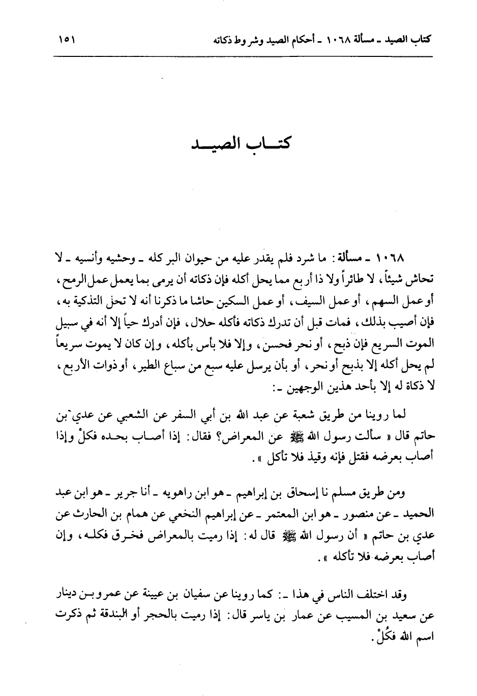 ِ 1068 - مَسْأَلَةٌ: مَا شَرَدَ فَلَمْ يُقْدَرْ عَلَيْهِ مِنْ حَيَوَانِ الْبَرِّ كُلِّهِ - وَحْشِيِّهِ وَأَنِيسِهِ - لَا تُحَاشِ شَيْئًا، لَا طَائِرًا وَلَا ذَا أَرْبَعٍ مِمَّا يَحِلُّ أَكْلُهُ فَإِنَّ ذَكَاتَهُ أَنْ يُرْمَى بِمَا يَعْمَلُ عَمَلَ الرُّمْحِ، أَوْ عَمَلَ السَّهْمِ، أَوْ عَمَلَ السَّيْفِ، أَوْ عَمَلَ السِّكِّينِ حَاشَا مَا ذَكَرْنَا أَنَّهُ لَا تَحِلُّ التَّذْكِيَةُ بِهِ، فَإِنْ أُصِيبَ بِذَلِكَ، فَمَاتَ قَبْلَ أَنْ تُدْرَكَ ذَكَاتُهُ فَأَكْلُهُ حَلَالٌ، فَإِنْ أُدْرِكَ حَيًّا إلَّا أَنَّهُ فِي سَبِيلِ الْمَوْتِ السَّرِيعِ فَإِنْ ذُبِحَ، أَوْ نُحِرَ فَحَسَنٌ، وَإِلَّا فَلَا بَأْسَ بِأَكْلِهِ، وَإِنْ كَانَ لَا يَمُوتُ سَرِيعًا لَمْ يَحِلَّ أَكْلُهُ إلَّا بِذَبْحٍ أَوْ نَحْرٍ، أَوْ بِأَنْ يُرْسَلَ عَلَيْهِ سَبُعٌ مِنْ سِبَاعِ الطَّيْرِ، أَوْ ذَوَاتِ الْأَرْبَعِ، لَا ذَكَاةَ لَهُ إلَّا بِأَحَدِ هَذَيْنِ الْوَجْهَيْنِ -: لِمَا رُوِّينَا مِنْ طَرِيقِ شُعْبَةَ عَنْ عَبْدِ اللَّهِ بْنِ أَبِي السَّفَرِ عَنْ الشَّعْبِيِّ عَنْ عَدِيِّ بْنِ حَاتِمٍ قَالَ «سَأَلْتُ رَسُولَ اللَّهِ - صَلَّى اللَّهُ عَلَيْهِ وَسَلَّمَ - عَنْ الْمِعْرَاضِ؟ فَقَالَ: إذَا أَصَابَ بِحَدِّهِ فَكُلْ وَإِذَا أَصَابَ بِعَرْضِهِ فَقَتَلَ فَإِنَّهُ وَقِيذٌ فَلَا تَأْكُلْ» . وَمِنْ طَرِيقِ مُسْلِمٍ نا إِسْحَاقُ بْنُ إبْرَاهِيمَ هُوَ ابْنُ رَاهْوَيْهِ - أَنَا جَرِيرٌ هُوَ ابْنُ عَبْدِ الْحَمِيدِ - عَنْ مَنْصُورٍ هُوَ ابْنُ الْمُعْتَمِرِ - عَنْ إبْرَاهِيمَ النَّخَعِيِّ عَنْ هَمَّامِ بْنِ الْحَارِثِ عَنْ عَدِيِّ بْنِ حَاتِمٍ أَنَّ رَسُولَ اللَّهِ - صَلَّى اللَّهُ عَلَيْهِ وَسَلَّمَ - قَالَ لَهُ: «إذَا رَمَيْتَ بِالْمِعْرَاضِ فَخَرَقَ فَكُلْهُ، وَإِنْ أَصَابَ بِعَرْضِهِ فَلَا تَأْكُلْهُ» . وَقَدْ اخْتَلَفَ النَّاسُ فِي هَذَا -: كَمَا رُوِّينَا عَنْ سُفْيَانَ بْنِ عُيَيْنَةَ عَنْ عَمْرِو بْنِ دِينَارٍ عَنْ سَعِيدِ بْنِ الْمُسَيِّبِ عَنْ عَمَّارِ بْنِ يَاسِرٍ قَالَ: إذَا رَمَيْت بِالْحَجَرِ أَوْ الْبُنْدُقَةِ ثُمَّ ذَكَرْتَ اسْمَ اللَّهِ فَكُلْ.