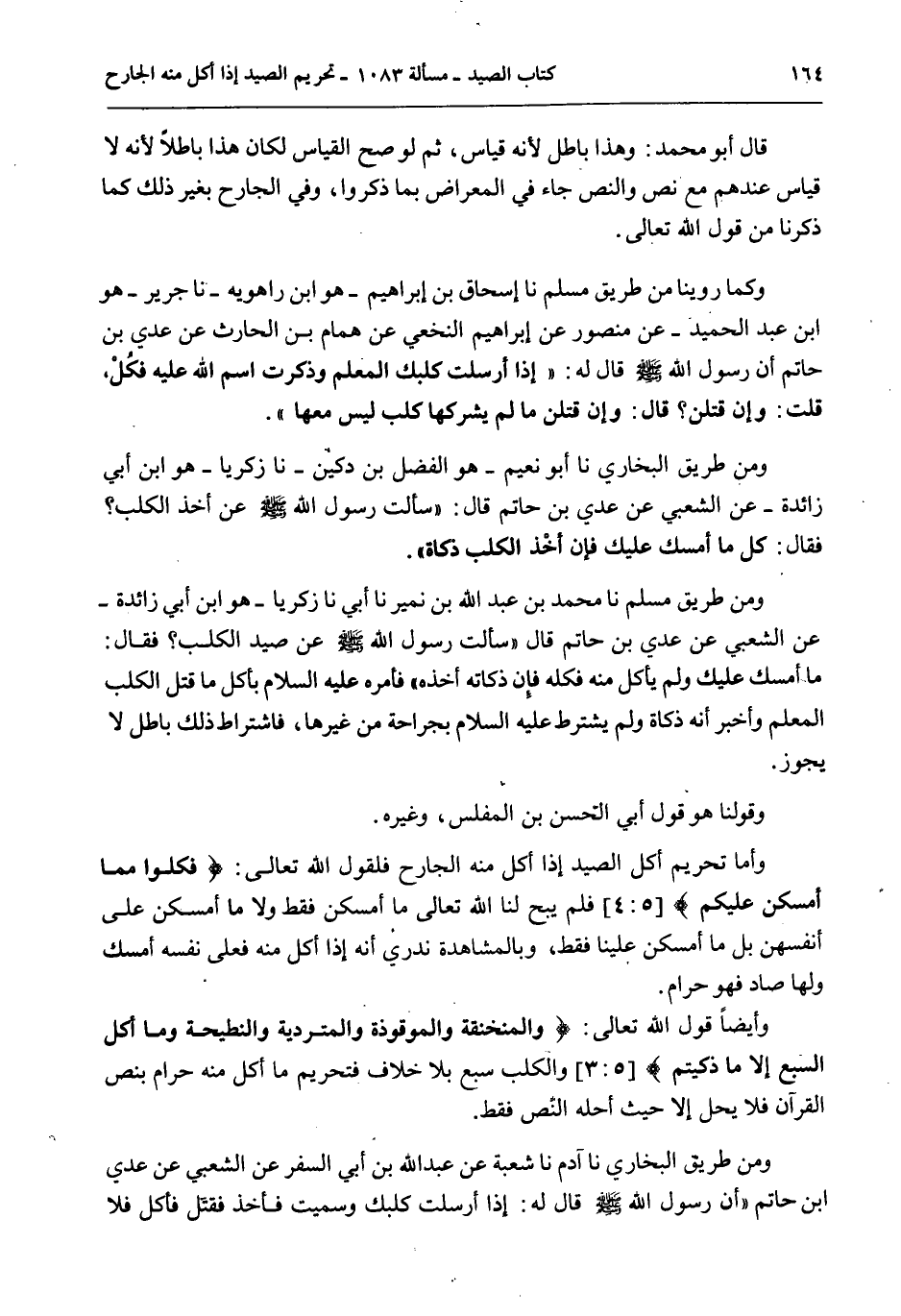 ثُمَّ لَوْ صَحَّ الْقِيَاسُ لَكَانَ هَذَا بَاطِلًا لِأَنَّهُ لَا قِيَاسَ عِنْدَهُمْ مَعَ نَصٍّ وَالنَّصُّ جَاءَ فِي الْمِعْرَاضِ بِمَا ذَكَرُوا، وَفِي الْجَارِحِ بِغَيْرِ ذَلِكَ كَمَا ذَكَرْنَا مِنْ قَوْلِ اللَّهِ تَعَالَى. وَكَمَا رُوِّينَا مِنْ طَرِيقِ مُسْلِمٍ نا إِسْحَاقُ بْنُ إبْرَاهِيمَ هُوَ ابْنُ رَاهْوَيْهِ - نا جَرِيرٌ هُوَ ابْنُ عَبْدِ الْحَمِيدِ - عَنْ مَنْصُورٍ عَنْ إبْرَاهِيمَ النَّخَعِيِّ عَنْ هَمَّامِ بْنِ الْحَارِثِ عَنْ عَدِيِّ بْنِ حَاتِمٍ أَنَّ رَسُولَ اللَّهِ - صَلَّى اللَّهُ عَلَيْهِ وَسَلَّمَ - قَالَ لَهُ: «إذَا أَرْسَلْتَ كَلْبَكَ الْمُعَلَّمَ وَذَكَرْتَ اسْمَ اللَّهِ عَلَيْهِ فَكُلْ، قُلْتُ: وَإِنْ قَتَلْنَ؟ قَالَ: وَإِنْ قَتَلْنَ مَا لَمْ يُشْرِكْهَا كَلْبٌ لَيْسَ مَعَهَا» . وَمِنْ طَرِيقِ الْبُخَارِيِّ نا أَبُو نُعَيْمٍ هُوَ الْفَضْلُ بْنُ دُكَيْنٍ - نا زَكَرِيَّا هُوَ ابْنُ أَبِي زَائِدَةَ - عَنْ الشَّعْبِيِّ عَنْ «عَدِيِّ بْنِ حَاتِمٍ قَالَ: سَأَلْتُ رَسُولَ اللَّهِ - صَلَّى اللَّهُ عَلَيْهِ وَسَلَّمَ - عَنْ أَخْذِ الْكَلْبِ؟ فَقَالَ: كُلْ مَا أَمْسَكَ عَلَيْكَ فَإِنَّ أَخْذَ الْكَلْبِ ذَكَاةٌ» . وَمِنْ طَرِيقِ مُسْلِمٍ نا مُحَمَّدُ بْنُ عَبْدِ اللَّهِ بْنِ نُمَيْرٍ نا أَبِي نا زَكَرِيَّا - هُوَ ابْنُ أَبِي زَائِدَةَ - عَنْ الشَّعْبِيِّ عَنْ «عَدِيِّ بْنِ حَاتِمٍ قَالَ سَأَلْتُ رَسُولَ اللَّهِ - صَلَّى اللَّهُ عَلَيْهِ وَسَلَّمَ - عَنْ صَيْدِ الْكَلْبِ؟ فَقَالَ: مَا أَمْسَكَ عَلَيْكَ وَلَمْ يَأْكُلْ مِنْهُ فَكُلْهُ فَإِنَّ ذَكَاتَهُ أَخْذُهُ» فَأَمَرَهُ - عَلَيْهِ السَّلَامُ - بِأَكْلِ مَا قَتَلَ الْكَلْبُ الْمُعَلَّمُ وَأَخْبَرَ أَنَّهُ ذَكَاةٌ وَلَمْ يَشْتَرِطْ - عَلَيْهِ السَّلَامُ - بِجِرَاحَةٍ مِنْ غَيْرِهَا، فَاشْتِرَاطُ ذَلِكَ بَاطِلٌ لَا يَجُوزُ. وَقَوْلُنَا هُوَ قَوْلُ أَبِي الْحَسَنِ بْنِ الْمُغَلِّسِ، وَغَيْرِهِ.