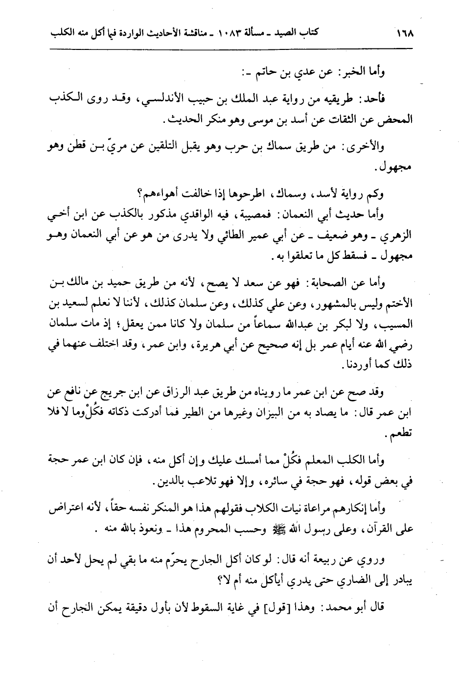 وَقَدْ صَحَّ عَنْ ابْنِ عُمَرَ مَا رُوِّينَاهُ مِنْ طَرِيقِ عَبْدِ الرَّزَّاقِ عَنْ ابْنِ جُرَيْجٍ عَنْ نَافِعٍ عَنْ ابْنِ عُمَرَ قَالَ: مَا يُصَادُ بِهِ مِنْ الْبِيزَانِ وَغَيْرِهَا مِنْ الطَّيْرِ فَمَا أَدْرَكْتَ ذَكَاتَهُ فَكُلْ وَمَا لَا فَلَا تَطْعَمُ. وَأَمَّا الْكَلْبُ الْمُعَلَّمُ فَكُلْ مِمَّا أَمْسَكَ عَلَيْك وَإِنْ أَكَلَ مِنْهُ، فَإِنْ كَانَ ابْنُ عُمَرَ حُجَّةً فِي بَعْضِ قَوْلِهِ، فَهُوَ حُجَّةٌ فِي سَائِرِهِ، وَإِلَّا فَهُوَ تَلَاعُبٌ بِالدِّينِ. وَأَمَّا إنْكَارُهُمْ مُرَاعَاةَ نِيَّاتِ الْكِلَابِ فَقَوْلُهُمْ هَذَا هُوَ الْمُنْكَرُ نَفْسُهُ حَقًّا، لِأَنَّهُ اعْتِرَاضٌ عَلَى الْقُرْآنِ، وَعَلَى رَسُولِ اللَّهِ - صَلَّى اللَّهُ عَلَيْهِ وَسَلَّمَ - وَحَسْبُ الْمَحْرُومِ هَذَا - وَنَعُوذُ بِاَللَّهِ مِنْهُ. وَرُوِيَ عَنْ رَبِيعَةَ أَنَّهُ قَالَ: لَوْ كَانَ أَكْلُ الْجَارِحِ يُحَرِّمُ مِنْهُ مَا بَقِيَ لَمْ يَحِلَّ لِأَحَدٍ أَنْ يُبَادِرَ إلَى الضَّارِي حَتَّى يَدْرِيَ أَيَأْكُلُ مِنْهُ أَمْ لَا؟ قَالَ أَبُو مُحَمَّدٍ: وَهَذَا [قَوْلٌ] فِي غَايَةِ السُّقُوطِ لِأَنَّ بِأَوَّلِ دَقِيقَةٍ يُمْكِنُ الْجَارِحَ أَنْ
