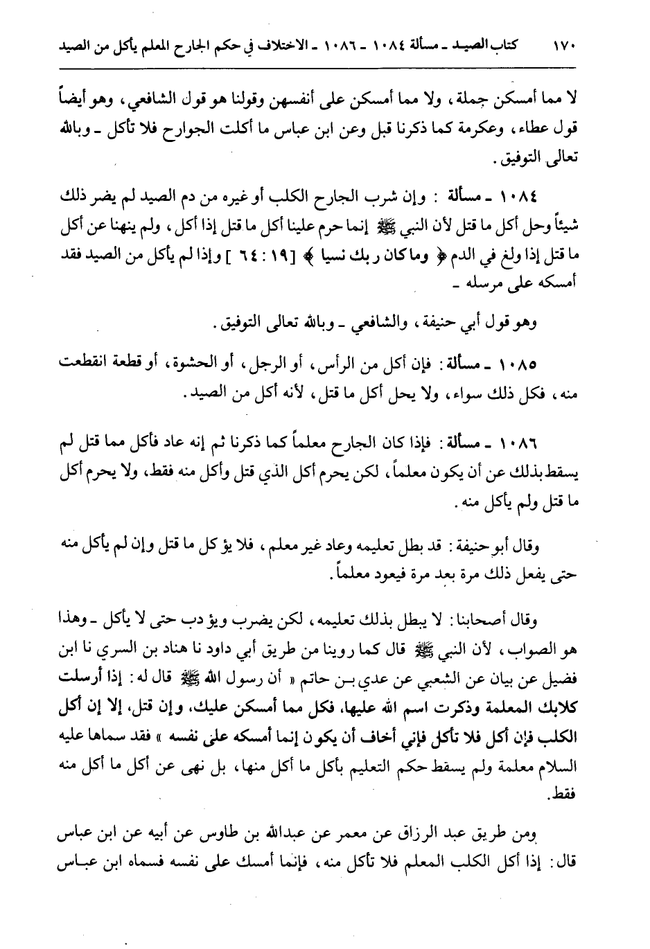 1086 - مَسْأَلَةٌ: فَإِنْ كَانَ الْجَارِحُ مُعَلَّمًا كَمَا ذَكَرْنَا ثُمَّ إنَّهُ عَادَ فَأَكَلَ مِمَّا قَتَلَ لَمْ يَسْقُطْ بِذَلِكَ عَنْ أَنْ يَكُونَ مُعَلَّمًا، لَكِنْ يَحْرُمُ أَكْلُ الَّذِي قَتَلَ وَأَكَلَ مِنْهُ فَقَطْ، وَلَا يَحْرُمُ أَكْلُ مَا قَتَلَ وَلَمْ يَأْكُلْ مِنْهُ. وَقَالَ أَبُو حَنِيفَةَ: قَدْ بَطَلَ تَعْلِيمُهُ وَعَادَ غَيْرَ مُعَلَّمٍ، فَلَا يُؤْكَلُ مَا قَتَلَ وَإِنْ لَمْ يَأْكُلْ مِنْهُ حَتَّى يَفْعَلَ ذَلِكَ مَرَّةً بَعْدَ مَرَّةٍ فَيَعُودُ مُعَلَّمًا. وَقَالَ أَصْحَابُنَا: لَا يَبْطُلُ بِذَلِكَ تَعْلِيمُهُ، لَكِنْ يُضْرَبُ وَيُؤَدَّبُ حَتَّى لَا يَأْكُلَ - وَهَذَا هُوَ الصَّوَابُ، لِأَنَّ النَّبِيَّ - صَلَّى اللَّهُ عَلَيْهِ وَسَلَّمَ - قَالَ كَمَا رُوِّينَا مِنْ طَرِيقِ أَبِي دَاوُد نا هَنَّادُ بْنُ السَّرِيِّ نا ابْنُ فُضَيْلٍ عَنْ بَيَانٍ عَنْ الشَّعْبِيِّ «عَنْ عَدِيِّ بْنِ حَاتِمٍ أَنَّ رَسُولَ اللَّهِ - صَلَّى اللَّهُ عَلَيْهِ وَسَلَّمَ - قَالَ لَهُ: إذَا أَرْسَلْتَ كِلَابَكَ الْمُعَلَّمَةَ وَذَكَرْتَ اسْمَ اللَّهِ عَلَيْهَا، فَكُلْ مِمَّا أَمْسَكْنَ عَلَيْكَ، وَإِنْ قَتَلَ، إلَّا إنْ أَكَلَ الْكَلْبُ فَإِنْ أَكَلَ فَلَا تَأْكُلْ فَإِنِّي أَخَافُ أَنْ يَكُونَ إنَّمَا أَمْسَكَهُ عَلَى نَفْسِهِ» فَقَدْ سَمَّاهَا - عَلَيْهِ السَّلَامُ - مُعَلَّمَةً وَلَمْ يُسْقِطْ حُكْمَ التَّعْلِيمِ بِأَكْلِ مَا أَكَلَ مِنْهَا، بَلْ نَهَى عَنْ أَكْلِ مَا أَكَلَ مِنْهُ فَقَطْ. وَمِنْ طَرِيقِ عَبْدِ الرَّزَّاقِ عَنْ مَعْمَرٍ عَنْ عَبْدِ اللَّهِ بْنِ طَاوُسٍ عَنْ أَبِيهِ عَنْ ابْنِ عَبَّاسٍ قَالَ: إذَا أَكَلَ الْكَلْبُ الْمُعَلَّمُ فَلَا تَأْكُلْ مِنْهُ، فَإِنَّمَا أَمْسَكَ عَلَى نَفْسِهِ فَسَمَّاهُ ابْنُ عَبَّاسٍ