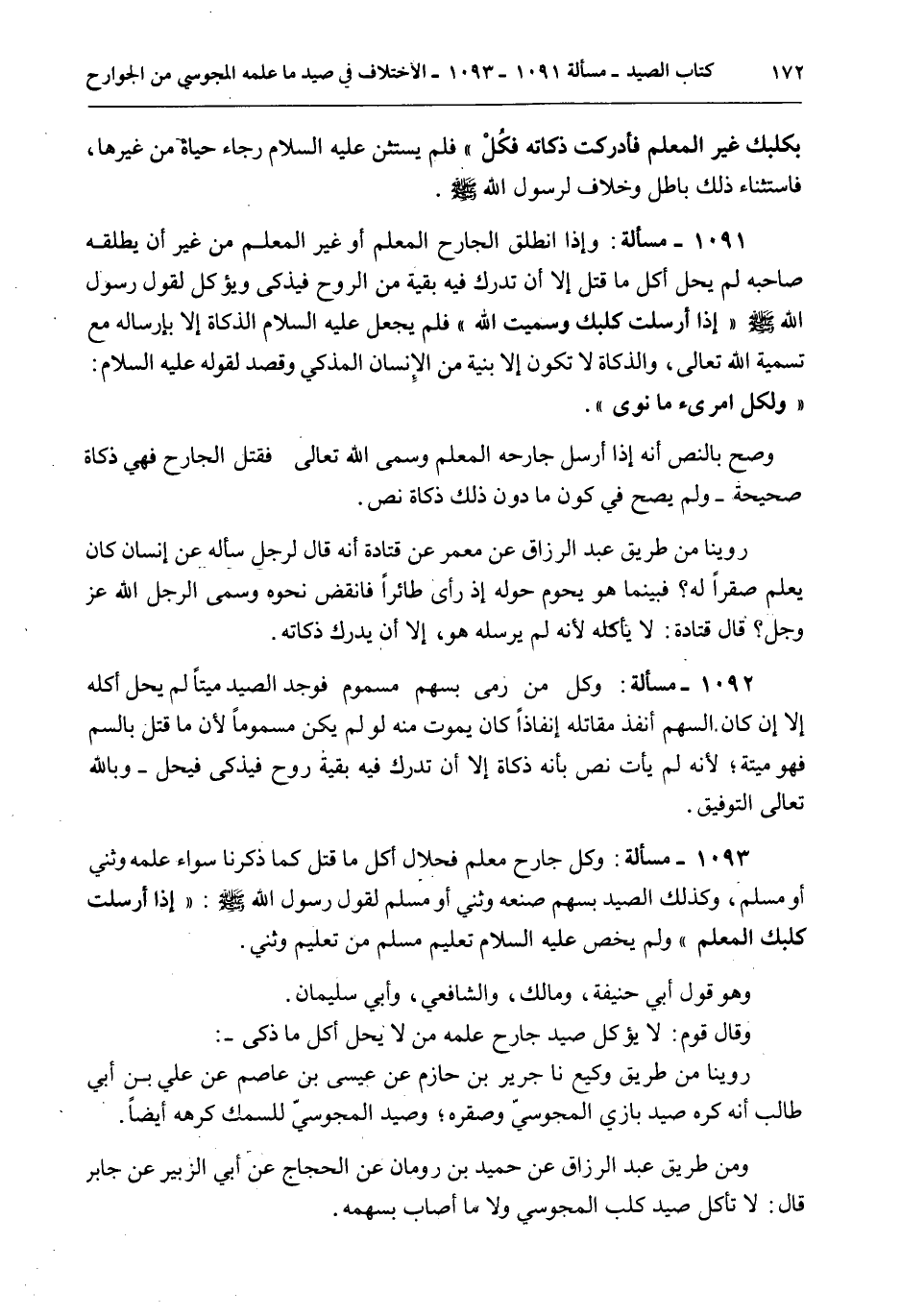 1093 - مَسْأَلَةٌ: وَكُلُّ جَارِحٍ مُعَلَّمٍ فَحَلَالٌ أَكْلُ مَا قَتَلَ كَمَا ذَكَرْنَا سَوَاءٌ عَلَّمَهُ وَثَنِيٌّ أَوْ مُسْلِمٌ، وَكَذَلِكَ الصَّيْدُ بِسَهْمٍ صَنَعَهُ وَثَنِيٌّ أَوْ مُسْلِمٌ لِقَوْلِ رَسُولِ اللَّهِ - صَلَّى اللَّهُ عَلَيْهِ وَسَلَّمَ -: «إذَا أَرْسَلْتَ كَلْبَكَ الْمُعَلَّمَ» وَلَمْ يَخُصَّ - عَلَيْهِ السَّلَامُ - تَعْلِيمَ مُسْلِمٍ مِنْ تَعْلِيمِ وَثَنِيٍّ. وَهُوَ قَوْلُ أَبِي حَنِيفَةَ، وَمَالِكٍ، وَالشَّافِعِيِّ، وَأَبِي سُلَيْمَانَ. وَقَالَ قَوْمٌ: لَا يُؤْكَلُ صَيْدُ جَارِحٍ عَلَّمَهُ مَنْ لَا يَحِلُّ أَكْلُ مَا ذَكَّى -: رُوِّينَا مِنْ طَرِيقِ وَكِيعٍ نا جَرِيرُ بْنُ حَازِمٍ عَنْ عِيسَى بْنِ عَاصِمٍ عَنْ عَلِيِّ بْنِ أَبِي طَالِبٍ أَنَّهُ كَرِهَ صَيْدَ بَازِي الْمَجُوسِيِّ وَصَقْرِهِ؛ وَصَيْدُ الْمَجُوسِيِّ لِلسَّمَكِ كَرِهَهُ أَيْضًا. وَمِنْ طَرِيقِ عَبْدِ الرَّزَّاقِ عَنْ حُمَيْدٍ بْنِ رُومَانَ عَنْ الْحَجَّاجِ عَنْ أَبِي الزُّبَيْرِ عَنْ جَابِرٍ قَالَ: لَا تَأْكُلْ صَيْدَ كَلْبِ الْمَجُوسِيِّ وَلَا مَا أَصَابَ بِسَهْمِهِ.