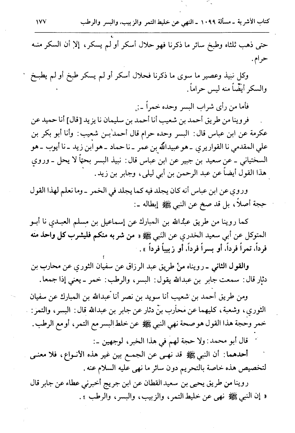 حَتَّى ذَهَبَ ثُلُثَاهُ وَطُبِخَ سَائِرُ مَا ذَكَرْنَا فَهُوَ حَلَالٌ أَسْكَرَ أَوْ لَمْ يُسْكِرْ، إلَّا أَنَّ السُّكْرَ مِنْهُ حَرَامٌ. وَكُلُّ نَبِيذٍ وَعَصِيرٍ مَا سِوَى مَا ذَكَرْنَا فَحَلَالٌ أَسْكَرَ أَوْ لَمْ يُسْكِرْ طُبِخَ أَوْ لَمْ يُطْبَخْ وَالسُّكْرُ أَيْضًا مِنْهُ لَيْسَ حَرَامًا. فَأَمَّا مَنْ رَأَى شَرَابَ الْبُسْرِ وَحْدَهُ خَمْرًا -: فَرُوِّينَا مِنْ طَرِيقِ أَحْمَدَ بْنِ شُعَيْبٍ أَنَا أَحْمَدُ بْنُ سُلَيْمَانَ نا يَزِيدُ [قَالَ] أَنَا حُمَيْدٍ عَنْ عِكْرِمَةَ عَنْ ابْنِ عَبَّاسٍ قَالَ: الْبُسْرُ وَحْدَهُ حَرَامٌ قَالَ أَحْمَدُ بْنُ شُعَيْبٍ: وَأَنَا أَبُو بَكْرِ بْنُ عَلِيٍّ الْمُقَدَّمِيُّ نا الْقَوَارِيرِيُّ هُوَ عُبَيْدُ اللَّهِ بْنُ عُمَرَ - نا حَمَّادٌ هُوَ ابْنُ زَيْدٍ - نا أَيُّوبُ هُوَ السِّخْتِيَانِيُّ - عَنْ سَعِيدِ بْنِ جُبَيْرٍ عَنْ ابْنِ عَبَّاسٍ قَالَ: نَبِيذُ الْبُسْرِ بَحْتًا لَا يَحِلُّ - وَرُوِيَ هَذَا الْقَوْلُ أَيْضًا عَنْ عَبْدِ الرَّحْمَنِ بْنِ أَبِي لَيْلَى، وَجَابِرِ بْنِ زَيْدٍ. وَرُوِيَ عَنْ ابْنِ عَبَّاسٍ أَنَّهُ كَانَ يَجْلِدُ فِيهِ كَمَا يَجْلِدُ فِي الْخَمْرِ - وَمَا نَعْلَمُ لِهَذَا الْقَوْلِ حُجَّةً أَصْلًا، بَلْ قَدْ صَحَّ عَنْ النَّبِيِّ - صَلَّى اللَّهُ عَلَيْهِ وَسَلَّمَ - إبْطَالُهُ -: كَمَا رُوِّينَا مِنْ طَرِيقِ عَبْدِ اللَّهِ بْنِ الْمُبَارَكِ عَنْ إسْمَاعِيلَ بْنِ مُسْلِمٍ الْعَبْدِيِّ نا أَبُو الْمُتَوَكِّلِ عَنْ أَبِي سَعِيدٍ الْخُدْرِيِّ عَنْ النَّبِيِّ - صَلَّى اللَّهُ عَلَيْهِ وَسَلَّمَ - «مَنْ شَرِبَهُ مِنْكُمْ فَلْيَشْرَبْ كُلَّ وَاحِدٍ مِنْهُ فَرْدًا، تَمْرًا فَرْدًا، أَوْ بُسْرًا فَرْدًا، أَوْ زَبِيبًا فَرْدًا» . وَالْقَوْلُ الثَّانِي - رُوِّينَاهُ مِنْ طَرِيقِ عَبْدِ الرَّزَّاقِ عَنْ سُفْيَانَ الثَّوْرِيِّ عَنْ مُحَارِبِ بْنِ دِثَارٍ قَالَ: سَمِعْت جَابِرَ بْنَ عَبْدِ اللَّهِ يَقُولُ: الْبُسْرُ، وَالرُّطَبُ: خَمْرٌ - يَعْنِي إذَا جُمِعَا. وَمِنْ طَرِيقِ أَحْمَدَ بْنِ شُعَيْبٍ أَنَا سُوَيْد بْنُ نَصْرٍ أَنَا عَبْدُ اللَّهِ بْنُ الْمُبَارَكِ عَنْ سُفْيَانَ الثَّوْرِيِّ، وَشُعْبَةَ، كِلَيْهِمَا عَنْ مُحَارِبِ بْنِ دِثَارٍ عَنْ جَابِرِ بْنِ عَبْدِ اللَّهِ قَالَ: الْبُسْرُ، وَالتَّمْرُ: خَمْرٌ وَحُجَّةُ هَذَا الْقَوْلِ هُوَ صِحَّةُ نَهْيِ النَّبِيِّ - صَلَّى اللَّهُ عَلَيْهِ وَسَلَّمَ - عَنْ خَلْطِ الْبُسْرِ مَعَ التَّمْرِ، أَوْ مَعَ الرُّطَبِ. قَالَ أَبُو مُحَمَّدٍ: وَلَا حُجَّةَ لَهُمْ فِي هَذَا الْخَبَرِ، لِوَجْهَيْنِ -: أَحَدُهُمَا: أَنَّ النَّبِيَّ - صَلَّى اللَّهُ عَلَيْهِ وَسَلَّمَ - قَدْ نَهَى عَنْ الْجَمْعِ بَيْنَ غَيْرِ هَذِهِ الْأَنْوَاعِ، فَلَا مَعْنَى لِتَخْصِيصِ هَذِهِ خَاصَّةً بِالتَّحْرِيمِ دُونَ سَائِرِ مَا نَهَى - عَلَيْهِ السَّلَامُ - عَنْهُ. رُوِّينَا مِنْ طَرِيقِ يَحْيَى بْنِ سَعِيدٍ الْقَطَّانِ عَنْ ابْنِ جُرَيْجٍ أَخْبَرَنِي عَطَاءٌ عَنْ جَابِرٍ قَالَ «إنَّ النَّبِيَّ - صَلَّى اللَّهُ عَلَيْهِ وَسَلَّمَ - نَهَى عَنْ خَلِيطِ التَّمْرِ، وَالزَّبِيبِ، وَالْبُسْرِ، وَالرُّطَبِ» .
