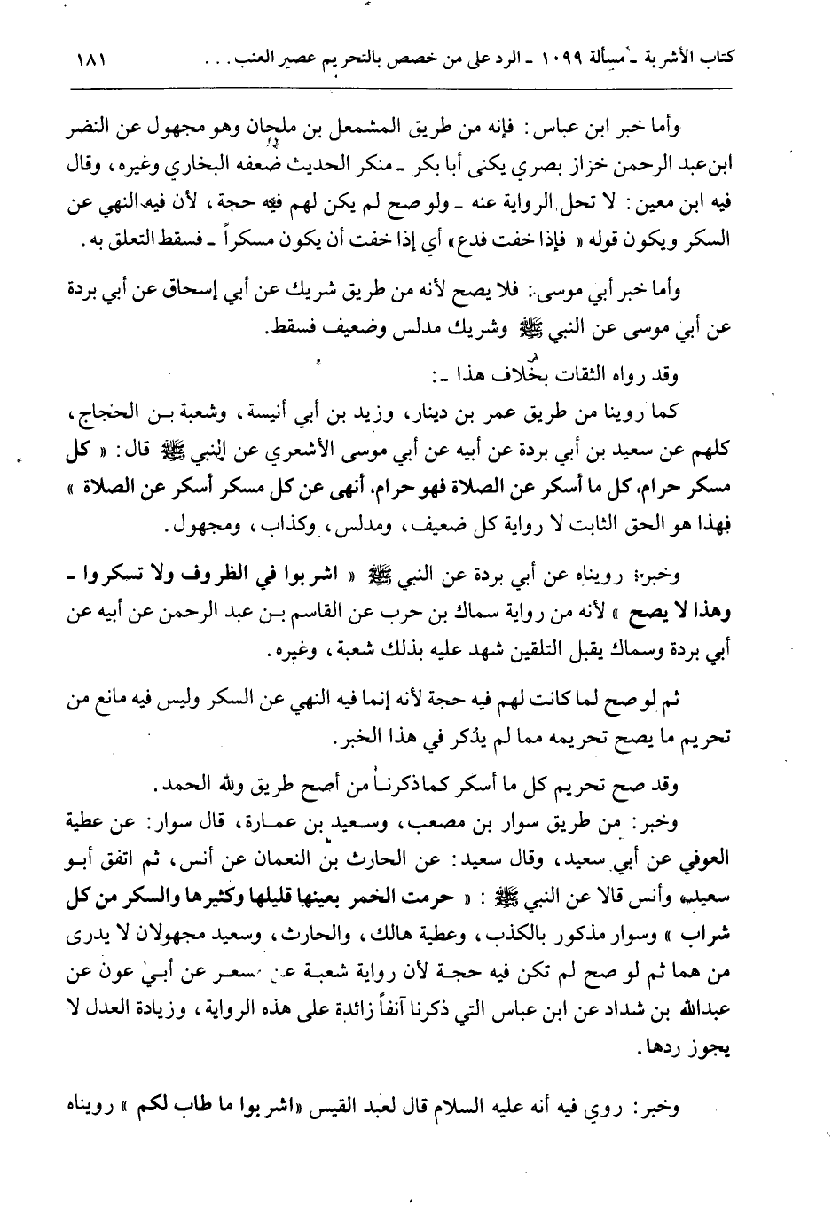 وَأَمَّا خَبَرُ ابْنِ عَبَّاسٍ: فَإِنَّهُ مِنْ طَرِيقِ الْمُشْمَعِلِّ بْنِ مِلْحَانَ وَهُوَ مَجْهُولٌ عَنْ النَّضْرِ بْنِ عَبْدِ الرَّحْمَنِ خَزَّازٌ بَصْرِيٌّ يُكَنَّى أَبَا بَكْرٍ - مُنْكَرُ الْحَدِيثِ ضَعَّفَهُ الْبُخَارِيُّ وَغَيْرُهُ، وَقَالَ فِيهِ ابْنُ مَعِينٍ: لَا تَحِلُّ الرِّوَايَةُ عَنْهُ - وَلَوْ صَحَّ لَمْ يَكُنْ لَهُمْ فِيهِ حُجَّةٌ، لِأَنَّ فِيهِ النَّهْيَ عَنْ السُّكْرِ وَيَكُونُ قَوْلُهُ «فَإِذَا خِفْتَ فَدَعْ» أَيْ إذَا خِفْت أَنْ يَكُونَ مُسْكِرًا - فَسَقَطَ التَّعَلُّقُ بِهِ. وَأَمَّا خَبَرُ أَبِي مُوسَى: فَلَا يَصِحُّ لِأَنَّهُ مِنْ طَرِيقِ شَرِيكٍ عَنْ أَبِي إِسْحَاقَ عَنْ أَبِي بُرْدَةَ عَنْ أَبِي مُوسَى عَنْ النَّبِيِّ - صَلَّى اللَّهُ عَلَيْهِ وَسَلَّمَ - وَشَرِيكٍ مُدَلِّسٌ وَضَعِيفٌ فَسَقَطَ. وَقَدْ رَوَاهُ الثِّقَاتُ بِخِلَافِ هَذَا -: كَمَا رُوِّينَا مِنْ طَرِيقِ عُمَرَ بْنِ دِينَارٍ، وَزَيْدِ بْنِ أَبِي أُنَيْسَةَ، وَشُعْبَةَ بْنِ الْحَجَّاجِ، كُلِّهِمْ عَنْ سَعِيدِ بْنِ أَبِي بُرْدَةَ عَنْ أَبِيهِ عَنْ أَبِي مُوسَى الْأَشْعَرِيِّ عَنْ النَّبِيِّ - صَلَّى اللَّهُ عَلَيْهِ وَسَلَّمَ - قَالَ: «كُلُّ مُسْكِرٍ حَرَامٌ، كُلُّ مَا أَسْكَرَ عَنْ الصَّلَاةِ فَهُوَ حَرَامٌ، أَنْهَى عَنْ كُلِّ مُسْكِرٍ أَسْكَرَ عَنْ الصَّلَاةِ» فَهَذَا هُوَ الْحَقُّ الثَّابِتُ لَا رِوَايَةُ كُلِّ ضَعِيفٍ، وَمُدَلِّسٍ، وَكَذَّابٍ، وَمَجْهُولٍ. وَخَبَرٌ رُوِّينَاهُ عَنْ أَبِي بُرْدَةَ عَنْ النَّبِيِّ - صَلَّى اللَّهُ عَلَيْهِ وَسَلَّمَ - «اشْرَبُوا فِي الظُّرُوفِ وَلَا تَسْكَرُوا» - وَهَذَا لَا يَصِحُّ لِأَنَّهُ مِنْ رِوَايَةِ سِمَاكِ بْنِ حَرْبٍ عَنْ الْقَاسِمِ بْنِ عَبْدِ الرَّحْمَنِ عَنْ أَبِيهِ عَنْ أَبِي بُرْدَةَ وَسِمَاكٌ يَقْبَلُ التَّلْقِينَ شَهِدَ عَلَيْهِ بِذَلِكَ شُعْبَةُ، وَغَيْرُهُ. ثُمَّ لَوْ صَحَّ لَمَا كَانَتْ لَهُمْ فِيهِ حُجَّةٌ لِأَنَّهُ إنَّمَا فِيهِ النَّهْيُ عَنْ السُّكْرِ وَلَيْسَ فِيهِ مَانِعٌ مِنْ تَحْرِيمِ مَا يَصِحُّ تَحْرِيمُهُ مِمَّا لَمْ يُذْكَرْ فِي هَذَا الْخَبَرِ. وَقَدْ صَحَّ تَحْرِيمُ كُلِّ مَا أَسْكَرَ كَمَا ذَكَرْنَا مِنْ أَصَحِّ طَرِيقٍ وَلِلَّهِ الْحَمْدُ. وَخَبَرٌ: مِنْ طَرِيقِ سَوَّارِ بْنِ مُصْعَبٍ، وَسَعِيدِ بْنِ عُمَارَةَ، قَالَ سَوَّارٌ: عَنْ عَطِيَّةَ الْعَوْفِيِّ عَنْ أَبِي سَعِيدٍ، وَقَالَ سَعِيدٌ: عَنْ الْحَارِثِ بْنِ النُّعْمَانِ عَنْ أَنَسٍ، ثُمَّ اتَّفَقَ أَبُو سَعِيدٍ وَأَنَسٌ قَالَا عَنْ النَّبِيِّ - صَلَّى اللَّهُ عَلَيْهِ وَسَلَّمَ -: «حُرِّمَتْ الْخَمْرُ بِعَيْنِهَا قَلِيلُهَا وَكَثِيرُهَا وَالسُّكْرُ مِنْ كُلِّ شَرَابٍ» وَسَوَّارٌ مَذْكُورٌ بِالْكَذِبِ، وَعَطِيَّةُ هَالِكٌ، وَالْحَارِثُ، وَسَعِيدٌ مَجْهُولَانِ لَا يُدْرَى مَنْ هُمَا ثُمَّ لَوْ صَحَّ لَمْ تَكُنْ فِيهِ حُجَّةٌ لِأَنَّ رِوَايَةَ شُعْبَةَ عَنْ مِسْعَرٍ عَنْ أَبِي عَوْنٍ عَنْ عَبْدِ اللَّهِ بْنِ شَدَّادٍ عَنْ ابْنِ عَبَّاسٍ الَّتِي ذَكَرْنَا آنِفًا زَائِدَةٌ عَلَى هَذِهِ الرِّوَايَةِ، وَزِيَادَةُ الْعَدْلِ لَا يَجُوزُ رَدُّهَا. وَخَبَرٌ: رُوِيَ فِيهِ «أَنَّهُ - عَلَيْهِ السَّلَامُ - قَالَ لِعَبْدِ الْقَيْسِ اشْرَبُوا مَا طَابَ لَكُمْ» رُوِّينَاهُ