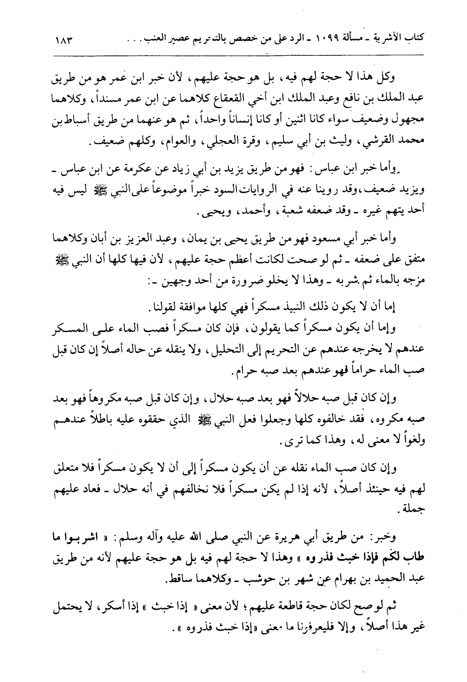 وَكُلُّ هَذَا لَا حُجَّةَ لَهُمْ فِيهِ، بَلْ هُوَ حُجَّةٌ عَلَيْهِمْ، لِأَنَّ خَبَرَ ابْنِ عُمَرَ هُوَ مِنْ طَرِيقِ عَبْدِ الْمَلِكِ بْنِ نَافِعٍ وَعَبْدِ الْمَلِكِ ابْنِ أَخِي الْقَعَْقَاعِ كِلَاهُمَا عَنْ ابْنِ عُمَرَ مُسْنَدًا، وَكِلَاهُمَا مَجْهُولٌ وَضَعِيفٌ سَوَاءٌ كَانَا اثْنَيْنِ أَوْ كَانَا إنْسَانًا وَاحِدًا، ثُمَّ هُوَ عَنْهُمَا مِنْ طَرِيقِ أَسْبَاطِ بْنِ مُحَمَّدِ الْقُرَشِيِّ، وَلَيْثِ بْنِ أَبِي سُلَيْمٍ، وَقُرَّةَ الْعِجْلِيّ، وَالْعَوَّامِ؛ وَكُلُّهُمْ ضَعِيفٌ. وَأَمَّا خَبَرُ ابْنِ عَبَّاسٍ: فَهُوَ مِنْ طَرِيقِ يَزِيدَ بْنِ أَبِي زِيَادٍ عَنْ عِكْرِمَةَ عَنْ ابْنِ عَبَّاسٍ - وَيَزِيدَ ضَعِيفٌ، وَقَدْ رُوِّينَا عَنْهُ فِي الرِّوَايَاتِ السُّودِ خَبَرًا مَوْضُوعًا عَلَى النَّبِيِّ - صَلَّى اللَّهُ عَلَيْهِ وَسَلَّمَ - لَيْسَ فِيهِ أَحَدٌ يَتَّهِمُ غَيْرَهُ - وَقَدْ ضَعَّفَهُ شُعْبَةُ، وَأَحْمَدُ، وَيَحْيَى. وَأَمَّا خَبَرُ أَبِي مَسْعُودٍ فَهُوَ مِنْ طَرِيقِ يَحْيَى بْنِ يَمَانٍ، وَعَبْدِ الْعَزِيزِ بْنِ أَبَانَ وَكِلَاهُمَا مُتَّفَقٌ عَلَى ضَعْفِهِ - ثُمَّ لَوْ صَحَّتْ لَكَانَتْ أَعْظَمَ حُجَّةً عَلَيْهِمْ، لِأَنَّ فِيهَا كُلِّهَا أَنَّ النَّبِيَّ - صَلَّى اللَّهُ عَلَيْهِ وَسَلَّمَ - مَزَجَهُ بِالْمَاءِ ثُمَّ شَرِبَهُ - وَهَذَا لَا يَخْلُو ضَرُورَةً مِنْ أَحَدِ وَجْهَيْنِ -: إمَّا أَنْ لَا يَكُونَ ذَلِكَ النَّبِيذُ مُسْكِرًا فَهِيَ كُلُّهَا مُوَافِقَةٌ لِقَوْلِنَا. وَإِمَّا أَنْ يَكُونَ مُسْكِرًا كَمَا يَقُولُونَ، فَإِنْ كَانَ مُسْكِرًا فَصَبُّ الْمَاءِ عَلَى الْمُسْكِرِ عِنْدَهُمْ لَا يُخْرِجُهُ عِنْدَهُمْ عَنْ التَّحْرِيمِ إلَى التَّحْلِيلِ، وَلَا يَنْقُلُهُ عَنْ حَالِهِ أَصْلًا إنْ كَانَ قَبْلَ صَبِّ الْمَاءِ حَرَامًا فَهُوَ عِنْدَهُمْ بَعْدَ صَبِّهِ حَرَامٌ. وَإِنْ كَانَ قَبْلَ صَبِّهِ حَلَالًا فَهُوَ بَعْدَ صَبِّهِ حَلَالٌ، وَإِنْ كَانَ قَبْلَ صَبِّهِ مَكْرُوهًا فَهُوَ بَعْدَ صَبِّهِ مَكْرُوهٌ، فَقَدْ خَالَفُوهُ كُلَّهَا وَجَعَلُوا فِعْلَ النَّبِيِّ - صَلَّى اللَّهُ عَلَيْهِ وَسَلَّمَ - الَّذِي حَقَّقُوهُ عَلَيْهِ بَاطِلًا عِنْدَهُمْ وَلَغْوًا لَا مَعْنَى لَهُ، وَهَذَا كَمَا تَرَى. وَإِنْ كَانَ صَبُّ الْمَاءِ نَقَلَهُ عَنْ أَنْ يَكُونَ مُسْكِرًا إلَى أَنْ لَا يَكُونَ مُسْكِرًا فَلَا مُتَعَلِّقَ لَهُمْ فِيهِ حِينَئِذٍ أَصْلًا، لِأَنَّهُ إذَا لَمْ يَكُنْ مُسْكِرًا فَلَا نُخَالِفُهُمْ فِي أَنَّهُ حَلَالٌ - فَعَادَ عَلَيْهِمْ جُمْلَةً. وَخَبَرٌ: مِنْ طَرِيقِ أَبِي هُرَيْرَةَ عَنْ النَّبِيِّ - صَلَّى اللَّهُ عَلَيْهِ وَآلِهِ وَسَلَّمَ -: «اشْرَبُوا مَا طَابَ لَكُمْ فَإِذَا خَبُثَ فَذَرُوهُ» وَهَذَا لَا حُجَّةَ لَهُمْ فِيهِ بَلْ هُوَ حُجَّةٌ عَلَيْهِمْ لِأَنَّهُ مِنْ طَرِيقِ عَبْدِ الْحَمِيدِ بْنِ بَهْرَامُ عَنْ شَهْرِ بْنِ حَوْشَبٍ - وَكِلَاهُمَا سَاقِطٌ. ثُمَّ لَوْ صَحَّ لَكَانَ حُجَّةً قَاطِعَةً عَلَيْهِمْ؛ لِأَنَّ مَعْنَى " إذَا خَبُثَ " إذَا أَسْكَرَ، لَا يَحْتَمِلُ غَيْرَ هَذَا أَصْلًا، وَإِلَّا فَلْيُعَرِّفُونَا مَا مَعْنَى «إذَا خَبُثَ فَذَرُوهُ» .