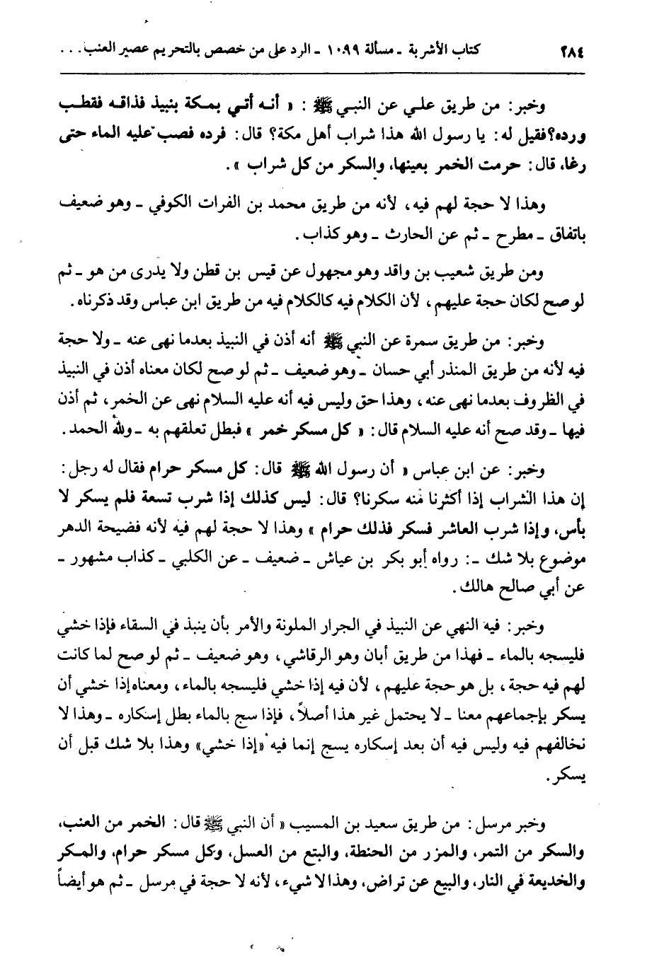 وَخَبَرٌ: مِنْ طَرِيقِ عَلِيٍّ «عَنْ النَّبِيِّ - صَلَّى اللَّهُ عَلَيْهِ وَسَلَّمَ -: أَنَّهُ أُتِيَ بِمَكَّةَ بِنَبِيذٍ فَذَاقَهُ فَقَطَّبَ وَرَدَّهُ؟ فَقِيلَ لَهُ: يَا رَسُولَ اللَّهِ هَذَا شَرَابُ أَهْلِ مَكَّةَ؟ قَالَ: فَرَدَّهُ فَصَبَّ عَلَيْهِ الْمَاءَ حَتَّى رَغَا، قَالَ: حُرِّمَتْ الْخَمْرُ بِعَيْنِهَا، وَالسُّكْرُ مِنْ كُلِّ شَرَابٍ» . وَهَذَا لَا حُجَّةَ لَهُمْ فِيهِ، لِأَنَّهُ مِنْ طَرِيقِ مُحَمَّدِ بْنِ الْفُرَاتِ الْكُوفِيِّ - وَهُوَ ضَعِيفٌ بِاتِّفَاقٍ - مُطَّرَحٌ - ثُمَّ عَنْ الْحَارِثِ - وَهُوَ كَذَّابٌ. وَمِنْ طَرِيقِ شُعَيْبِ بْنِ وَاقِدٍ وَهُوَ مَجْهُولٌ عَنْ قَيْسِ بْنِ قَطَنٍ وَلَا يُدْرَى مَنْ هُوَ - ثُمَّ لَوْ صَحَّ لَكَانَ حُجَّةً عَلَيْهِمْ، لِأَنَّ الْكَلَامَ فِيهِ كَالْكَلَامِ فِيهِ مِنْ طَرِيقِ ابْنِ عَبَّاسٍ وَقَدْ ذَكَرْنَاهُ. وَخَبَرٌ: مِنْ طَرِيقِ سَمُرَةَ «عَنْ النَّبِيِّ - صَلَّى اللَّهُ عَلَيْهِ وَسَلَّمَ - أَنَّهُ أَذِنَ فِي النَّبِيذِ بَعْدَمَا نَهَى عَنْهُ» - وَلَا حُجَّةَ فِيهِ لِأَنَّهُ مِنْ طَرِيقِ الْمُنْذِرِ أَبِي حَسَّانَ - وَهُوَ ضَعِيفٌ - ثُمَّ لَوْ صَحَّ لَكَانَ مَعْنَاهُ أَذِنَ فِي النَّبِيذِ فِي الظُّرُوفِ بَعْدَمَا نَهَى عَنْهُ، وَهَذَا حَقٌّ وَلَيْسَ فِيهِ أَنَّهُ - عَلَيْهِ السَّلَامُ - نَهَى عَنْ الْخَمْرِ، ثُمَّ أَذِنَ فِيهَا - وَقَدْ صَحَّ أَنَّهُ - عَلَيْهِ السَّلَامُ - قَالَ: «كُلُّ مُسْكِرٍ خَمْرٌ» فَبَطَلَ تَعَلُّقُهُمْ بِهِ - وَلِلَّهِ الْحَمْدُ. وَخَبَرٌ: عَنْ ابْنِ عَبَّاسٍ «أَنَّ رَسُولَ اللَّهِ - صَلَّى اللَّهُ عَلَيْهِ وَسَلَّمَ - قَالَ: كُلُّ مُسْكِرٍ حَرَامٌ فَقَالَ لَهُ رَجُلٌ: إنَّ هَذَا الشَّرَابَ إذَا أَكْثَرْنَا مِنْهُ سَكِرْنَا؟ قَالَ: لَيْسَ كَذَلِكَ إذَا شَرِبَ تِسْعَةً فَلَمْ يَسْكَرْ لَا بَأْسَ وَإِذَا شَرِبَ الْعَاشِرَ فَسَكِرَ فَذَلِكَ حَرَامٌ» وَهَذَا لَا حُجَّةَ لَهُمْ فِيهِ لِأَنَّهُ فَضِيحَةُ الدَّهْرِ مَوْضُوعٌ بِلَا شَكٍّ -: رَوَاهُ أَبُو بَكْرِ بْنُ عَيَّاشٍ: ضَعِيفٌ - عَنْ الْكَلْبِيِّ: كَذَّابٌ مَشْهُورٌ - عَنْ أَبِي صَالِحٍ: هَالِكٌ. وَخَبَرٌ: فِيهِ النَّهْيُ عَنْ النَّبِيذِ فِي الْجِرَارِ الْمُلَوَّنَةِ وَالْأَمْرُ بِأَنْ يُنْبَذَ فِي السِّقَاءِ فَإِذَا خَشِيَ فَلْيَسُجَّهُ بِالْمَاءِ - فَهَذَا مِنْ طَرِيقِ أَبَانَ وَهُوَ الرَّقَاشِيُّ، وَهُوَ ضَعِيفٌ - ثُمَّ لَوْ صَحَّ لَمَا كَانَتْ لَهُمْ فِيهِ حُجَّةٌ، بَلْ هُوَ حُجَّةٌ عَلَيْهِمْ، لِأَنَّ فِيهِ إذَا خَشِيَ فَلْيَسُجَّهُ بِالْمَاءِ، وَمَعْنَاهُ إذَا خَشِيَ أَنْ يَسْكَرَ بِإِجْمَاعِهِمْ مَعَنَا - لَا يَحْتَمِلُ غَيْرَ هَذَا أَصْلًا، فَإِذَا سُجَّ بِالْمَاءِ بَطَلَ إسْكَارُهُ - وَهَذَا لَا نُخَالِفُهُمْ فِيهِ وَلَيْسَ فِيهِ أَنَّ بَعْدَ إسْكَارِهِ يُسَجُّ إنَّمَا فِيهِ " إذَا خَشِيَ " وَهَذَا بِلَا شَكٍّ قَبْلَ أَنْ يَسْكَرَ. وَخَبَرٌ مُرْسَلٌ: مِنْ طَرِيقِ سَعِيدِ بْنِ الْمُسَيِّبِ أَنَّ النَّبِيَّ - صَلَّى اللَّهُ عَلَيْهِ وَسَلَّمَ - قَالَ: «الْخَمْرُ مِنْ الْعِنَبِ، وَالسُّكْرُ مِنْ التَّمْرِ، وَالْمِزْرُ مِنْ الْحِنْطَةِ، وَالْبِتْعُ مِنْ الْعَسَلِ، وَكُلُّ مُسْكِرٍ حَرَامٌ، وَالْمَكْرُ وَالْخَدِيعَةُ فِي النَّارِ، وَالْبَيْعُ عَنْ تَرَاضٍ» ، وَهَذَا لَا شَيْءَ، لِأَنَّهُ لَا حُجَّةَ فِي مُرْسَلٍ - ثُمَّ هُوَ أَيْضًا