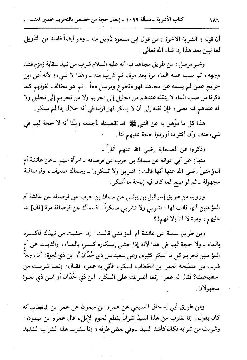 أَنَّ قَوْلَهُ " الشَّرْبَةُ الْآخِرَةُ " مِنْ قَوْلِ ابْنِ مَسْعُودٍ تَأْوِيلٌ مِنْهُ - وَهُوَ أَيْضًا فَاسِدٌ مِنْ التَّأْوِيلِ لِمَا نُبَيِّنُ بَعْدَ هَذَا إنْ شَاءَ اللَّهُ تَعَالَى. وَخَبَرٌ مُرْسَلٌ: مِنْ طَرِيقِ مُجَاهِدٍ فِيهِ «أَنَّهُ - عَلَيْهِ السَّلَامُ - شَرِبَ مِنْ نَبِيذِ سِقَايَةِ زَمْزَمَ فَشَدَّ وَجْهَهُ، ثُمَّ صَبَّ عَلَيْهِ الْمَاءَ مَرَّةً بَعْدَ مَرَّةٍ، ثُمَّ شَرِبَ مِنْهُ» - وَهَذَا لَا شَيْءَ؛ لِأَنَّهُ عَنْ ابْنِ جُرَيْجٍ عَمَّنْ لَمْ يُسَمِّهِ عَنْ مُجَاهِدٍ فَهُوَ مَقْطُوعٌ وَمُرْسَلٌ مَعًا - ثُمَّ هُوَ مُخَالِفٌ لِقَوْلِهِمْ كَمَا ذَكَرْنَا مِنْ أَنَّ صَبَّ الْمَاءِ لَا يَنْقُلُهُ عِنْدَهُمْ مِنْ تَحْلِيلٍ إلَى تَحْرِيمٍ وَلَا مِنْ تَحْرِيمٍ إلَى تَحْلِيلٍ وَلَا لَهُ عِنْدَهُمْ فِيهِ مَعْنًى، فَإِنْ نَقَلَهُ إلَى أَنْ لَا يُسْكِرَ فَهُوَ قَوْلُنَا فِي أَنَّهُ حَلَالٌ إذَا لَمْ يُسْكِرْ. هَذَا كُلُّ مَا مَوَّهُوا بِهِ عَنْ النَّبِيِّ - صَلَّى اللَّهُ عَلَيْهِ وَسَلَّمَ - قَدْ تَقَصَّيْنَاهُ بِأَجْمَعِهِ وَبَيَّنَّا أَنَّهُ لَا حُجَّةَ لَهُمْ فِي شَيْءٍ مِنْهُ، وَأَنَّ أَكْثَرَ مَا أَوْرَدُوا حُجَّةٌ عَلَيْهِمْ لَنَا. وَذَكَرُوا عَنْ الصَّحَابَةِ - رَضِيَ اللَّهُ عَنْهُمْ - آثَارًا -: مِنْهَا: عَنْ أَبِي عَوَانَةَ عَنْ سِمَاكِ بْنِ حَرْبٍ عَنْ قِرْصَافَةَ - امْرَأَةٌ مِنْهُمْ - عَنْ عَائِشَةَ أُمِّ الْمُؤْمِنِينَ - رَضِيَ اللَّهُ عَنْهَا - أَنَّهَا قَالَتْ: اشْرَبُوا وَلَا تَسْكَرُوا - وَسِمَاكٌ ضَعِيفٌ، وَقِرْصَافَةُ مَجْهُولَةٌ - ثُمَّ لَوْ صَحَّ لَمَا كَانَ فِيهِ إبَاحَةُ مَا أَسْكَرَ. وَرُوِّينَا مِنْ طَرِيقِ إسْرَائِيلَ بْنِ يُونُسَ عَنْ سِمَاكِ بْنِ حَرْبٍ عَنْ قِرْصَافَةَ عَنْ عَائِشَةَ أُمِّ الْمُؤْمِنِينَ أَنَّهَا قَالَتْ لَهَا: اشْرَبِي وَلَا تَشْرَبِي مُسْكِرًا - فَسِمَاكٌ عَنْ قِرْصَافَةَ مَرَّةً [قَالَ] لَنَا عَلَيْهِمْ، وَمَرَّةً لَا لَنَا وَلَا لَهُمْ؟ وَمِنْ طَرِيقِ سُمَيَّةَ عَنْ عَائِشَةَ أُمِّ الْمُؤْمِنِينَ قَالَتْ: إنْ خَشِيت مِنْ نَبِيذِك فَاكْسِرْهُ بِالْمَاءِ - وَلَا حُجَّةَ لَهُمْ فِي هَذَا لِأَنَّهُ إذَا خَشِيَ إسْكَارَهُ كَسَرَهُ بِالْمَاءِ، وَالثَّابِتُ عَنْ أُمِّ الْمُؤْمِنِينَ تَحْرِيمُ كُلِّ مَا أَسْكَرَ كَثِيرُهُ، وَعَنْ سَعِيدِ بْنِ ذِي حَدَّانَ أَوْ ابْنِ ذِي لَعْوَةَ: أَنَّ رَجُلًا شَرِبَ مِنْ سَطِيحَةٍ لِعُمَرَ بْنِ الْخَطَّابِ فَسَكِرَ، فَأُتِيَ بِهِ عُمَرَ، فَقَالَ: إنَّمَا شَرِبْت مِنْ سَطِيحَتِك؟ فَقَالَ لَهُ عُمَرُ: إنَّمَا أَضْرِبُك عَلَى السُّكْرِ، ابْنُ ذِي حَدَّانَ أَوْ ابْنُ ذِي لَعْوَةَ مَجْهُولَانِ. وَمِنْ طَرِيقِ أَبِي إِسْحَاقَ السَّبِيعِيِّ عَنْ عَمْرِو بْنِ مَيْمُونٍ عَنْ عُمَرَ بْنِ الْخَطَّابِ أَنَّهُ كَانَ يَقُولُ: إنَّا نَشْرَبُ مِنْ هَذَا النَّبِيذِ شَرَابًا يَقْطَعُ لُحُومَ الْإِبِلِ، قَالَ عَمْرُو بْنُ مَيْمُونٍ: وَشَرِبْت مِنْ شَرَابِهِ فَكَانَ كَأَشَدِّ النَّبِيذِ - وَفِي بَعْضِ طُرُقِهِ " إنَّا لَنَشْرَبُ هَذَا الشَّرَابَ الشَّدِيدَ