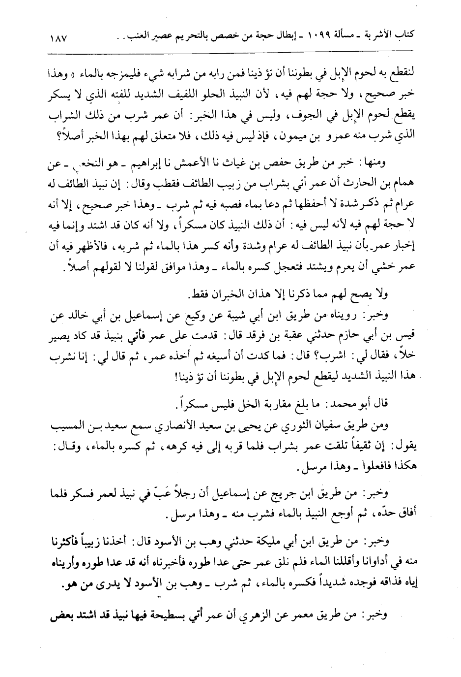 لِنَقْطَعَ بِهِ لُحُومَ الْإِبِلِ فِي بُطُونِنَا أَنْ تُؤْذِيَنَا فَمَنْ رَابَهُ مِنْ شَرَابِهِ شَيْءٌ فَلْيَمْزُجْهُ بِالْمَاءِ " وَهَذَا خَبَرٌ صَحِيحٌ وَلَا حُجَّةَ لَهُمْ فِيهِ، لِأَنَّ النَّبِيذَ الْحُلْوَ اللَّفِيفَ الشَّدِيدَ لِلَفْتِهِ الَّذِي لَا يُسْكِرُ يَقْطَعُ لُحُومَ الْإِبِلِ فِي الْجَوْفِ، لَيْسَ فِي هَذَا الْخَبَرِ: أَنَّ عُمَرَ شَرِبَ مِنْ ذَلِكَ الشَّرَابِ الَّذِي شَرِبَ مِنْهُ عَمْرُو بْنُ مَيْمُونٍ، فَإِذْ لَيْسَ فِيهِ ذَلِكَ، فَلَا مُتَعَلِّقَ لَهُمْ بِهَذَا الْخَبَرِ أَصْلًا؟ وَمِنْهَا: خَبَرٌ مِنْ طَرِيقِ حَفْصِ بْنِ غِيَاثٍ نا الْأَعْمَشُ نا إبْرَاهِيمُ هُوَ النَّخَعِيُّ - عَنْ هَمَّامِ بْنِ الْحَارِثِ أَنَّ عُمَرَ أُتِيَ بِشَرَابٍ مِنْ زَبِيبِ الطَّائِفِ فَقَطَّبَ وَقَالَ: إنَّ نَبِيذَ الطَّائِفِ لَهُ عُرَامٌ ثُمَّ ذَكَرَ شِدَّةً لَا أَحْفَظُهَا ثُمَّ دَعَا بِمَاءٍ فَصَبَّهُ فِيهِ ثُمَّ شَرِبَ - وَهَذَا خَبَرٌ صَحِيحٌ، إلَّا أَنَّهُ لَا حُجَّةَ لَهُمْ فِيهِ لِأَنَّهُ لَيْسَ فِيهِ: أَنَّ ذَلِكَ النَّبِيذَ كَانَ مُسْكِرًا، وَلَا أَنَّهُ كَانَ قَدْ اشْتَدَّ وَإِنَّمَا فِيهِ إخْبَارُ عُمَرَ بِأَنَّ نَبِيذَ الطَّائِفِ لَهُ عُرَامٌ وَشِدَّةٌ وَأَنَّهُ كَسَرَ هَذَا بِالْمَاءِ ثُمَّ شَرِبَهُ، فَالْأَظْهَرُ فِيهِ أَنَّ عُمَرَ خَشِيَ أَنْ يَعْرُمَ وَيَشْتَدَّ فَتَعَجَّلَ كَسْرَهُ بِالْمَاءِ - وَهَذَا مُوَافِقٌ لِقَوْلِنَا لَا لِقَوْلِهِمْ أَصْلًا. وَلَا يَصِحُّ لَهُمْ مِمَّا ذَكَرْنَا إلَّا هَذَانِ الْخَبَرَانِ فَقَطْ. وَخَبَرٌ: رُوِّينَاهُ مِنْ طَرِيقِ ابْنِ أَبِي شَيْبَةَ عَنْ وَكِيعٍ عَنْ إسْمَاعِيلَ بْنِ أَبِي خَالِدٍ عَنْ قَيْسِ بْنِ أَبِي حَازِمٍ حَدَّثَنِي عُقْبَةُ بْنُ فَرْقَدٍ قَالَ: قَدِمْت عَلَى عُمَرَ فَأُتِيَ بِنَبِيذٍ قَدْ كَادَ يَصِيرُ خَلًّا، فَقَالَ لِي: اشْرَبْ؟ قَالَ: فَمَا كِدْت أَنْ أَسِيغَهُ ثُمَّ أَخَذَهُ عُمَرُ، ثُمَّ قَالَ لِي: إنَّا نَشْرَبُ هَذَا النَّبِيذَ الشَّدِيدَ لِيَقْطَعَ لُحُومَ الْإِبِلِ فِي بُطُونِنَا أَنْ تُؤْذِيَنَا قَالَ أَبُو مُحَمَّدٍ: مَا بَلَغَ مُقَارَبَةَ الْخَلِّ فَلَيْسَ مُسْكِرًا. وَمِنْ طَرِيقِ سُفْيَانَ الثَّوْرِيِّ عَنْ يَحْيَى بْنِ سَعِيدٍ الْأَنْصَارِيِّ سَمِعَ سَعِيدَ بْنَ الْمُسَيِّبِ يَقُولُ: إنَّ ثَقِيفًا تَلَقَّتْ عُمَرَ بِشَرَابٍ فَلَمَّا قَرَّبَهُ إلَى فِيهِ كَرِهَهُ، ثُمَّ كَسَرَهُ بِالْمَاءِ، وَقَالَ: هَكَذَا فَافْعَلُوا - وَهَذَا مُرْسَلٌ. وَخَبَرٌ: مِنْ طَرِيقِ ابْنِ جُرَيْجٍ عَنْ إسْمَاعِيلَ أَنَّ رَجُلًا عَبَّ فِي نَبِيذٍ لِعُمَرَ فَسَكِرَ فَلَمَّا أَفَاقَ حَدَّهُ، ثُمَّ أَوْجَعَ النَّبِيذَ بِالْمَاءِ فَشَرِبَ مِنْهُ - وَهَذَا مُرْسَلٌ. وَخَبَرٌ: مِنْ طَرِيقِ ابْنِ أَبِي مُلَيْكَةَ حَدَّثَنِي وَهْبُ بْنُ الْأَسْوَدِ قَالَ: أَخَذْنَا زَبِيبًا فَأَكْثَرْنَا مِنْهُ فِي أَدَاوَانَا وَأَقْلَلْنَا الْمَاءَ فَلَمْ نَلْقَ عُمَرَ حَتَّى عَدَا طَوْرَهُ فَأَخْبَرْنَاهُ أَنَّهُ قَدْ عَدَا طَوْرَهُ وَأَرَيْنَاهُ إيَّاهُ فَذَاقَهُ فَوَجَدَهُ شَدِيدًا فَكَسَرَهُ بِالْمَاءِ، ثُمَّ شَرِبَ - وَهْبُ بْنُ الْأَسْوَدِ لَا يُدْرَى مَنْ هُوَ. وَخَبَرٌ: مِنْ طَرِيقِ مَعْمَرٍ عَنْ الزُّهْرِيِّ أَنَّ عُمَرَ أُتِيَ بِسَطِيحَةٍ فِيهَا نَبِيذٌ قَدْ اشْتَدَّ بَعْضَ