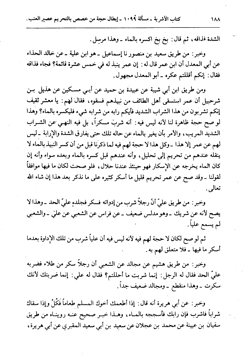 الشِّدَّةِ فَذَاقَهُ، ثُمَّ قَالَ: بَخٍ بَخٍ اكْسِرْهُ بِالْمَاءِ - وَهَذَا مُرْسَلٌ. وَخَبَرٌ: مِنْ طَرِيقِ سَعِيدِ بْنِ مَنْصُورٍ نا إسْمَاعِيلُ هُوَ ابْنُ عُلَيَّةَ - عَنْ خَالِدٍ الْحَذَّاءِ عَنْ أَبِي الْمُعَدِّلِ أَنَّ ابْنَ عُمَرَ قَالَ لَهُ: إنَّ عُمَرَ يُنْبَذُ لَهُ فِي خَمْسَ عَشْرَةَ قَائِمَةً؟ فَجَاءَ فَذَاقَهُ فَقَالَ: إنَّكُمْ أَقْلَلْتُمْ عَكَرَهُ - أَبُو الْمُعَدِّلِ مَجْهُولٌ. وَمِنْ طَرِيقِ ابْنِ أَبِي شَيْبَةَ عَنْ عُبَيْدَة بْنِ حُمَيْدٍ عَنْ أَبِي مِسْكِينٍ عَنْ هُذَيْلِ بْنِ شُرَحْبِيلَ أَنَّ عُمَرَ اسْتَسْقَى أَهْلَ الطَّائِفِ مِنْ نَبِيذِهِمْ فَسَقَوْهُ، فَقَالَ لَهُمْ: يَا مَعْشَرَ ثَقِيفٍ إنَّكُمْ تَشْرَبُونَ مِنْ هَذَا الشَّرَابِ الشَّدِيدِ فَأَيُّكُمْ رَابَهُ مِنْ شَرَابِهِ شَيْءٌ فَلْيَكْسِرْهُ بِالْمَاءِ؟ وَهَذَا لَوْ صَحَّ حُجَّةٌ ظَاهِرَةٌ لَنَا لِأَنَّهُ لَيْسَ فِيهِ: أَنَّهُ شَرِبَ مُسْكِرًا، بَلْ فِيهِ النَّهْيُ عَنْ الشَّرَابِ الشَّدِيدِ الْمُرِيبِ، وَالْأَمْرُ بِأَنْ يُغَيَّرَ بِالْمَاءِ عَنْ حَالِهِ تِلْكَ حَتَّى يُفَارِقَ الشِّدَّةَ وَالْإِرَابَةَ - لَيْسَ لَهُمْ عَنْ عُمَرَ إلَّا هَذَا - وَكُلُّ هَذَا لَا حُجَّةَ لَهُمْ فِيهِ لِمَا ذَكَرْنَا قَبْلُ مِنْ أَنَّ كَسْرَ النَّبِيذِ بِالْمَاءِ لَا يَنْقُلُهُ عِنْدَهُمْ مِنْ تَحْرِيمٍ إلَى تَحْلِيلٍ، وَأَنَّهُ عِنْدَهُمْ قَبْلَ كَسْرِهِ بِالْمَاءِ وَبَعْدَهُ سَوَاءٌ وَأَنَّهُ إنْ كَانَ الْمَاءُ يُخْرِجُهُ عَنْ الْإِسْكَارِ فَهُوَ حِينَئِذٍ عِنْدَنَا حَلَالٌ، فَلَوْ صَحَّتْ لَكَانَ مَا فِيهَا مُوَافِقًا لِقَوْلِنَا - وَقَدْ صَحَّ عَنْ عُمَرَ تَحْرِيمُ قَلِيلِ مَا أَسْكَرَ كَثِيرُهُ عَلَى مَا نَذْكُرُ بَعْدَ هَذَا إنْ شَاءَ اللَّهُ تَعَالَى. وَخَبَرٌ: مِنْ طَرِيقِ عَلِيٍّ أَنَّ رَجُلًا شَرِبَ مِنْ إدَاوَاتِهِ فَسَكِرَ فَجَلَدَهُ عَلِيٌّ الْحَدَّ - وَهَذَا لَا يَصِحُّ لِأَنَّهُ عَنْ شَرِيكٍ - وَهُوَ مُدَلِّسٌ ضَعِيفٌ - عَنْ فِرَاسٍ عَنْ الشَّعْبِيِّ عَنْ عَلِيٍّ - وَالشَّعْبِيِّ لَمْ يَسْمَعْ عَلِيًّا. ثُمَّ لَوْ صَحَّ لَكَانَ لَا حُجَّةَ لَهُمْ فِيهِ لِأَنَّهُ لَيْسَ فِيهِ أَنَّ عَلِيًّا شَرِبَ مِنْ تِلْكَ الْإِدَاوَةِ بَعْدَ مَا أَسْكَرَ مَا فِيهَا - فَلَا مُتَعَلِّقَ لَهُمْ بِهِ. وَخَبَرٌ: مِنْ طَرِيقِ هُشَيْمٍ عَنْ مُجَالِدٍ عَنْ الشَّعْبِيِّ أَنَّ رَجُلًا سَكِرَ مِنْ طِلَاءٍ فَضَرَبَهُ عَلِيٌّ الْحَدَّ فَقَالَ لَهُ الرَّجُلُ: إنَّمَا شَرِبْت مَا أَحْلَلْتُمْ؟ فَقَالَ لَهُ عَلِيٌّ: إنَّمَا ضَرَبْتُك لِأَنَّك سَكِرْت - وَهَذَا مُنْقَطِعٌ - وَمُجَالِدٌ ضَعِيفٌ جِدًّا. وَخَبَرٌ: عَنْ أَبِي هُرَيْرَةَ أَنَّهُ قَالَ: إذَا أَطْعَمَك أَخُوك الْمُسْلِمُ طَعَامًا فَكُلْ وَإِذَا سَقَاك شَرَابًا فَاشْرَبْ فَإِنْ رَابَك فَأَسْجُجْهُ بِالْمَاءِ، وَهَذَا خَبَرٌ صَحِيحٌ عَنْهُ رُوِّينَاهُ مِنْ طَرِيقِ سُفْيَانَ بْنِ عُيَيْنَةَ عَنْ مُحَمَّدِ بْنِ عَجْلَانَ عَنْ سَعِيدِ بْنِ أَبِي سَعِيدٍ الْمَقْبُرِيِّ عَنْ أَبِي هُرَيْرَةَ،