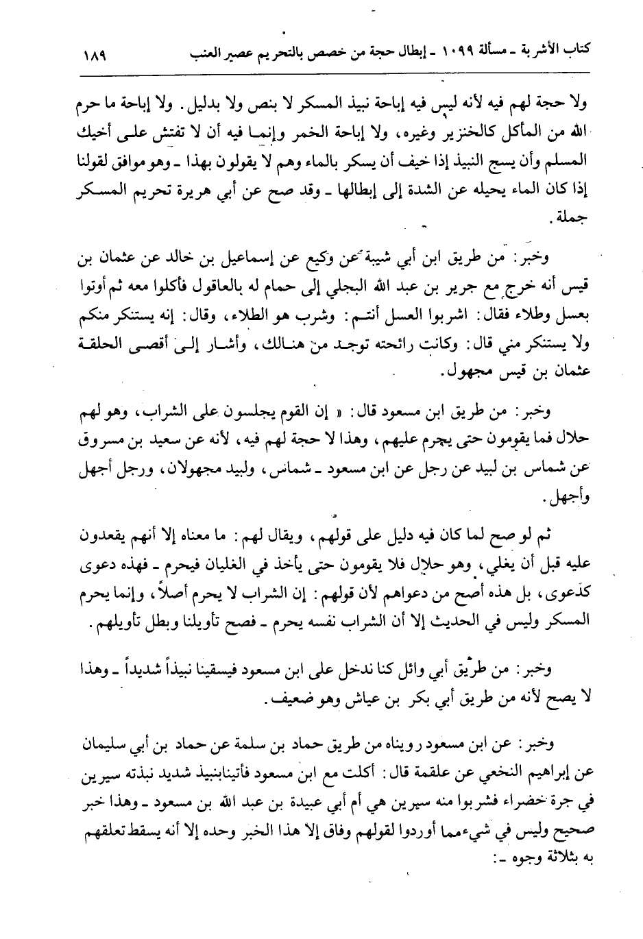 وَلَا حُجَّةَ لَهُمْ فِيهِ لِأَنَّهُ لَيْسَ فِيهِ إبَاحَةُ نَبِيذِ الْمُسْكِرِ لَا بِنَصٍّ وَلَا بِدَلِيلٍ. وَلَا إبَاحَةُ مَا حَرَّمَ اللَّهُ مِنْ الْمَأْكَلِ كَالْخِنْزِيرِ وَغَيْرِهِ، وَلَا إبَاحَةُ الْخَمْرِ وَإِنَّمَا فِيهِ أَنْ لَا تُفَتِّشَ عَلَى أَخِيك الْمُسْلِمِ وَأَنْ يُسَجَّ النَّبِيذُ إذَا خِيفَ أَنْ يُسْكِرَ بِالْمَاءِ وَهُمْ لَا يَقُولُونَ بِهَذَا - وَهُوَ مُوَافِقٌ لِقَوْلِنَا إذَا كَانَ الْمَاءُ يُحِيلُهُ عَنْ الشِّدَّةِ إلَى إبْطَالِهَا - وَقَدْ صَحَّ عَنْ أَبِي هُرَيْرَةَ تَحْرِيمُ الْمُسْكِرِ جُمْلَةً. وَخَبَرٌ: مِنْ طَرِيقِ ابْنِ أَبِي شَيْبَةَ عَنْ وَكِيعٍ عَنْ إسْمَاعِيلَ بْنِ خَالِدٍ عَنْ عُثْمَانَ بْنِ قَيْسٍ أَنَّهُ خَرَجَ مَعَ جَرِيرِ بْنِ عَبْدِ اللَّهِ الْبَجَلِيِّ إلَى حَمَّامٍ لَهُ بِالْعَاقُولِ فَأَكَلُوا مَعَهُ ثُمَّ أُوتُوا بِعَسَلٍ وَطِلَاءٍ فَقَالَ: اشْرَبُوا الْعَسَلَ أَنْتُمْ: وَشَرِبَ هُوَ الطِّلَاءَ، وَقَالَ: إنَّهُ يَسْتَنْكِرُ مِنْكُمْ وَلَا يَسْتَنْكِرُ مِنِّي قَالَ: وَكَانَتْ رَائِحَتُهُ تُوجَدُ مِنْ هُنَالِكَ، وَأَشَارَ إلَى أَقْصَى الْحَلْقَةِ عُثْمَانُ بْنُ قَيْسٍ مَجْهُولٌ. وَخَبَرٌ: مِنْ طَرِيقِ ابْنِ مَسْعُودٍ قَالَ: " إنَّ الْقَوْمَ يَجْلِسُونَ عَلَى الشَّرَابِ، وَهُوَ لَهُمْ حَلَالٌ فَمَا يَقُومُونَ حَتَّى يَحْرُمَ عَلَيْهِمْ، وَهَذَا لَا حُجَّةَ لَهُمْ فِيهِ، لِأَنَّهُ عَنْ سَعِيدِ بْنِ مَسْرُوقٍ عَنْ شِمَاسِ بْنِ لَبِيدٍ عَنْ رَجُلٍ عَنْ ابْنِ مَسْعُودٍ - شِمَاسٌ وَلَبِيدً مَجْهُولَانِ، وَرَجُلٌ أَجْهَلُ وَأَجْهَلُ. ثُمَّ لَوْ صَحَّ لَمَا كَانَ فِيهِ دَلِيلٌ عَلَى قَوْلِهِمْ، وَيُقَالُ لَهُمْ: مَا مَعْنَاهُ إلَّا أَنَّهُمْ يَقْعُدُونَ عَلَيْهِ قَبْلَ أَنْ يَغْلِيَ، وَهُوَ حَلَالٌ فَلَا يَقُومُونَ حَتَّى يَأْخُذَ فِي الْغَلَيَانِ فَيَحْرُمَ - فَهَذِهِ دَعْوَى كَدَعْوَى بَلْ هَذِهِ أَصَحُّ مِنْ دَعْوَاهُمْ لِأَنَّ قَوْلَهُمْ: إنَّ الشَّرَابَ لَا يَحْرُمُ أَصْلًا، وَإِنَّمَا يَحْرُمُ الْمُسْكِرُ وَلَيْسَ فِي الْحَدِيثِ إلَّا أَنَّ الشَّرَابَ نَفْسَهُ يَحْرُمُ - فَصَحَّ تَأْوِيلُنَا وَبَطَلَ تَأْوِيلُهُمْ. وَخَبَرٌ: مِنْ طَرِيقِ أَبِي وَائِلٍ كُنَّا نَدْخُلُ عَلَى ابْنِ مَسْعُودٍ فَيَسْقِينَا نَبِيذًا شَدِيدًا - وَهَذَا لَا يَصِحُّ لِأَنَّهُ مِنْ طَرِيقِ أَبِي بَكْرِ بْنِ عَيَّاشٍ وَهُوَ ضَعِيفٌ. وَخَبَرٌ: عَنْ ابْنِ مَسْعُودٍ رُوِّينَاهُ مِنْ طَرِيقِ حَمَّادِ بْنِ سَلَمَةَ عَنْ حَمَّادِ بْنِ أَبِي سُلَيْمَانَ عَنْ إبْرَاهِيمَ النَّخَعِيِّ عَنْ عَلْقَمَةَ قَالَ: أَكَلْت مَعَ ابْنِ مَسْعُودٍ فَأُتِينَا بِنَبِيذٍ شَدِيدٍ نَبَذَتْهُ سِيرِينَ فِي جَرَّةٍ خَضْرَاءَ فَشَرِبُوا مِنْهُ سِيرِينَ هِيَ أُمُّ أَبِي عُبَيْدَةَ بْنِ عَبْدِ اللَّهِ بْنِ مَسْعُودٍ - وَهَذَا خَبَرٌ صَحِيحٌ وَلَيْسَ فِي شَيْءٍ مِمَّا أَوْرَدُوا لِقَوْلِهِمْ وِفَاقٌ إلَّا هَذَا الْخَبَرُ وَحْدَهُ إلَّا أَنَّهُ يُسْقِطُ تَعَلُّقَهُمْ بِهِ بِثَلَاثَةِ وُجُوهٍ -: