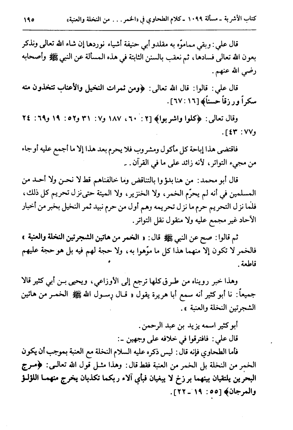 قَالَ عَلِيٌّ: وَبَقِيَ مِمَّا مَوَّهَ بِهِ مُقَلِّدُو أَبِي حَنِيفَةَ أَشْيَاءَ نُورِدُهَا إنْ شَاءَ اللَّهُ تَعَالَى وَنَذْكُرُ بِعَوْنِ اللَّهِ تَعَالَى فَسَادَهَا، ثُمَّ نُعَقِّبُ بِالسُّنَنِ الثَّابِتَةِ فِي هَذِهِ الْمَسْأَلَةِ عَنْ النَّبِيِّ - صَلَّى اللَّهُ عَلَيْهِ وَسَلَّمَ - وَأَصْحَابِهِ - رَضِيَ اللَّهُ عَنْهُمْ -. قَالَ عَلِيٌّ: قَالُوا: قَالَ اللَّهُ تَعَالَى: {وَمِنْ ثَمَرَاتِ النَّخِيلِ وَالأَعْنَابِ تَتَّخِذُونَ مِنْهُ سَكَرًا وَرِزْقًا حَسَنًا} [النحل: 67] . وَقَالَ تَعَالَى: {كُلُوا وَاشْرَبُوا} [البقرة: 60] . فَاقْتَضَى هَذَا إبَاحَةَ كُلِّ مَأْكُولٍ وَمَشْرُوبٍ فَلَا يَحْرُمُ بَعْدَ هَذَا إلَّا مَا أُجْمِعَ عَلَيْهِ أَوْ جَاءَ مِنْ مَجِيءِ التَّوَاتُرِ، لِأَنَّهُ زَائِدٌ عَلَى مَا فِي الْقُرْآنِ. قَالَ أَبُو مُحَمَّدٍ: مِنْ هُنَا بَدَءُوا بِالتَّنَاقُضِ وَمَا خَالَفْنَاهُمْ قَطُّ لَا نَحْنُ وَلَا أَحَدٌ مِنْ الْمُسْلِمِينَ فِي أَنَّهُ لَمْ يُحَرِّمْ الْخَمْرَ، وَلَا الْخِنْزِيرَ، وَلَا الْمَيْتَةَ حَتَّى نَزَلَ تَحْرِيمُ كُلِّ ذَلِكَ، فَلَمَّا نَزَلَ التَّحْرِيمُ حَرَّمَ مَا نَزَلَ تَحْرِيمُهُ وَهُمْ أَوَّلُ مَنْ حَرَّمَ نَبِيذَ ثَمَرِ النَّخِيلِ بِخَبَرٍ مِنْ أَخْبَارِ الْآحَادِ غَيْرِ مُجْمَعٍ عَلَيْهِ وَلَا مَنْقُولٍ نَقْلَ التَّوَاتُرِ. ثُمَّ قَالُوا: صَحَّ عَنْ النَّبِيِّ - صَلَّى اللَّهُ عَلَيْهِ وَسَلَّمَ - قَالَ: «الْخَمْرُ مِنْ هَاتَيْنِ الشَّجَرَتَيْنِ النَّخْلَةِ وَالْعِنَبَةِ» فَالْخَمْرُ لَا تَكُونُ إلَّا مِنْهُمَا هَذَا كُلُّ مَا مَوَّهُوا بِهِ، وَلَا حُجَّةَ لَهُمْ فِيهِ بَلْ هُوَ حُجَّةٌ عَلَيْهِمْ قَاطِعَةٌ. وَهَذَا خَبَرٌ رُوِّينَاهُ مِنْ طُرُقٍ كُلِّهَا تَرْجِعُ إلَى الْأَوْزَاعِيِّ، وَيَحْيَى بْنِ أَبِي كَثِيرٍ قَالَا جَمِيعًا: نا أَبُو كَثِيرٍ أَنَّهُ سَمِعَ أَبَا هُرَيْرَةَ يَقُولُ قَالَ رَسُولُ اللَّهِ - صَلَّى اللَّهُ عَلَيْهِ وَسَلَّمَ - «الْخَمْرُ مِنْ هَاتَيْنِ الشَّجَرَتَيْنِ النَّخْلَةِ وَالْعِنَبَةِ» . أَبُو كَثِيرٍ اسْمُهُ يَزِيدُ بْنُ عَبْدِ الرَّحْمَنِ. قَالَ عَلِيٌّ: فَافْتَرَقُوا فِي خِلَافِهِ عَلَى وَجْهَيْنِ -: فَأَمَّا الطَّحَاوِيُّ فَإِنَّهُ قَالَ: لَيْسَ ذِكْرُهُ - عَلَيْهِ السَّلَامُ - النَّخْلَةَ مَعَ الْعِنَبَةِ بِمُوجِبٍ أَنْ يَكُونَ الْخَمْرُ مِنْ النَّخْلَةِ بَلْ الْخَمْرُ مِنْ الْعِنَبَةِ فَقَطْ قَالَ: وَهَذَا مِثْلُ قَوْلِ اللَّهِ تَعَالَى: {مَرَجَ الْبَحْرَيْنِ يَلْتَقِيَانِ} [الرحمن: 19] {بَيْنَهُمَا بَرْزَخٌ لا يَبْغِيَانِ} [الرحمن: 20] {فَبِأَيِّ آلاءِ رَبِّكُمَا تُكَذِّبَانِ} [الرحمن: 21] {يَخْرُجُ مِنْهُمَا اللُّؤْلُؤُ وَالْمَرْجَانُ} [الرحمن: 22] .