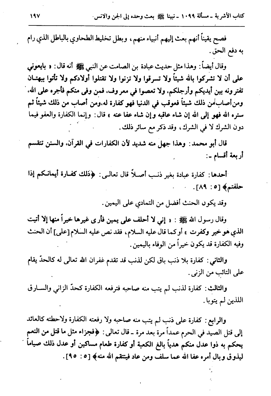فَصَحَّ يَقِينًا أَنَّهُمْ بُعِثَ إلَيْهِمْ أَنْبِيَاءُ مِنْهُمْ، وَبَطَلَ تَخْلِيطُ الطَّحَاوِيِّ بِالْبَاطِلِ الَّذِي رَامَ بِهِ دَفْعَ الْحَقِّ. وَقَالَ أَيْضًا: وَهَذَا مِنْ حَدِيثِ عُبَادَةَ بْنِ الصَّامِتِ عَنْ النَّبِيِّ - صَلَّى اللَّهُ عَلَيْهِ وَسَلَّمَ - أَنَّهُ قَالَ: «بَايِعُونِي عَلَى أَنْ لَا تُشْرِكُوا بِاَللَّهِ شَيْئًا وَلَا تَسْرِقُوا وَلَا تَزْنُوا وَلَا تَقْتُلُوا أَوْلَادَكُمْ وَلَا تَأْتُوا بِبُهْتَانٍ تَفْتَرُونَهُ بَيْنَ أَيْدِيكُمْ وَأَرْجُلِكُمْ، وَلَا تَعْصُوا فِي مَعْرُوفٍ، فَمَنْ وَفَّى مِنْكُمْ فَأَجْرُهُ عَلَى اللَّهِ، وَمَنْ أَصَابَ مِنْ ذَلِكَ شَيْئًا فَعُوقِبَ فِي الدُّنْيَا فَهُوَ كَفَّارَةٌ لَهُ، وَمَنْ أَصَابَ مِنْ ذَلِكَ شَيْئًا ثُمَّ سَتَرَهُ اللَّهُ فَهُوَ إلَى اللَّهِ إنْ شَاءَ عَاقَبَهُ وَإِنْ شَاءَ عَفَا عَنْهُ» قَالَ: وَإِنَّمَا الْكَفَّارَةُ وَالْعَفْوُ فِيمَا دُونَ الشِّرْكِ لَا فِي الشِّرْكِ، وَقَدْ ذُكِرَ مَعَ سَائِرِ ذَلِكَ. قَالَ أَبُو مُحَمَّدٍ: وَهَذَا جَهْلٌ مِنْهُ شَدِيدٌ لِأَنَّ الْكَفَّارَاتِ فِي الْقُرْآنِ، وَالسُّنَنِ تَنْقَسِمُ أَرْبَعَةَ أَقْسَامٍ -: أَحَدُهَا: كَفَّارَةُ عِبَادَةٍ بِغَيْرِ ذَنْبٍ أَصْلًا قَالَ تَعَالَى: {ذَلِكَ كَفَّارَةُ أَيْمَانِكُمْ إِذَا حَلَفْتُمْ} [المائدة: 89] . وَقَدْ يَكُونُ الْحِنْثُ أَفْضَلَ مِنْ التَّمَادِي عَلَى الْيَمِينِ وَقَالَ رَسُولُ اللَّهِ - صَلَّى اللَّهُ عَلَيْهِ وَسَلَّمَ -: «إنِّي لَا أَحْلِفُ عَلَى يَمِينٍ فَأَرَى غَيْرَهَا خَيْرًا مِنْهَا إلَّا أَتَيْتُ الَّذِي هُوَ خَيْرٌ وَكَفَّرْتُ» أَوْ كَمَا قَالَ - عَلَيْهِ السَّلَامُ -، فَقَدْ نَصَّ - عَلَيْهِ السَّلَامُ -[عَلَى] أَنَّ الْحِنْثَ وَفِيهِ الْكَفَّارَةُ قَدْ يَكُونُ خَيْرًا مِنْ الْوَفَاءِ بِالْيَمِينِ. وَالثَّانِي: كَفَّارَةٌ بِلَا ذَنْبٍ بَاقٍ لَكِنْ لِذَنْبٍ قَدْ تَقَدَّمَ غُفْرَانُ اللَّهِ تَعَالَى لَهُ كَالْحَدِّ يُقَامُ عَلَى التَّائِبِ مِنْ الزِّنَى. وَالثَّالِثُ: كَفَّارَةٌ لِذَنْبٍ لَمْ يَتُبْ مِنْهُ صَاحِبُهُ فَتَرْفَعُهُ الْكَفَّارَةُ كَحَدِّ الزَّانِي وَالسَّارِقِ اللَّذَيْنِ لَمْ يَتُوبَا. وَالرَّابِعُ: كَفَّارَةٌ عَلَى ذَنْبٍ لَمْ يَتُبْ مِنْهُ صَاحِبُهُ وَلَا رَفَعَتْهُ الْكَفَّارَةُ وَلَا حَطَّتْهُ كَالْعَائِدِ إلَى قَتْلِ الصَّيْدِ فِي الْحَرَمِ عَمْدًا مَرَّةً بَعْدَ مَرَّةٍ - قَالَ تَعَالَى: {فَجَزَاءٌ مِثْلُ مَا قَتَلَ مِنَ النَّعَمِ يَحْكُمُ بِهِ ذَوَا عَدْلٍ مِنْكُمْ هَدْيًا بَالِغَ الْكَعْبَةِ أَوْ كَفَّارَةٌ طَعَامُ مَسَاكِينَ أَوْ عَدْلُ ذَلِكَ صِيَامًا لِيَذُوقَ وَبَالَ أَمْرِهِ عَفَا اللَّهُ عَمَّا سَلَفَ وَمَنْ عَادَ فَيَنْتَقِمُ اللَّهُ مِنْهُ} [المائدة: 95] .