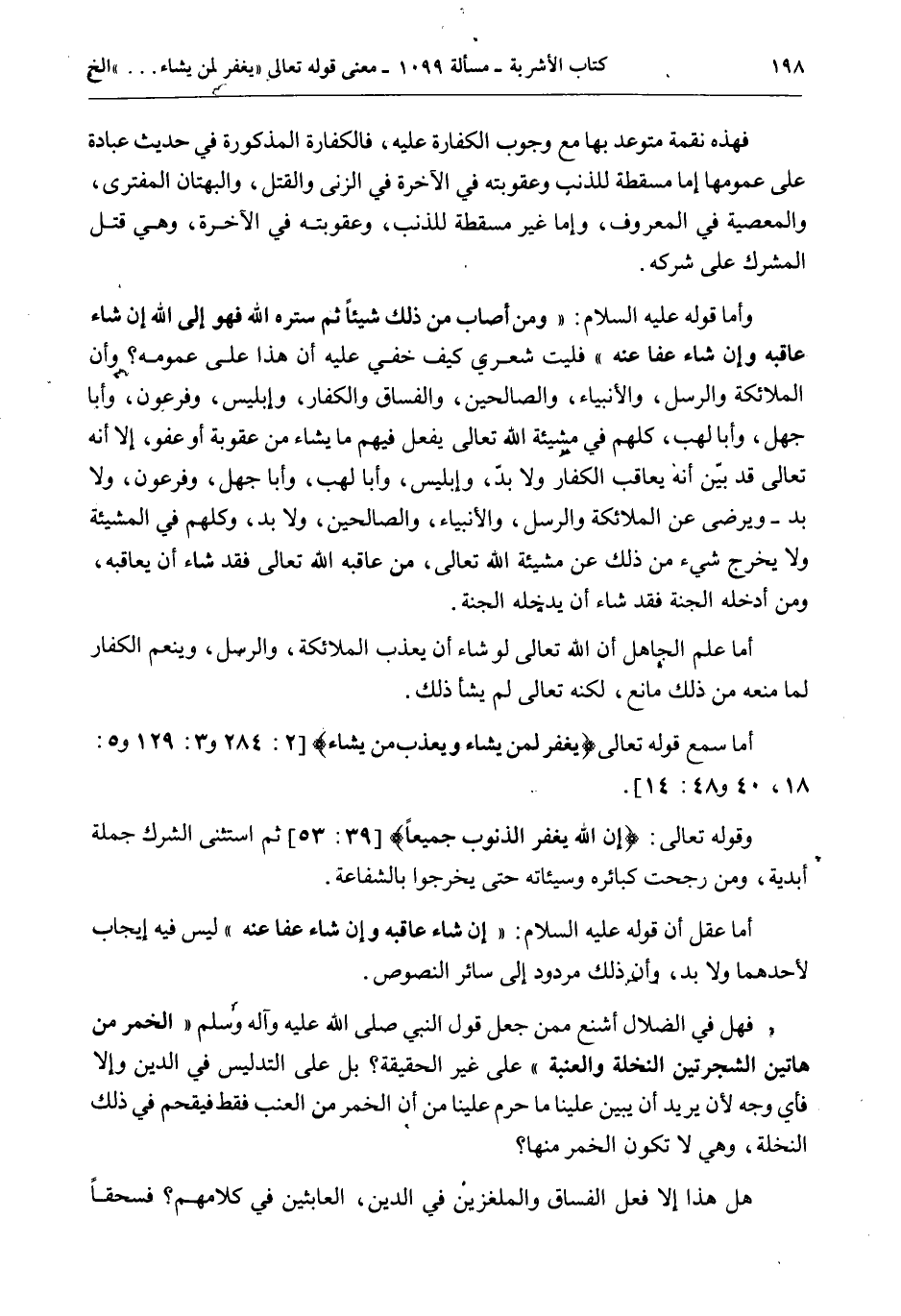 فَهَذِهِ نِقْمَةٌ مُتَوَعَّدٌ بِهَا مَعَ وُجُوبِ الْكَفَّارَةِ عَلَيْهِ، فَالْكَفَّارَةُ الْمَذْكُورَةُ فِي حَدِيثِ عُبَادَةَ عَلَى عُمُومِهَا إمَّا مُسْقِطَةٌ لِلذَّنْبِ وَعُقُوبَتُهُ فِي الْآخِرَةِ فِي الزِّنَى وَالْقَتْلِ، وَالْبُهْتَانِ الْمُفْتَرَى، وَالْمَعْصِيَةِ فِي الْمَعْرُوفِ، وَإِمَّا غَيْرُ مُسْقِطَةٍ لِلذَّنْبِ، وَعُقُوبَتُهُ فِي الْآخِرَةِ، وَهِيَ قَتْلُ الْمُشْرِكِ عَلَى شِرْكِهِ. وَأَمَّا قَوْلُهُ - عَلَيْهِ السَّلَامُ -: «وَمَنْ أَصَابَ مِنْ ذَلِكَ شَيْئًا ثُمَّ سَتَرَهُ اللَّهُ فَهُوَ إلَى اللَّهِ إنْ شَاءَ عَاقَبَهُ وَإِنْ شَاءَ عَفَا عَنْهُ» فَلَيْتَ شِعْرِي كَيْفَ خَفِيَ عَلَيْهِ أَنَّ هَذَا عَلَى عُمُومِهِ؟ وَأَنَّ الْمَلَائِكَةَ وَالرُّسُلَ، وَالْأَنْبِيَاءَ، وَالصَّالِحِينَ، وَالْفُسَّاقَ وَالْكُفَّارَ، وَإِبْلِيسَ، وَفِرْعَوْنَ، وَأَبَا جَهْلٍ، وَأَبَا لَهَبٍ، كُلَّهُمْ فِي مَشِيئَةِ اللَّهِ تَعَالَى يَفْعَلُ فِيهِمْ مَا يَشَاءُ مِنْ عُقُوبَةٍ أَوْ عَفْوٍ، إلَّا أَنَّهُ تَعَالَى قَدْ بَيَّنَ أَنَّهُ يُعَاقِبُ الْكُفَّارَ وَلَا بُدَّ، وَإِبْلِيسَ، وَأَبَا لَهَبٍ، وَأَبَا جَهْلٍ، وَفِرْعَوْنَ، وَلَا بُدَّ - وَيَرْضَى عَنْ الْمَلَائِكَةِ وَالرُّسُلِ، وَالْأَنْبِيَاءِ، وَالصَّالِحِينَ، وَلَا بُدَّ، وَكُلُّهُمْ فِي الْمَشِيئَةِ وَلَا يَخْرُجُ شَيْءٌ مِنْ ذَلِكَ عَنْ مَشِيئَةِ اللَّهِ تَعَالَى، مَنْ عَاقَبَهُ اللَّهُ تَعَالَى فَقَدْ شَاءَ أَنْ يُعَاقِبَهُ، وَمَنْ أَدْخَلَهُ الْجَنَّةَ فَقَدْ شَاءَ أَنْ يُدْخِلَهُ الْجَنَّةَ. أَمَّا عِلْمُ الْجَاهِلِ أَنَّ اللَّهَ تَعَالَى لَوْ شَاءَ أَنْ يُعَذِّبَ الْمَلَائِكَةَ، وَالرُّسُلَ، وَيُنْعِمَ الْكُفَّارَ لَمَا مَنَعَهُ مِنْ ذَلِكَ مَانِعٌ، لَكِنَّهُ تَعَالَى لَمْ يَشَأْ ذَلِكَ. أَمَا سَمِعَ قَوْله تَعَالَى {يَغْفِرُ لِمَنْ يَشَاءُ وَيُعَذِّبُ مَنْ يَشَاءُ} [آل عمران: 129] وقَوْله تَعَالَى: {إِنَّ اللَّهَ يَغْفِرُ الذُّنُوبَ جَمِيعًا} [الزمر: 53] ثُمَّ اسْتَثْنَى الشِّرْكَ جُمْلَةً أَبَدِيَّةً، وَمَنْ رَجَحَتْ كَبَائِرُهُ وَسَيِّئَاتُهُ حَتَّى يَخْرُجُوا بِالشَّفَاعَةِ. أَمَا عَقَلَ أَنَّ قَوْلَهُ - عَلَيْهِ السَّلَامُ -: «إنْ شَاءَ عَاقَبَهُ وَإِنْ شَاءَ عَفَا عَنْهُ» لَيْسَ فِيهِ إيجَابٌ لِأَحَدِهِمَا وَلَا بُدَّ، وَأَنَّ ذَلِكَ مَرْدُودٌ إلَى سَائِرِ النُّصُوصِ. فَهَلْ فِي الضَّلَالِ أَشْنَعُ مِمَّنْ جَعَلَ قَوْلَ النَّبِيِّ - صَلَّى اللَّهُ عَلَيْهِ وَآلِهِ وَسَلَّمَ - «الْخَمْرُ مِنْ هَاتَيْنِ الشَّجَرَتَيْنِ النَّخْلَةِ وَالْعِنَبَةِ» عَلَى غَيْرِ الْحَقِيقَةِ؟ بَلْ عَلَى التَّدْلِيسِ فِي الدِّينِ وَإِلَّا فَأَيُّ وَجْهٍ لَأَنْ يُرِيدَ أَنْ يُبَيِّنَ عَلَيْنَا مَا حَرَّمَ عَلَيْنَا مِنْ أَنَّ الْخَمْرَ مِنْ الْعِنَبِ فَقَطْ فَيُقْحِمَ فِي ذَلِكَ النَّخْلَةَ، وَهِيَ لَا تَكُونُ الْخَمْرُ مِنْهَا؟ هَلْ هَذَا إلَّا فِعْلُ الْفُسَّاقِ وَالْمُلْغِزِينَ فِي الدِّينِ، الْعَابِثِينَ فِي كَلَامِهِمْ؟ فَسُحْقًا