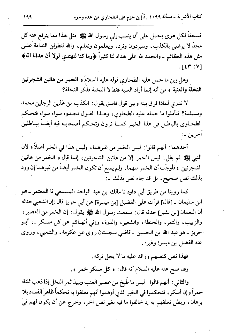 فَسُحْقًا لِكُلِّ هَوًى يُحْمَلُ عَلَى أَنْ يُنْسَبَ إلَى رَسُولِ اللَّهِ - صَلَّى اللَّهُ عَلَيْهِ وَسَلَّمَ - مِثْلُ مِمَّا يَتَرَفَّعُ عَنْهُ كُلُّ مُجِدٍّ لَا يَرْضَى بِالْكَذِبِ، وَسَيُرَدُّونَ وَنُرَدُّ، وَيَعْلَمُونَ وَنَعْلَمُ، وَاَللَّهِ لَتَطُولَن النَّدَامَةُ عَلَى مِثْلِ هَذِهِ الْعَظَائِمِ - وَالْحَمْدُ لِلَّهِ عَلَى هُدَاهُ لَنَا كَثِيرًا {وَمَا كُنَّا لِنَهْتَدِيَ لَوْلا أَنْ هَدَانَا اللَّهُ} [الأعراف: 43] . وَهَلْ بَيَّنَ مَا حَمَلَ عَلَيْهِ الطَّحَاوِيُّ قَوْلَهُ - عَلَيْهِ السَّلَامُ - «الْخَمْرُ مِنْ هَاتَيْنِ الشَّجَرَتَيْنِ النَّخْلَةِ وَالْعِنَبَةِ» مِنْ أَنَّهُ إنَّمَا أَرَادَ الْعِنَبَةَ فَقَطْ لَا النَّخْلَةَ فَذَكَرَ النَّخْلَةَ؟ لَا نَدْرِي لِمَاذَا فَرَّقَ بَيْنَهُ وَبَيْنَ قَوْلِ فَاسِقٍ يَقُولُ: الْكَذِبُ مِنْ هَذَيْنِ الرَّجُلَيْنِ مُحَمَّدٍ وَمُسَيْلِمَةِ؟ فَتَأَمَّلُوا مَا حَمَلَهُ عَلَيْهِ الطَّحَاوِيُّ، وَهَذَا الْقَوْلُ تَجِدُوهُ سَوَاءً سَوَاءً فَتَحَكَّمَ الطَّحَاوِيُّ بِالْبَاطِلِ فِي هَذَا الْخَبَرِ كَمَا تَرَوْنَ وَتَحَكَّمَ أَصْحَابُهُ فِيهِ أَيْضًا بِبَاطِلَيْنِ آخَرَيْنِ -: أَحَدُهُمَا: أَنَّهُمْ قَالُوا: لَيْسَ الْخَمْرُ مِنْ غَيْرِهِمَا، وَلَيْسَ هَذَا فِي الْخَبَرِ أَصْلًا؛ لِأَنَّ النَّبِيَّ - صَلَّى اللَّهُ عَلَيْهِ وَسَلَّمَ - لَمْ يَقُلْ: لَيْسَ الْخَمْرُ إلَّا مِنْ هَاتَيْنِ الشَّجَرَتَيْنِ، إنَّمَا قَالَ «الْخَمْرُ مِنْ هَاتَيْنِ الشَّجَرَتَيْنِ» فَأَوْجَبَ أَنَّ الْخَمْرَ مِنْهُمَا، وَلَمْ يَمْنَعْ أَنْ تَكُونَ الْخَمْرُ أَيْضًا مِنْ غَيْرِهِمَا إنْ وَرَدَ بِذَلِكَ نَصٌّ صَحِيحٌ، بَلْ قَدْ جَاءَ نَصٌّ بِذَلِكَ -: كَمَا رُوِّينَا مِنْ طَرِيقِ أَبِي دَاوُد نا مَالِكُ بْنُ عَبْدِ الْوَاحِدِ الْمِسْمَعِيُّ نا الْمُعْتَمِرُ هُوَ ابْنُ سُلَيْمَانَ -[قَالَ] قَرَأْت عَلَى الْفُضَيْلِ بْنِ مَيْسَرَةَ عَنْ أَبِي حَرِيزٍ قَالَ: إنَّ الشَّعْبِيَّ حَدَّثَهُ أَنَّ النُّعْمَانَ بْنَ بَشِيرٍ حَدَّثَهُ قَالَ: سَمِعْت رَسُولَ اللَّهِ - صَلَّى اللَّهُ عَلَيْهِ وَسَلَّمَ - يَقُولُ: «إنَّ الْخَمْرَ مِنْ الْعَصِيرِ، وَالزَّبِيبِ، وَالتَّمْرِ، وَالْحِنْطَةِ، وَالشَّعِيرِ، وَالذُّرَةِ، وَإِنِّي أَنْهَاكُمْ عَنْ كُلِّ مُسْكِرٍ» -: أَبُو حَرِيزٍ هُوَ عَبْدُ اللَّهِ بْنُ الْحُسَيْنِ - قَاضِي سِجِسْتَانَ رَوَى عَنْ عِكْرِمَةَ، وَالشَّعْبِيِّ، وَرَوَى عَنْهُ الْفَضْلُ بْنُ مَيْسَرَةَ وَغَيْرُهُ. فَهَذَا نَصٌّ كَنَصِّهِمْ وَزَائِدٌ عَلَيْهِ مَا لَا يَحِلُّ تَرْكُهُ. وَقَدْ صَحَّ عَنْهُ - عَلَيْهِ السَّلَامُ - أَنَّهُ قَالَ: «كُلُّ مُسْكِرٍ خَمْرٌ» . وَالثَّانِي: أَنَّهُمْ قَالُوا: لَيْسَ مَا طُبِخَ مِنْ عَصِيرِ الْعِنَبِ وَنَبِيذِ ثَمَرِ النَّخْلِ إذَا ذَهَبَ ثُلُثَاهُ خَمْرًا وَإِنْ أَسْكَرَ، فَتَحَكَّمُوا فِي الْخَبَرِ الَّذِي أَوْهَمُوا أَنَّهُمْ تَعَلَّقُوا بِهِ تَحَكُّمًا ظَاهِرَ الْفَسَادِ بِلَا بُرْهَانٍ، وَبَطَلَ تَعَلُّقُهُمْ بِهِ إذْ خَالَفُوا مَا فِيهِ بِغَيْرِ نَصٍّ آخَرَ، وَخَرَجَ عَنْ أَنْ يَكُونَ لَهُمْ فِي