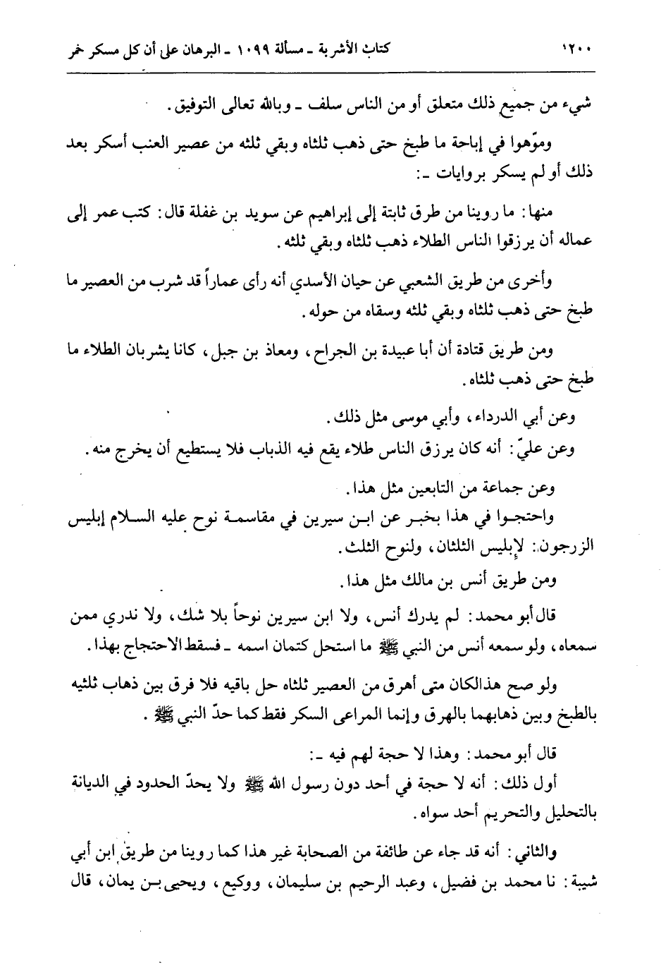 وَمَوَّهُوا فِي إبَاحَةِ مَا طُبِخَ حَتَّى ذَهَبَ ثُلُثَاهُ وَبَقِيَ ثُلُثُهُ مِنْ عَصِيرِ الْعِنَبِ أَسْكَرَ بَعْدَ ذَلِكَ أَوْ لَمْ يُسْكِرْ بِرِوَايَاتٍ -: مِنْهَا: مَا رُوِّينَا مِنْ طُرُقٍ ثَابِتَةٍ إلَى إبْرَاهِيمَ عَنْ سُوَيْد بْنِ غَفَلَةَ قَالَ: كَتَبَ عُمَرُ إلَى عُمَّالِهِ أَنْ يَرْزُقُوا النَّاسَ الطِّلَاءَ ذَهَبَ ثُلُثَاهُ وَبَقِيَ ثُلُثُهُ. وَأُخْرَى مِنْ طَرِيقِ الشَّعْبِيِّ عَنْ حَيَّانَ الْأَسَدِيِّ أَنَّهُ رَأَى عَمَّارًا قَدْ شَرِبَ مِنْ الْعَصِيرِ مَا طُبِخَ حَتَّى ذَهَبَ ثُلُثَاهُ وَبَقِيَ ثُلُثُهُ وَسَقَاهُ مَنْ حَوْلَهُ. وَمِنْ طَرِيقِ قَتَادَةَ أَنَّ أَبَا عُبَيْدَةَ بْنِ الْجَرَّاحِ، وَمُعَاذَ بْنَ جَبَلٍ، كَانَا يَشْرَبَانِ الطِّلَاءَ مَا طُبِخَ حَتَّى ذَهَبَ ثُلُثَاهُ. وَعَنْ أَبِي الدَّرْدَاءِ، وَأَبِي مُوسَى مِثْلُ ذَلِكَ. وَعَنْ عَلِيٍّ: أَنَّهُ كَانَ يَرْزُقُ النَّاسَ طِلَاءً يَقَعُ فِيهِ الذُّبَابُ فَلَا يَسْتَطِيعُ أَنْ يَخْرُجَ مِنْهُ. وَعَنْ جَمَاعَةٍ مِنْ التَّابِعِينَ مِثْلُ هَذَا. وَاحْتَجُّوا فِي هَذَا بِخَبَرٍ عَنْ ابْنِ سِيرِينَ فِي مُقَاسَمَةِ نُوحٍ - عَلَيْهِ السَّلَامُ - إبْلِيسَ الزَّرْجُونَ: لِإِبْلِيسِ الثُّلُثَانِ، وَلِنُوحٍ الثُّلُثُ. وَمِنْ طَرِيقِ أَنَسِ بْنِ مَالِكٍ مِثْلُ هَذَا. قَالَ أَبُو مُحَمَّدٍ: لَمْ يُدْرِكْ أَنَسٌ، وَلَا ابْنُ سِيرِينَ نُوحًا بِلَا شَكٍّ، وَلَا نَدْرِي مِمَّنْ سَمِعَاهُ، وَلَوْ سَمِعَهُ أَنَسٌ مِنْ النَّبِيِّ - صَلَّى اللَّهُ عَلَيْهِ وَسَلَّمَ - مَا اسْتَحَلَّ كِتْمَانَ اسْمِهِ - فَسَقَطَ الِاحْتِجَاجُ بِهَذَا. وَلَوْ صَحَّ هَذَا لَكَانَ مَتَى أُهْرِقَ مِنْ الْعَصِيرِ ثُلُثَاهُ حَلَّ بَاقِيهِ فَلَا فَرْقَ بَيْنَ ذَهَابِ ثُلُثَيْهِ بِالطَّبْخِ وَبَيْنَ ذَهَابِهِمَا بِالْهَرْقِ وَإِنَّمَا الْمُرَاعَى السُّكْرُ فَقَطْ كَمَا حَدَّ النَّبِيُّ - صَلَّى اللَّهُ عَلَيْهِ وَسَلَّمَ -. قَالَ أَبُو مُحَمَّدٍ: وَهَذَا لَا حُجَّةَ لَهُمْ فِيهِ -: أَوَّلُ ذَلِكَ: أَنَّهُ لَا حُجَّةَ فِي أَحَدٍ دُونَ رَسُولِ اللَّهِ - صَلَّى اللَّهُ عَلَيْهِ وَسَلَّمَ - وَلَا يَحُدُّ الْحُدُودَ فِي الدِّيَانَةِ بِالتَّحْلِيلِ وَالتَّحْرِيمِ أَحَدٌ سِوَاهُ. وَالثَّانِي: أَنَّهُ قَدْ جَاءَ عَنْ طَائِفَةٍ مِنْ الصَّحَابَةِ غَيْرُ هَذَا كَمَا رُوِّينَا مِنْ طَرِيقِ ابْنِ أَبِي شَيْبَةَ: نا مُحَمَّدُ بْنُ فُضَيْلٍ، وَعَبْدُ الرَّحِيمِ بْنُ سُلَيْمَانَ، وَوَكِيعٌ، وَيَحْيَى بْنُ يَمَانٍ، قَالَ