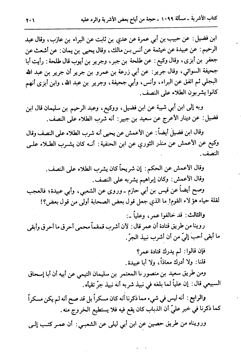 ابْنُ فُضَيْلٍ: عَنْ حَبِيبِ بْنِ أَبِي عَمْرَةَ عَنْ عَدِيِّ بْنِ ثَابِتٍ عَنْ الْبَرَاءِ بْنِ عَازِبٍ، وَقَالَ عَبْدُ الرَّحِيمِ: عَنْ عُبَيْدَةَ عَنْ خَيْثَمَةَ عَنْ أَنَسِ بْنِ مَالِكٍ، قَالَ يَحْيَى بْنُ يَمَانٍ: عَنْ أَشْعَثَ عَنْ جَعْفَرِ بْنِ أَبْزَى، وَقَالَ وَكِيعٌ: عَنْ طَلْحَةَ بْنِ جَبْرٍ، وَجَرِيرِ بْنِ أَيُّوبَ قَالَ طَلْحَةُ: رَأَيْت أَبَا جُحَيْفَةَ السُّوَائِيَّ، وَقَالَ جَرِيرٌ: عَنْ أَبِي زُرْعَةَ بْنِ عَمْرِو بْنِ جَرِيرٍ أَنَّ جَرِيرَ بْنَ عَبْدِ اللَّهِ الْبَجَلِيَّ ثُمَّ اتَّفَقَ عَنْ الْبَرَاءِ، وَأَبِي جُحَيْفَةَ، وَجَرِيرِ بْنِ عَبْدِ اللَّهِ وَابْنِ أَبْزَى أَنَّهُمْ كَانُوا يَشْرَبُونَ الطِّلَاءَ عَلَى النِّصْفِ. وَبِهِ إلَى ابْنِ أَبِي شَيْبَةَ عَنْ ابْنِ فُضَيْلٍ، وَوَكِيعٍ، وَعَبْدِ الرَّحِيمِ بْنِ سُلَيْمَانَ قَالَ ابْنُ فُضَيْلٍ: عَنْ دِينَارٍ الْأَعْرَجِ عَنْ سَعِيدِ بْنِ جُبَيْرٍ: أَنَّهُ شَرِبَ الطِّلَاءَ عَلَى النِّصْفِ. وَقَالَ ابْنُ فُضَيْلٍ أَيْضًا: عَنْ الْأَعْمَشِ عَنْ يَحْيَى أَنَّهُ شَرِبَ الطِّلَاءَ عَلَى النِّصْفِ وَقَالَ وَكِيعٌ عَنْ الْأَعْمَشِ عَنْ مُنْذِرٍ الثَّوْرِيِّ عَنْ ابْنِ الْحَنَفِيَّةِ: أَنَّهُ كَانَ يَشْرَبُ الطِّلَاءَ عَلَى النِّصْفِ. وَقَالَ الْأَعْمَشُ عَنْ الْحَكَمِ: إنَّ شُرَيْحًا كَانَ يَشْرَبُ الطِّلَاءَ عَلَى النِّصْفِ. وَقَالَ الْأَعْمَشُ: وَكَانَ إبْرَاهِيمُ يَشْرَبُهُ عَلَى النِّصْفِ. وَصَحَّ أَيْضًا عَنْ قَيْسِ بْنِ أَبِي حَازِمٍ - وَرَوَى عَنْ الشَّعْبِيِّ، وَأَبِي عُبَيْدَةَ؛ فَالْعَجَبُ لِقِلَّةِ حَيَاءِ هَؤُلَاءِ الْقَوْمِ مَا الَّذِي جَعَلَ قَوْلَ بَعْضِ الصَّحَابَةِ أَوْلَى مِنْ قَوْلِ بَعْضٍ؟ وَالثَّالِثُ: قَدْ خَالَفُوا عُمَرَ، وَعَلِيًّا -: رُوِّينَا مِنْ طَرِيقِ قَتَادَةَ أَنَّ عُمَرَ قَالَ: لَأَنْ أَشْرَبَ قُمْقُمًا مُحْمًى أَحْرَقَ مَا أَحْرَقَ وَأَبْقَى مَا أَبْقَى أَحَبُّ إلَيَّ مِنْ أَنْ أَشْرَبَ نَبِيذَ الْجُرِّ. فَإِنْ قَالُوا: لَمْ يُدْرِكْ قَتَادَةُ عُمَرَ؟ قُلْنَا: وَلَا أَدْرَكَ مُعَاذًا، وَلَا أَبَا عُبَيْدَةَ. وَمِنْ طَرِيقِ سَعِيدِ بْنِ مَنْصُورٍ نا الْمُعْتَمِرُ بْنُ سُلَيْمَانَ التَّيْمِيُّ عَنْ أَبِيهِ أَنَّ أَبَا إِسْحَاقَ السَّبِيعِيَّ قَالَ: إنَّ عَلِيًّا لَمَّا بَلَغَهُ فِي نَبِيذٍ شَرِبَهُ أَنَّهُ نَبِيذُ جُرٍّ تَقَيَّأَهُ. الرَّابِعُ: أَنَّهُ لَيْسَ فِي شَيْءٍ مِمَّا ذَكَرْنَا أَنَّهُ كَانَ مُسْكِرًا بَلْ قَدْ صَحَّ أَنَّهُ لَمْ يَكُنْ مُسْكِرًا كَمَا ذَكَرْنَا فِي خَبَرِ عَلِيٍّ أَنَّ الذُّبَابَ كَانَ يَقَعُ فِيهِ فَلَا يَسْتَطِيعُ الْخُرُوجَ مِنْهُ. وَرُوِّينَاهُ مِنْ طَرِيقِ حُصَيْنٍ عَنْ ابْنِ أَبِي لَيْلَى عَنْ الشَّعْبِيِّ: أَنَّ عُمَرَ كَتَبَ إلَى