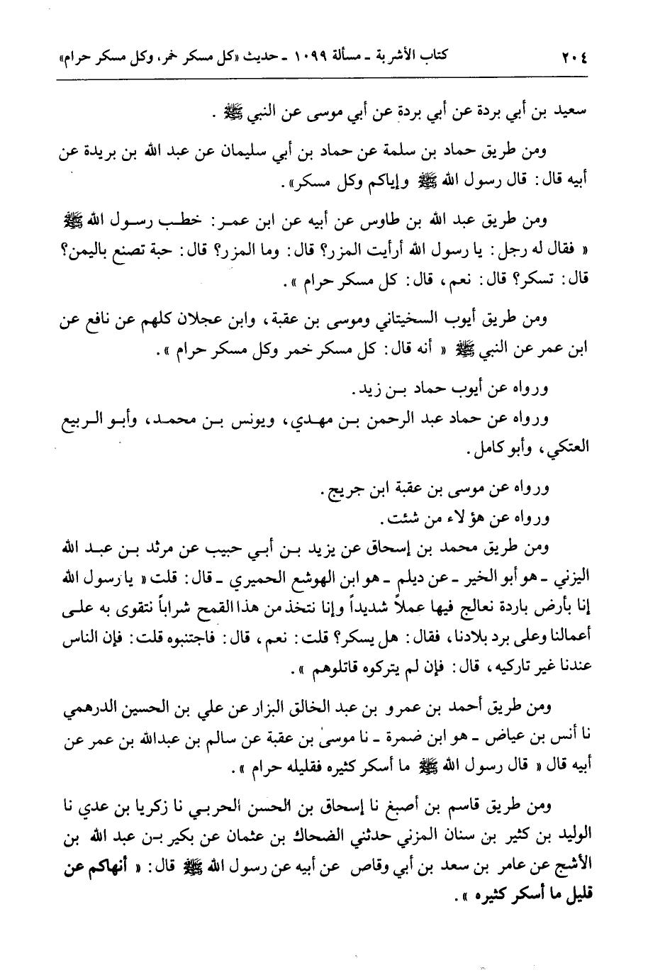 سَعِيدِ بْنِ أَبِي بُرْدَةَ عَنْ أَبِي بُرْدَةَ عَنْ أَبِي مُوسَى عَنْ النَّبِيِّ - صَلَّى اللَّهُ عَلَيْهِ وَسَلَّمَ -. وَمِنْ طَرِيقِ حَمَّادِ بْنِ سَلَمَةَ عَنْ حَمَّادِ بْنِ أَبِي سُلَيْمَانَ عَنْ عَبْدِ اللَّهِ بْنِ بُرَيْدَةَ عَنْ أَبِيهِ قَالَ: قَالَ رَسُولُ اللَّهِ - صَلَّى اللَّهُ عَلَيْهِ وَسَلَّمَ - «وَإِيَّاكُمْ وَكُلَّ مُسْكِرٍ» . وَمِنْ طَرِيقِ عَبْدِ اللَّهِ بْنِ طَاوُسٍ عَنْ أَبِيهِ عَنْ ابْنِ عُمَرَ: «خَطَبَ رَسُولُ اللَّهِ - صَلَّى اللَّهُ عَلَيْهِ وَسَلَّمَ - فَقَالَ لَهُ رَجُلٌ: يَا رَسُولَ اللَّهِ أَرَأَيْتَ الْمِزْرَ؟ قَالَ: وَمَا الْمِزْرُ؟ قَالَ: حَبَّةٌ تُصْنَعُ بِالْيَمَنِ؟ قَالَ: تُسْكِرُ؟ قَالَ: نَعَمْ، قَالَ: كُلُّ مُسْكِرٍ حَرَامٌ» . وَمِنْ طَرِيقِ أَيُّوبَ السِّخْتِيَانِيُّ وَمُوسَى بْنِ عُقْبَةَ، وَابْنِ عَجْلَانَ كُلُّهُمْ عَنْ نَافِعٍ عَنْ ابْنِ عُمَرَ عَنْ النَّبِيِّ - صَلَّى اللَّهُ عَلَيْهِ وَسَلَّمَ - أَنَّهُ قَالَ: «كُلُّ مُسْكِرٍ خَمْرٌ وَكُلُّ مُسْكِرٍ حَرَامٌ» . وَرَوَاهُ عَنْ أَيُّوبَ حَمَّادِ بْنِ زَيْدٍ. وَرَوَاهُ عَنْ حَمَّادٍ عَبْدِ الرَّحْمَنِ بْنِ مَهْدِيٍّ، وَيُونُسَ بْنِ مُحَمَّدٍ، وَأَبُو الرَّبِيعِ الْعَتَكِيُّ، وَأَبُو كَامِلٍ. وَرَوَاهُ عَنْ مُوسَى بْنِ عُقْبَةَ ابْنُ جُرَيْجٍ. وَرَوَاهُ عَنْ هَؤُلَاءِ مَنْ شِئْت. وَمِنْ طَرِيقِ مُحَمَّدِ بْنِ إِسْحَاقَ عَنْ يَزِيدَ بْنِ أَبِي حَبِيبٍ عَنْ مَرْثَدِ بْنِ عَبْدِ اللَّهِ الْيَزَنِيِّ هُوَ أَبُو الْخَيْرِ - «عَنْ دَيْلَمٍ هُوَ ابْنُ الْهَوْشَعِ الْحِمْيَرِيُّ - قَالَ: قُلْتُ يَا رَسُولَ اللَّهِ إنَّا بِأَرْضٍ بَارِدَةٍ نُعَالِجُ فِيهَا عَمَلًا شَدِيدًا وَإِنَّا نَتَّخِذُ مِنْ هَذَا الْقَمْحِ شَرَابًا نَتَقَوَّى بِهِ عَلَى أَعْمَالِنَا وَعَلَى بَرْدِ بِلَادِنَا، فَقَالَ: هَلْ يُسْكِرُ؟ قُلْتُ: نَعَمْ، قَالَ: فَاجْتَنِبُوهُ قُلْتُ: فَإِنَّ النَّاسَ عِنْدَنَا غَيْرُ تَارِكِيهِ، قَالَ: فَإِنْ لَمْ يَتْرُكُوهُ قَاتِلُوهُمْ» .