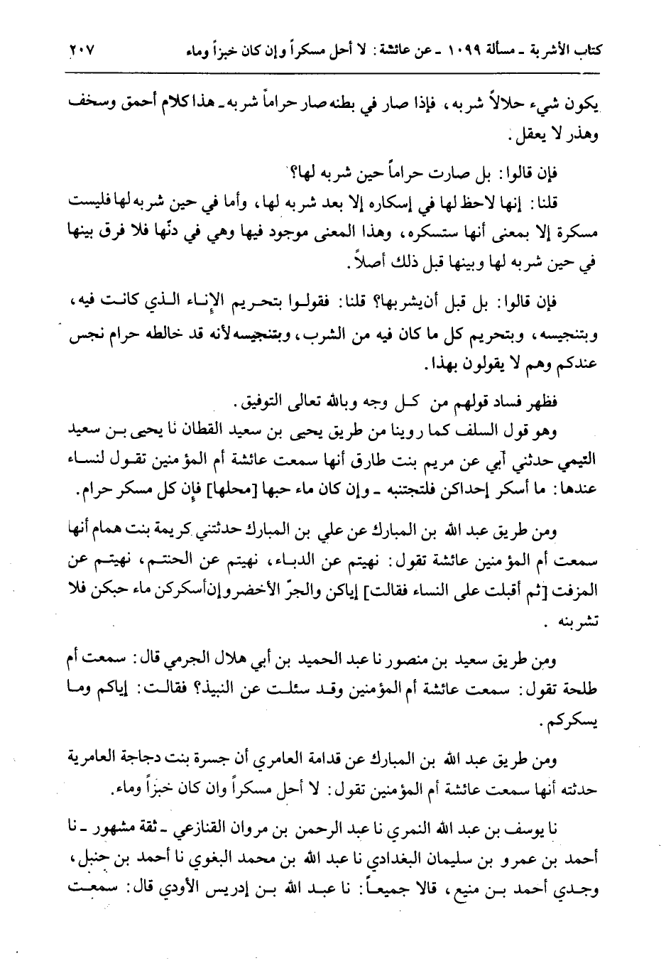 وَهُوَ قَوْلُ السَّلَفِ كَمَا رُوِّينَا مِنْ طَرِيقِ يَحْيَى بْنِ سَعِيدٍ الْقَطَّانِ نا يَحْيَى بْنُ سَعِيدٍ التَّيْمِيُّ حَدَّثَنِي أَبِي عَنْ مَرْيَمَ بِنْتِ طَارِقٍ أَنَّهَا سَمِعَتْ عَائِشَةَ أُمَّ الْمُؤْمِنِينَ تَقُولُ لِنِسَاءٍ عِنْدَهَا: مَا أَسْكَرَ إحْدَاكُنَّ فَلْتَجْتَنِبْهُ - وَإِنْ كَانَ مَاءَ حُبِّهَا [مَحَلِّهَا] فَإِنَّ كُلَّ مُسْكِرٍ حَرَامٌ. وَمِنْ طَرِيقِ عَبْدِ اللَّهِ بْنِ الْمُبَارَكِ عَنْ عَلِيِّ بْنِ الْمُبَارَكِ حَدَّثَتْنِي كَرِيَمَةُ بِنْتُ هَمَّامٍ أَنَّهَا سَمِعَتْ أُمَّ الْمُؤْمِنِينَ عَائِشَةَ تَقُولُ: نُهِيتُمْ عَنْ الدُّبَّاءِ، نُهِيتُمْ عَنْ الْحَنْتَمِ، نُهِيتُمْ عَنْ الْمُزَفَّتِ [ثُمَّ أَقْبَلَتْ عَلَى النِّسَاءِ فَقَالَتْ] إيَّاكُنَّ وَالْجُرَّ الْأَخْضَرَ وَإِنْ أَسْكَرَكُنَّ مَاءُ حُبِّكُنَّ فَلَا تَشْرَبْنَهُ. وَمِنْ طَرِيقِ سَعِيدِ بْنِ مَنْصُورٍ نا عَبْدُ الْحَمِيدِ بْنُ أَبِي هِلَالٍ الْجَرْمِيُّ قَالَ: سَمِعْتُ أُمَّ طَلْحَةَ تَقُولُ: سَمِعْت عَائِشَةَ أُمَّ الْمُؤْمِنِينَ وَقَدْ سُئِلَتْ عَنْ النَّبِيذِ؟ فَقَالَتْ: إيَّاكُمْ وَمَا يُسْكِرُكُمْ. وَمِنْ طَرِيقِ عَبْدِ اللَّهِ بْنِ الْمُبَارَكِ عَنْ قُدَامَةَ الْعَامِرِيِّ أَنَّ جَسْرَةَ بِنْتَ دَجَاجَةَ الْعَامِرِيَّةَ حَدَّثَتْهُ أَنَّهَا سَمِعَتْ عَائِشَةَ أُمَّ الْمُؤْمِنِينَ تَقُولُ: لَا أُحِلُّ مُسْكِرًا وَإِنْ كَانَ خُبْزًا وَمَاءً. نا يُوسُفُ بْنُ عَبْدِ اللَّهِ النَّمَرِيُّ نا عَبْدُ الرَّحْمَنِ بْنُ مَرْوَانَ الْقَنَازِعِيُّ - ثِقَةٌ مَشْهُورٌ - نا أَحْمَدُ بْنُ عَمْرِو بْنِ سُلَيْمَانَ الْبَغْدَادِيُّ نا عَبْدُ اللَّهِ بْنُ مُحَمَّدٍ الْبَغَوِيّ نا أَحْمَدُ بْنُ حَنْبَلٍ، وَجَدِّي أَحْمَدُ بْنُ مَنِيعٍ، قَالَا جَمِيعًا: نا عَبْدُ اللَّهِ بْنُ إدْرِيسَ الْأَوْدِيُّ قَالَ: سَمِعْت