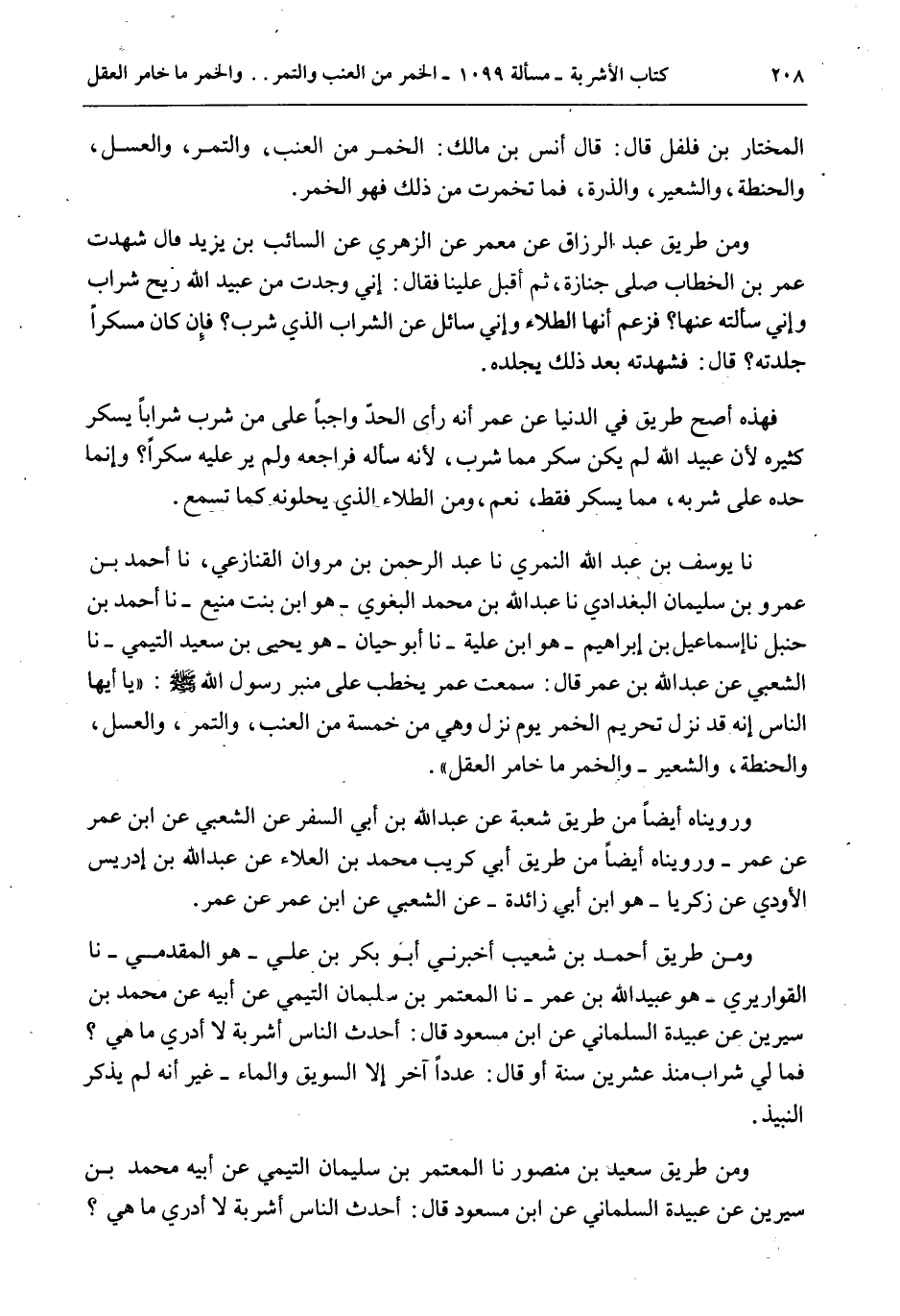 الْمُخْتَارَ بْنَ فُلْفُلٍ قَالَ: قَالَ أَنَسُ بْنُ مَالِكٍ: الْخَمْرُ مِنْ الْعِنَبِ، وَالتَّمْرِ، وَالْعَسَلِ، وَالْحِنْطَةِ، وَالشَّعِيرِ، وَالذُّرَةِ، فَمَا تَخَمَّرَتْ مِنْ ذَلِكَ فَهُوَ الْخَمْرُ. وَمِنْ طَرِيقِ عَبْدِ الرَّزَّاقِ عَنْ مَعْمَرٍ عَنْ الزُّهْرِيِّ عَنْ السَّائِبِ بْنِ يَزِيدَ قَالَ شَهِدْت عُمَرَ بْنَ الْخَطَّابِ صَلَّى جِنَازَةً، ثُمَّ أَقْبَلَ عَلَيْنَا فَقَالَ: إنِّي وَجَدْت مِنْ عُبَيْدِ اللَّهِ رِيحَ شَرَابٍ وَإِنِّي سَأَلْته عَنْهَا؟ فَزَعَمَ أَنَّهَا الطِّلَاءُ وَإِنِّي سَائِلٌ عَنْ الشَّرَابِ الَّذِي شَرِبَ؟ فَإِنْ كَانَ مُسْكِرًا جَلَدْته؟ قَالَ: فَشَهِدْتُهُ بَعْدَ ذَلِكَ يَجْلِدُهُ. فَهَذِهِ أَصَحُّ طَرِيقٍ فِي الدُّنْيَا عَنْ عُمَرَ أَنَّهُ رَأَى الْحَدَّ وَاجِبًا عَلَى مَنْ شَرِبَ شَرَابًا يُسْكِرُ كَثِيرُهُ لِأَنَّ عُبَيْدَ اللَّهِ لَمْ يَكُنْ سَكِرَ مِمَّا شَرِبَ، لِأَنَّهُ سَأَلَهُ فَرَاجَعَهُ وَلَمْ يَرَ عَلَيْهِ سُكْرًا؟ وَإِنَّمَا حَدَّهُ عَلَى شُرْبِهِ، مِمَّا يُسْكِرُ فَقَطْ، نَعَمْ، وَمِنْ الطِّلَاءِ الَّذِي يُحِلُّونَهُ كَمَا تَسْمَعُ. نا يُوسُفُ بْنُ عَبْدِ اللَّهِ النَّمَرِيُّ نا عَبْدُ الرَّحْمَنِ بْنُ مَرْوَانَ الْقَنَازِعِيُّ، نا أَحْمَدُ بْنُ عَمْرِو بْنِ سُلَيْمَانَ الْبَغْدَادِيُّ نا عَبْدُ اللَّهِ بْنُ مُحَمَّدٍ الْبَغَوِيّ هُوَ ابْنُ بِنْتِ مَنِيعٍ - نا أَحْمَدُ بْنُ حَنْبَلٍ نا إسْمَاعِيلُ بْنُ إبْرَاهِيمَ هُوَ ابْنُ عُلَيَّةَ - نا أَبُو حَيَّانَ هُوَ يَحْيَى بْنُ سَعِيدٍ التَّيْمِيُّ - نا الشَّعْبِيُّ عَنْ عَبْدِ اللَّهِ بْنِ عُمَرَ قَالَ: سَمِعْت عُمَرَ يَخْطُبُ عَلَى مِنْبَرِ رَسُولِ اللَّهِ - صَلَّى اللَّهُ عَلَيْهِ وَسَلَّمَ -: يَا أَيُّهَا النَّاسُ إنَّهُ قَدْ نَزَلَ تَحْرِيمُ الْخَمْرِ يَوْمَ نَزَلَ وَهِيَ مِنْ خَمْسَةٍ مِنْ الْعِنَبِ، وَالتَّمْرِ، وَالْعَسَلِ، وَالْحِنْطَةِ، وَالشَّعِيرِ - وَالْخَمْرُ مَا خَامَرَ الْعَقْلَ ".