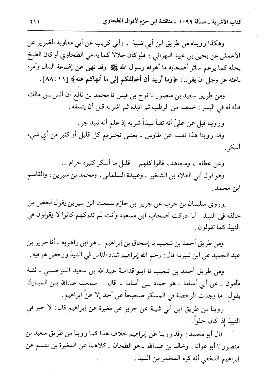 وَهَكَذَا رُوِّينَاهُ مِنْ طَرِيقِ ابْنِ أَبِي شَيْبَةَ، وَأَبِي كُرَيْبٍ عَنْ أَبِي مُعَاوِيَةَ الضَّرِيرِ عَنْ الْأَعْمَشِ عَنْ يَحْيَى بْنِ عُبَيْدٍ الْبَهْرَانِيِّ؛ فَلَوْ كَانَ حَلَالًا كَمَا يَدَّعِي الطَّحَاوِيُّ أَوْ كَانَ الطَّبْخُ يُحِلُّهُ كَمَا يَزْعُمُ سَائِرُ أَصْحَابِهِ مَا أَهْرَقَهُ رَسُولُ اللَّهِ - صَلَّى اللَّهُ عَلَيْهِ وَسَلَّمَ - وَقَدْ نَهَى عَنْ إضَاعَةِ الْمَالِ وَأَمَرَهُ بَاعِثُهُ عَزَّ وَجَلَّ أَنْ يَقُولَ: {وَمَا أُرِيدُ أَنْ أُخَالِفَكُمْ إِلَى مَا أَنْهَاكُمْ عَنْهُ} [هود: 88] . وَمِنْ طَرِيقِ سَعِيدِ بْنِ مَنْصُورٍ نا نُوحُ بْنُ قَيْسٍ نا مُحَمَّدُ بْنُ نَافِعٍ أَنَّ أَنَسَ بْنَ مَالِكٍ قَالَهُ لَهُ فِي الْبُسْرِ: خَلِّصْهُ مِنْ الرُّطَبِ ثُمَّ انْبِذْهُ ثُمَّ اشْرَبْهُ قَبْلَ أَنْ يَتَسَفَّهَ. رُوِّينَا قَبْلُ عَنْ عَلِيٍّ أَنَّهُ تَقَيَّأَ نَبِيذًا شَرِبَهُ إذْ عَلِمَ أَنَّهُ نَبِيذُ جُرٍّ. وَقَدْ رُوِّينَا هَذَا نَفْسَهُ عَنْ طَاوُسٍ - يَعْنِي تَحْرِيمَ كُلِّ قَلِيلٍ أَوْ كَثِيرٍ مِنْ أَيِّ شَيْءٍ أَسْكَرَ. وَعَنْ عَطَاءٍ، وَمُجَاهِدٍ، قَالُوا كُلُّهُمْ: قَلِيلُ مَا أَسْكَرَ كَثِيرُهُ حَرَامٌ -. وَهُوَ قَوْلُ أَبِي الْعَلَاءِ بْنِ الشِّخِّيرِ - وَعَبِيدَةَ السَّلْمَانِيِّ، وَمُحَمَّدِ بْنِ سِيرِينَ، وَالْقَاسِمِ بْنِ مُحَمَّدٍ. وَرَوَى سُلَيْمَانُ بْنُ حَرْبٍ عَنْ جَرِيرِ بْنِ حَازِمٍ سَمِعْت ابْنَ سِيرِينَ يَقُولُ لِبَعْضِ مَنْ خَالَفَهُ فِي النَّبِيذِ: أَنَا أَدْرَكْت أَصْحَابَ ابْنِ مَسْعُودٍ وَأَنْتَ لَمْ تُدْرِكْهُمْ كَانُوا لَا يَقُولُونَ فِي النَّبِيذِ كَمَا تَقُولُونَ. وَمِنْ طَرِيقِ أَحْمَدَ بْنِ شُعَيْبٍ نا إِسْحَاقُ بْنُ إبْرَاهِيمَ هُوَ ابْنُ رَاهْوَيْهِ - أَنَا جَرِيرُ بْنُ عَبْدِ الْحَمِيدِ عَنْ ابْنِ شُبْرُمَةَ قَالَ: رَحِمَ اللَّهُ إبْرَاهِيمَ شَدَّدَ النَّاسُ فِي النَّبِيذِ وَرَخَّصَ هُوَ فِيهِ. وَمِنْ طَرِيقِ أَحْمَدَ بْنِ شُعَيْبٍ نا أَبُو قُدَامَةَ عُبَيْدُ اللَّهِ بْنُ سَعِيدٍ السَّرَخْسِيُّ - ثِقَةٌ مَأْمُونٌ - عَنْ أَبِي أُسَامَةَ هُوَ حَمَّادُ بْنُ أُسَامَةَ - قَالَ: سَمِعْت عَبْدَ اللَّهِ بْنَ الْمُبَارَكِ يَقُولُ: مَا وَجَدْت الرُّخْصَةَ فِي الْمُسْكِرِ صَحِيحًا عَنْ أَحَدٍ إلَّا عَنْ إبْرَاهِيمَ. رُوِّينَا مِنْ طَرِيقِ ابْنِ أَبِي شَيْبَةَ عَنْ جَرِيرٍ عَنْ مُغِيرَةَ عَنْ إبْرَاهِيمَ قَالَ: لَا خَيْرَ فِي النَّبِيذِ إذَا كَانَ حُلْوًا. قَالَ أَبُو مُحَمَّدٍ: وَقَدْ رُوِّينَا عَنْ إبْرَاهِيمَ خِلَافَ هَذَا كَمَا رُوِّينَا مِنْ طَرِيقِ سَعِيدِ بْنِ مَنْصُورٍ نا أَبُو عَوَانَةَ. وَخَالِدُ بْنُ عَبْدِ اللَّهِ هُوَ الطَّحَّانُ - كِلَاهُمَا عَنْ الْمُغِيرَةِ بْنِ مِقْسَمٍ عَنْ إبْرَاهِيمَ النَّخَعِيِّ أَنَّهُ كَرِهَ الْمُخَمَّرَ مِنْ النَّبِيذِ.