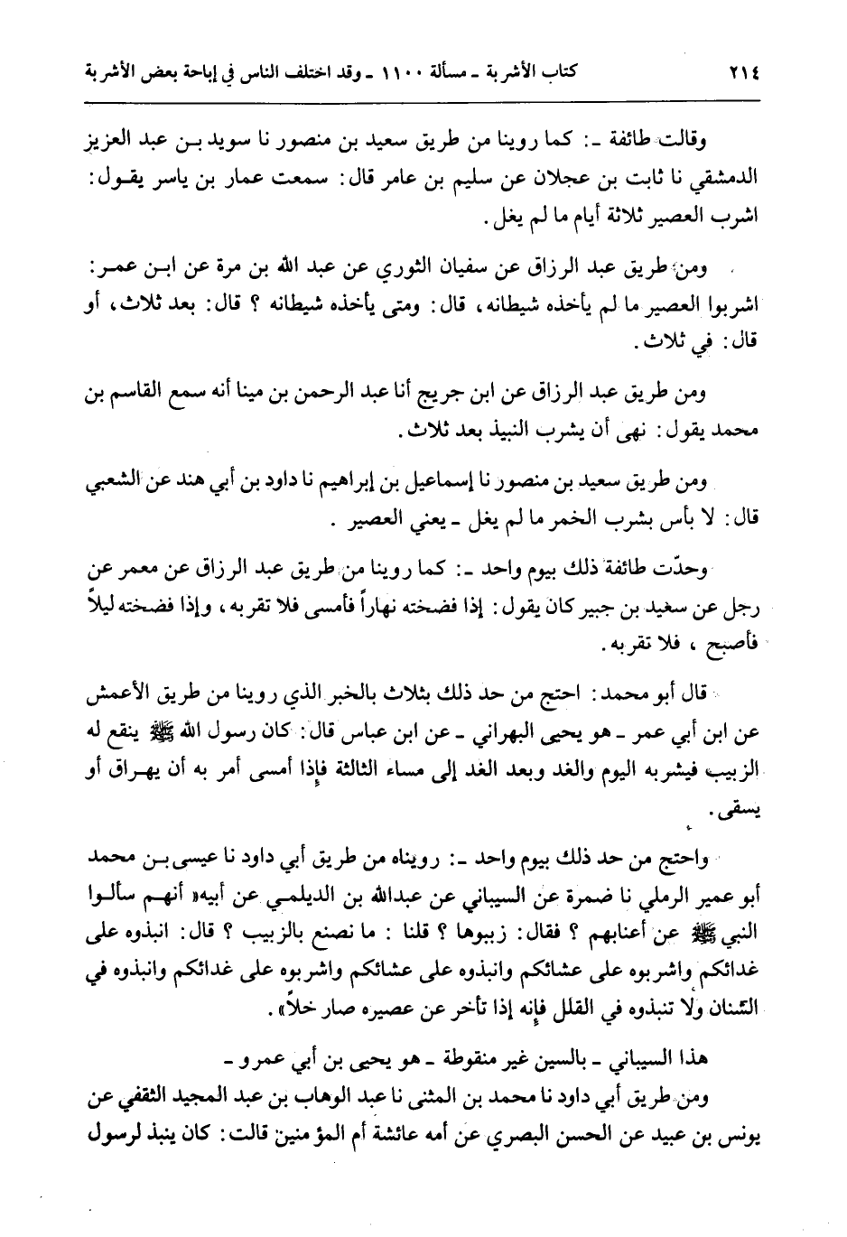 قَالَ أَبُو مُحَمَّدٍ: احْتَجَّ مَنْ حَدَّ ذَلِكَ بِثَلَاثٍ: بِالْخَبَرِ الَّذِي رُوِّينَا مِنْ طَرِيقِ الْأَعْمَشِ عَنْ ابْنِ أَبِي عُمَرَ هُوَ يَحْيَى الْبَهْرَانِيُّ عَنْ ابْنِ عَبَّاسٍ قَالَ: «كَانَ رَسُولُ اللَّهِ - صَلَّى اللَّهُ عَلَيْهِ وَسَلَّمَ - يُنْقَعُ لَهُ الزَّبِيبُ فَيَشْرَبُهُ الْيَوْمَ وَالْغَدَ وَبَعْدَ الْغَدِ إلَى مَسَاءِ الثَّالِثَةِ فَإِذَا أَمْسَى أَمَرَ بِهِ أَنْ يُهْرَاقَ أَوْ يُسْقَى» .