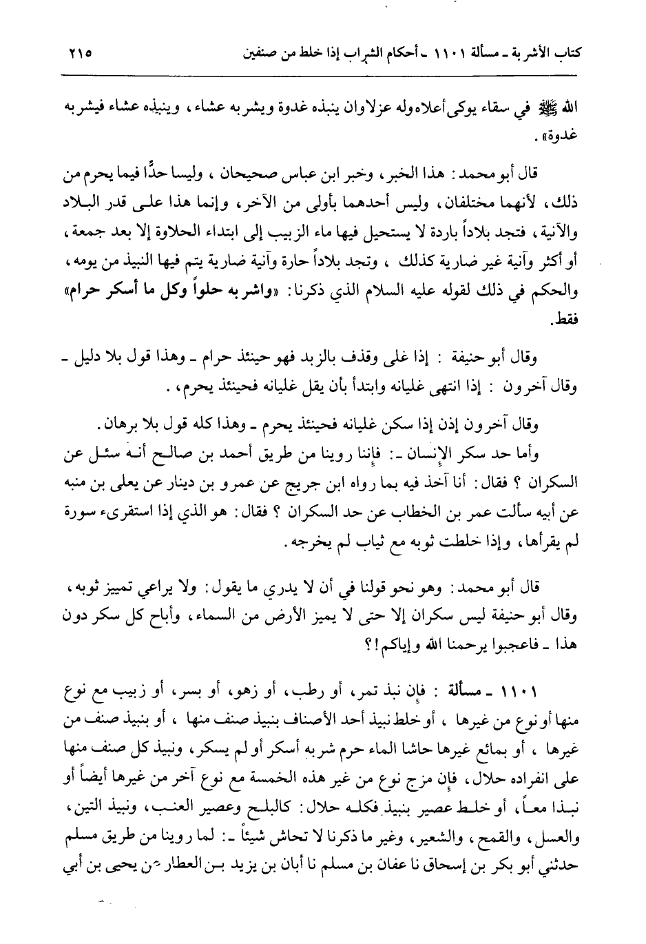 1101 - مَسْأَلَةٌ: فَإِنْ نُبِذَ تَمْرٌ، أَوْ رُطَبٌ، أَوْ زَهْوٌ، أَوْ بُسْرٌ، أَوْ زَبِيبٌ مَعَ نَوْعٍ مِنْهَا أَوْ نَوْعٍ مِنْ غَيْرِهَا، أَوْ خُلِطَ نَبِيذُ أَحَدِ الْأَصْنَافِ بِنَبِيذِ صِنْفٍ مِنْهَا، أَوْ بِنَبِيذِ صِنْفٍ مِنْ غَيْرِهَا، أَوْ بِمَائِعِ غَيْرِهَا حَاشَا الْمَاءِ حَرُمَ شُرْبُهُ أَسْكَرَ أَوْ لَمْ يُسْكِرْ، وَنَبِيذُ كُلِّ صِنْفٍ مِنْهَا عَلَى انْفِرَادِهِ حَلَالٌ، فَإِنْ مُزِجَ نَوْعٌ مِنْ غَيْرِ هَذِهِ الْخَمْسَةِ مَعَ نَوْعٍ آخَرَ مِنْ غَيْرِهَا أَيْضًا أَوْ نُبِذَا مَعًا، أَوْ خُلِطَ عَصِيرٌ بِنَبِيذٍ فَكُلُّهُ حَلَالٌ: كَالْبَلَحِ وَعَصِيرِ الْعِنَبِ، وَنَبِيذِ التِّينِ، وَالْعَسَلِ، وَالْقَمْحِ، وَالشَّعِيرِ، وَغَيْرِ مَا ذَكَرْنَا لَا تَحَاشَ شَيْئًا -: لِمَا رُوِّينَا مِنْ طَرِيقِ مُسْلِمٍ حَدَّثَنِي أَبُو بَكْرِ بْنُ إِسْحَاقَ نَا عَفَّانَ بْنُ مُسْلِمٍ نا أَبَانُ بْنُ يَزِيدَ بْنِ الْعَطَّارِ عَنْ يَحْيَى بْنِ أَبِي كَثِيرٍ