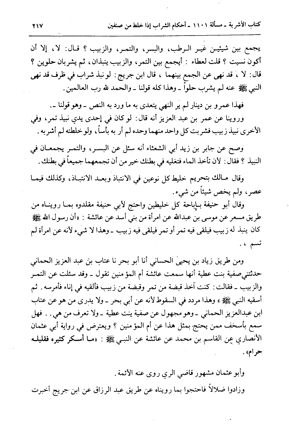 وَمِنْ طَرِيقِ زِيَادِ بْنِ يَحْيَى الْحَسَّانِيِّ أَنَا أَبُو بَحْرٍ نَا عَتَّابُ بْنُ عَبْدِ الْعَزِيزِ الْحِمَّانِيُّ حَدَّثَتْنِي صَفِيَّةُ بِنْتُ عَطِيَّةَ أَنَّهَا سَمِعَتْ «عَائِشَةَ أُمَّ الْمُؤْمِنِينَ تَقُولُ - وَقَدْ سُئِلَتْ عَنْ التَّمْرِ وَالزَّبِيبِ - فَقَالَتْ: كُنْت آخُذُ قَبْضَةً مِنْ تَمْرٍ وَقَبْضَةً مِنْ زَبِيبٍ فَأُلْقِيهِ فِي إنَاءٍ فَأَمْرُسُهُ، ثُمَّ أَسْقِيهِ النَّبِيَّ - صَلَّى اللَّهُ عَلَيْهِ وَسَلَّمَ -» وَهَذَا مُرَدَّدٌ فِي السُّقُوطِ؛ لِأَنَّهُ عَنْ أَبِي بَحْرٍ - لَا يُدْرَى مَنْ هُوَ عَنْ عَتَّابِ بْنِ عَبْدِ الْعَزِيزِ الْحِمَّانِيُّ - وَهُوَ مَجْهُولٌ عَنْ صَفِيَّةَ بِنْتِ عَطِيَّةَ - وَلَا تُعْرَفُ مَنْ هِيَ فَهَلْ سُمِعَ بِأَسْخَفَ مِمَّنْ يَحْتَجُّ بِمِثْلِ هَذَا عَنْ أُمِّ الْمُؤْمِنِينَ؟ وَيَعْتَرِضُ فِي رِوَايَةِ أَبِي عُثْمَانَ الْأَنْصَارِيِّ عَنْ الْقَاسِمِ بْنِ مُحَمَّدٍ عَنْ عَائِشَةَ عَنْ النَّبِيِّ - صَلَّى اللَّهُ عَلَيْهِ وَسَلَّمَ -: «مَا أَسْكَرَ كَثِيرُهُ فَقَلِيلُهُ حَرَامٌ» .