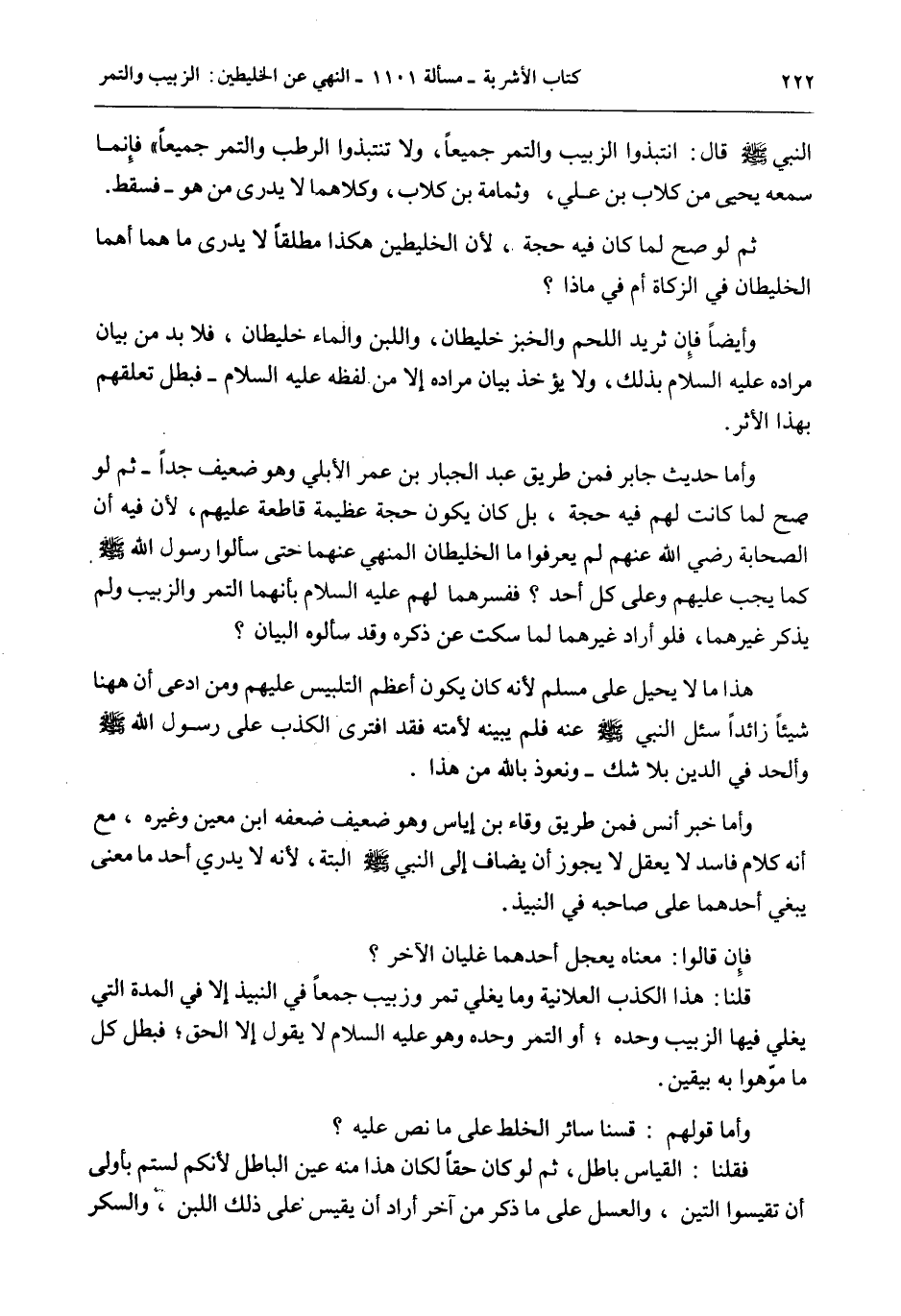 النَّبِيَّ - صَلَّى اللَّهُ عَلَيْهِ وَسَلَّمَ - قَالَ: «انْتَبِذُوا الزَّبِيبَ وَالتَّمْرَ جَمِيعًا، وَلَا تَنْتَبِذُوا الرُّطَبَ وَالتَّمْرَ جَمِيعًا» فَإِنَّمَا سَمِعَهُ يَحْيَى مِنْ كِلَابِ بْنِ عَلِيٍّ، وَثُمَامَةَ بْنِ كِلَابٍ، وَكِلَاهُمَا لَا يُدْرَى مَنْ هُوَ - فَسَقَطَ. ثُمَّ لَوْ صَحَّ لَمَا كَانَ فِيهِ حُجَّةٌ؛ لِأَنَّ الْخَلِيطَيْنِ هَكَذَا مُطْلَقًا لَا يُدْرَى مَا هُمَا أَهُمَا الْخَلِيطَانِ فِي الزَّكَاةِ أَمْ فِي مَاذَا؟ وَأَيْضًا فَإِنَّ ثَرِيدَ اللَّحْمِ وَالْخُبْزِ خَلِيطَانِ، وَاللَّبَنَ وَالْمَاءَ خَلِيطَانِ، فَلَا بُدَّ مِنْ بَيَانِ مُرَادِهِ - عَلَيْهِ السَّلَامُ - بِذَلِكَ، وَلَا يُؤْخَذُ بَيَانُ مُرَادِهِ إلَّا مِنْ لَفْظِهِ - عَلَيْهِ السَّلَامُ - فَبَطَلَ تَعَلُّقُهُمْ بِهَذَا الْأَثَرِ.