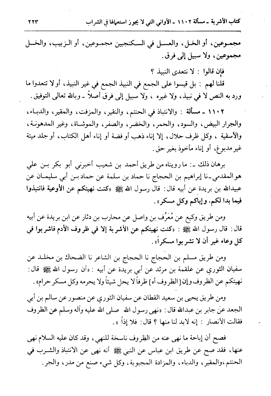 وَمِنْ طَرِيقِ مُسْلِمِ بْنِ الْحَجَّاجِ نَا الْحَجَّاجُ بْنُ الشَّاعِرُ نَا الضَّحَّاكُ بْنُ مَخْلَدٍ عَنْ سُفْيَان الثَّوْرِيِّ عَنْ عَلْقَمَةَ بْنِ مَرْثَدٍ عَنْ أَبِي بُرَيْدَةَ عَنْ أَبِيهِ: أَنَّ رَسُولَ اللَّهِ - صَلَّى اللَّهُ عَلَيْهِ وَسَلَّمَ - قَالَ: «نَهَيْتُكُمْ عَنْ الظُّرُوفِ وَإِنَّ الظُّرُوفَ ظَرْفًا لَا يُحِلُّ شَيْئًا وَلَا يُحَرِّمُهُ وَكُلُّ مُسْكِرٍ حَرَامٌ»