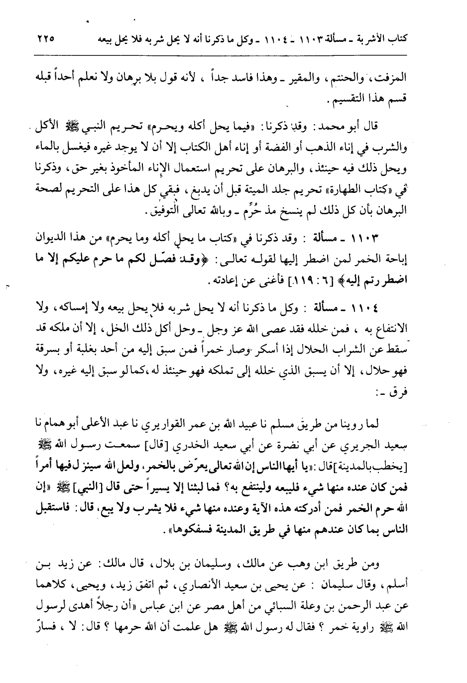 1104 - مَسْأَلَةٌ: وَكُلُّ مَا ذَكَرْنَا أَنَّهُ لَا يَحِلُّ شُرْبُهُ فَلَا يَحِلُّ بَيْعُهُ وَلَا إمْسَاكُهُ، وَلَا الِانْتِفَاعُ بِهِ، فَمَنْ خَلَّلَهُ فَقَدْ عَصَى اللَّهَ عَزَّ وَجَلَّ - وَحَلَّ أَكْلُ ذَلِكَ الْخَلِّ، إلَّا أَنَّ مِلْكَهُ قَدْ سَقَطَ عَنْ الشَّرَابِ الْحَلَالِ إذَا أَسْكَرَ وَصَارَ خَمْرًا فَمَنْ سَبَقَ إلَيْهِ مِنْ أَحَدٍ بِغَلَبَةٍ أَوْ بِسَرِقَةٍ فَهُوَ حَلَالٌ، إلَّا أَنْ يَسْبِقَ الَّذِي خَلَّلَهُ إلَى تَمَلُّكِهِ فَهُوَ حِينَئِذٍ لَهُ، كَمَا لَوْ سَبَقَ إلَيْهِ غَيْرِهِ، وَلَا فَرْقَ؛ لِمَا رُوِّينَا مِنْ طَرِيقِ مُسْلِمٍ نَا عُبَيْدُ اللَّهِ بْنُ عُمَرَ الْقَوَارِيرِيُّ نَا عَبْدُ الْأَعْلَى أَبُو هَمَّامٍ نَا سَعِيدٌ الْجُرَيْرِيُّ عَنْ أَبِي نَضْرَةَ عَنْ أَبِي سَعِيدٍ الْخُدْرِيِّ قَالَ: «سَمِعْتُ رَسُولَ اللَّهِ - صَلَّى اللَّهُ عَلَيْهِ وَسَلَّمَ - يَخْطُبُ بِالْمَدِينَةِ قَالَ: يَا أَيُّهَا النَّاسُ إنَّ اللَّهَ تَعَالَى يُعَرِّضُ بِالْخَمْرِ، وَلَعَلَّ اللَّهَ سَيُنْزِلُ فِيهَا أَمْرًا فَمَنْ كَانَ عِنْدَهُ مِنْهَا شَيْءٌ فَلْيَبِعْهُ وَلْيَنْتَفِعْ بِهِ؟ فَمَا لَبِثْنَا إلَّا يَسِيرًا حَتَّى قَالَ النَّبِيُّ - صَلَّى اللَّهُ عَلَيْهِ وَسَلَّمَ - إنَّ اللَّهَ حَرَّمَ الْخَمْرَ فَمَنْ أَدْرَكَتْهُ هَذِهِ الْآيَةُ وَعِنْدَهُ مِنْهَا شَيْءٌ فَلَا يَشْرَبْ وَلَا يَبِعْ، قَالَ: فَاسْتَقْبَلَ النَّاسُ بِمَا كَانَ عِنْدَهُمْ مِنْهَا فِي طَرِيقِ الْمَدِينَةِ فَسَفَكُوهَا» .