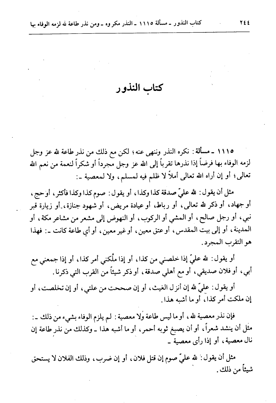 ِ 1115 - مَسْأَلَةٌ: نَكْرَهُ النَّذْرَ وَنَنْهَى عَنْهُ؛ لَكِنْ مَعَ ذَلِكَ مَنْ نَذَرَ طَاعَةً لِلَّهِ عَزَّ وَجَلَّ لَزِمَهُ الْوَفَاءُ بِهَا فَرْضًا إذَا نَذَرَهَا تَقَرُّبًا إلَى اللَّهِ عَزَّ وَجَلَّ مُجَرَّدًا أَوْ شُكْرًا لِنِعْمَةٍ مِنْ نِعَمِ اللَّهِ تَعَالَى؛ أَوْ إنْ أَرَاهُ اللَّهُ تَعَالَى أَمَلًا لَا ظُلْمَ فِيهِ لِمُسْلِمٍ، وَلَا لِمَعْصِيَةٍ -: