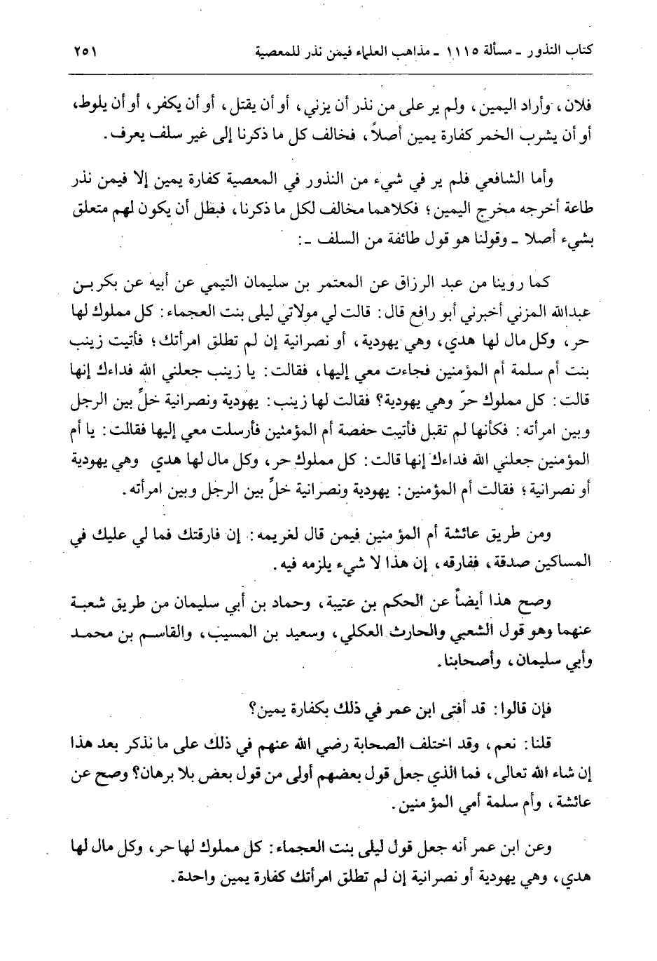 وَأَمَّا الشَّافِعِيُّ فَلَمْ يَرَ فِي شَيْءٍ مِنْ النُّذُورِ فِي الْمَعْصِيَةِ كَفَّارَةَ يَمِينٍ إلَّا فِيمَنْ نَذَرَ طَاعَةً أَخْرَجَهُ مَخْرَجَ الْيَمِينِ؛ فَكِلَاهُمَا مُخَالِفٌ لِكُلِّ مَا ذَكَرْنَا، فَبَطَلَ أَنْ يَكُونَ لَهُمْ مُتَعَلَّقٌ بِشَيْءٍ أَصْلًا - وَقَوْلُنَا هُوَ قَوْلُ طَائِفَةٍ مِنْ السَّلَفِ -: كَمَا رُوِّينَا مِنْ عَبْدِ الرَّزَّاقِ عَنْ الْمُعْتَمِرِ بْنِ سُلَيْمَانَ التَّيْمِيِّ عَنْ أَبِيهِ عَنْ بَكْرِ بْنِ عَبْدِ اللَّهِ الْمُزَنِيّ أَخْبَرَنِي أَبُو رَافِعٍ قَالَ: قَالَتْ لِي مَوْلَاتِي لَيْلَى بِنْتِ الْعَجْمَاءِ: كُلُّ مَمْلُوكٍ لَهَا حُرٌّ، وَكُلُّ مَالٍ لَهَا هَدْيٌ، وَهِيَ يَهُودِيَّةٌ، أَوْ نَصْرَانِيَّةٌ إنْ لَمْ تُطَلِّقْ امْرَأَتَك؛ فَأَتَيْت زَيْنَبَ بِنْتَ أُمِّ سَلَمَةَ أُمَّ الْمُؤْمِنِينَ فَجَاءَتْ مَعِي إلَيْهَا، فَقَالَتْ: يَا زَيْنَبُ جَعَلَنِي اللَّهُ فِدَاءَك إنَّهَا قَالَتْ: كُلُّ مَمْلُوكٍ حُرٌّ وَهِيَ يَهُودِيَّةٌ؟ فَقَالَتْ لَهَا زَيْنَبُ: يَهُودِيَّةٌ وَنَصْرَانِيَّةٌ خَلِّ بَيْنَ الرَّجُلِ وَبَيْنَ امْرَأَتِهِ: فَكَأَنَّهَا لَمْ تَقْبَلْ فَأَتَيْت حَفْصَةَ أُمَّ الْمُؤْمِنِينَ فَأَرْسَلَتْ مَعِي إلَيْهَا فَقَالَتْ: يَا أُمَّ الْمُؤْمِنِينَ جَعَلَنِي اللَّهُ فِدَاءَك إنَّهَا قَالَتْ: كُلُّ مَمْلُوكٍ حُرٌّ، وَكُلُّ مَالٍ لَهَا هَدْيٌ وَهِيَ يَهُودِيَّةٌ أَوْ نَصْرَانِيَّةٌ؛ فَقَالَتْ أُمُّ الْمُؤْمِنِينَ: يَهُودِيَّةٌ وَنَصْرَانِيَّةٌ خَلِّ بَيْنَ الرَّجُلِ وَبَيْنَ امْرَأَتِهِ.