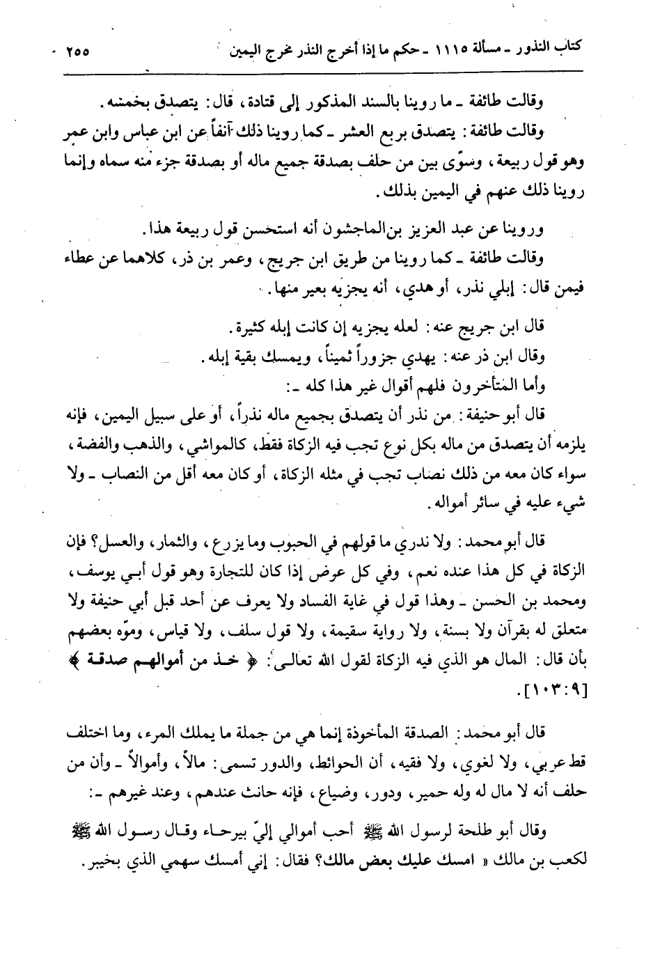قَالَ أَبُو مُحَمَّدٍ: الصَّدَقَةُ الْمَأْخُوذَةُ إنَّمَا هِيَ مِنْ جُمْلَةِ مَا يَمْلِكُ الْمَرْءُ، وَمَا اخْتَلَفَ قَطُّ عَرَبِيٌّ، وَلَا لُغَوِيٌّ، وَلَا فَقِيهٌ، أَنَّ الْحَوَائِطَ، وَالدُّورَ تُسَمَّى: مَالًا، وَأَمْوَالًا - وَأَنَّ مَنْ حَلَفَ أَنَّهُ لَا مَالَ لَهُ وَلَهُ حَمِيرٌ، وَدُورٌ، وَضِيَاعٌ، فَإِنَّهُ حَانِثٌ عِنْدَهُمْ، وَعِنْدَ غَيْرِهِمْ -: وَقَالَ أَبُو طَلْحَةَ لِرَسُولِ اللَّهِ - صَلَّى اللَّهُ عَلَيْهِ وَسَلَّمَ - أَحَبُّ أَمْوَالِي إلَيَّ بَيْرُحَاءُ «وَقَالَ رَسُولُ اللَّهِ - صَلَّى اللَّهُ عَلَيْهِ وَسَلَّمَ - لِكَعْبِ بْنِ مَالِكٍ أَمْسِكْ عَلَيْكَ بَعْضَ مَالِكَ؟ فَقَالَ: إنِّي أُمْسِكُ سَهْمِي الَّذِي بِخَيْبَرَ» .
