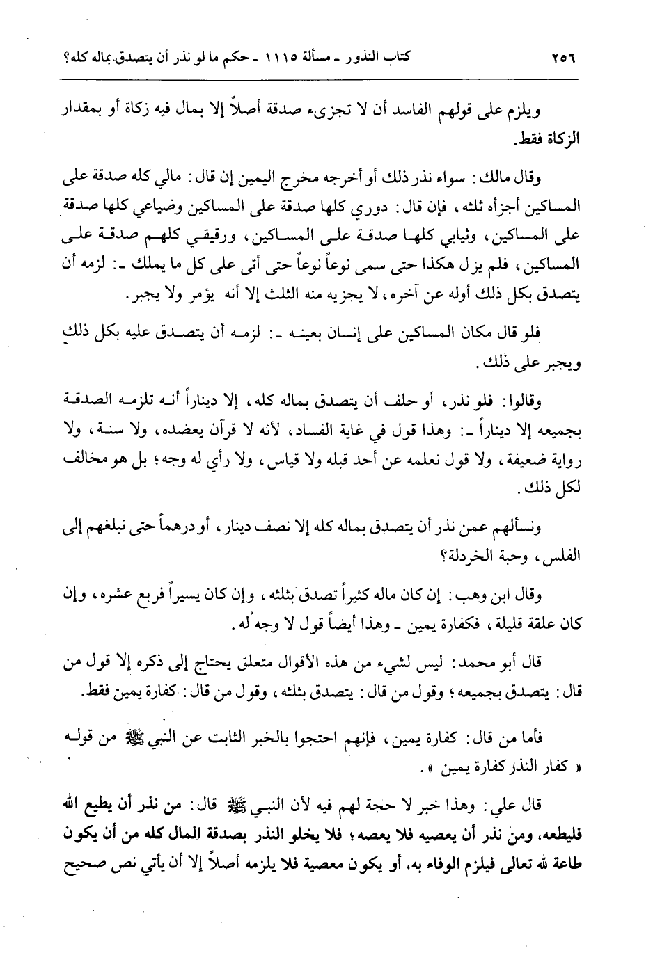 قَالَ عَلِيٌّ: وَهَذَا خَبَرٌ لَا حُجَّةَ لَهُمْ فِيهِ لِأَنَّ النَّبِيَّ - صَلَّى اللَّهُ عَلَيْهِ وَسَلَّمَ - قَالَ: «مَنْ نَذَرَ أَنْ يُطِيعَ اللَّهَ فَلْيُطِعْهُ، وَمَنْ نَذَرَ أَنْ يَعْصِيَهُ فَلَا يَعْصِهِ» ؛ فَلَا يَخْلُو النَّذْرُ بِصَدَقَةِ الْمَالِ كُلِّهِ مِنْ أَنْ يَكُونَ طَاعَةً لِلَّهِ تَعَالَى فَيَلْزَمُ الْوَفَاءُ بِهِ، أَوْ يَكُونَ مَعْصِيَةً فَلَا يَلْزَمُهُ أَصْلًا إلَّا أَنْ يَأْتِيَ نَصٌّ صَحِيحٌ