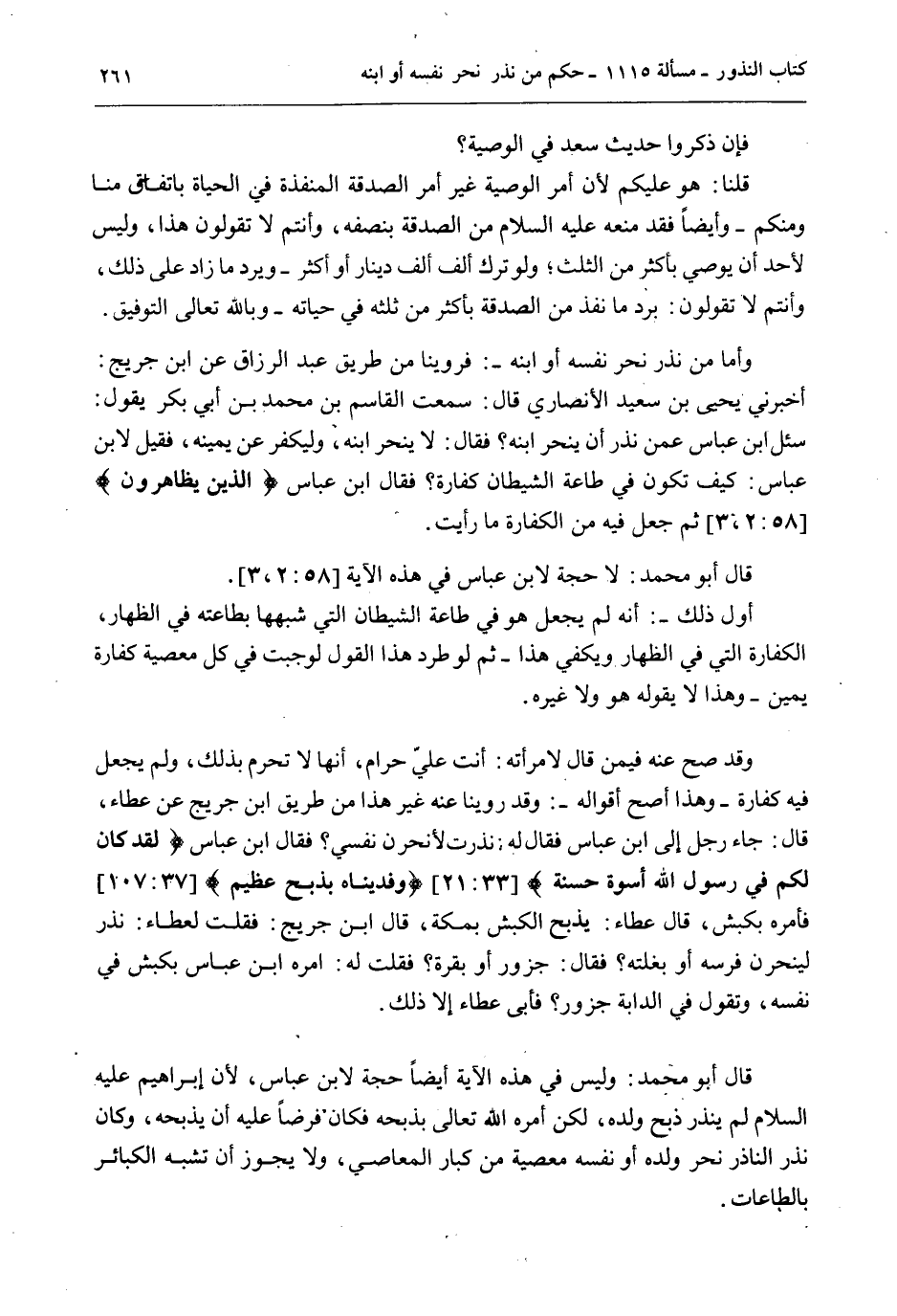 قَالَ أَبُو مُحَمَّدٍ: وَلَيْسَ فِي هَذِهِ الْآيَةِ أَيْضًا حُجَّةٌ لِابْنِ عَبَّاسٍ؛ لِأَنَّ إبْرَاهِيمَ - عَلَيْهِ السَّلَامُ - لَمْ يَنْذُرْ ذَبْحَ وَلَدِهِ، لَكِنْ أَمَرَهُ اللَّهُ تَعَالَى بِذَبْحِهِ فَكَانَ فَرْضًا عَلَيْهِ أَنْ يَذْبَحَهُ، وَكَانَ نَذْرُ النَّاذِرِ نَحْرُ وَلَدِهِ أَوْ نَفْسِهِ مَعْصِيَةً مِنْ كِبَارِ الْمَعَاصِي، وَلَا يَجُوزُ أَنْ تُشَبَّهَ الْكَبَائِرُ بِالطَّاعَاتِ.