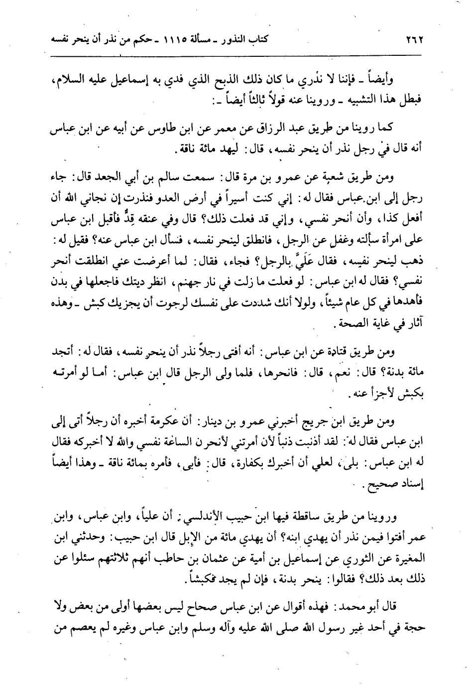 وَأَيْضًا - فَإِنَّنَا لَا نَدْرِي مَا كَانَ ذَلِكَ الذَّبْحُ الَّذِي فُدِيَ بِهِ إسْمَاعِيلُ - عَلَيْهِ السَّلَامُ -، فَبَطَلَ هَذَا التَّشْبِيهُ - وَرُوِّينَا عَنْهُ قَوْلًا ثَالِثًا أَيْضًا -: كَمَا رُوِّينَا مِنْ طَرِيقِ عَبْدِ الرَّزَّاقِ عَنْ مَعْمَرٍ عَنْ ابْنِ طَاوُسٍ عَنْ أَبِيهِ عَنْ ابْنِ عَبَّاسٍ أَنَّهُ قَالَ فِي رَجُلٍ نَذَرَ أَنْ يَنْحَرَ نَفْسَهُ، قَالَ: لِيُهْدِ مِائَةَ نَاقَةٍ. وَمِنْ طَرِيقِ شُعْبَةَ عَنْ عَمْرِو بْنِ مُرَّةَ قَالَ: سَمِعْت سَالِمَ بْنَ أَبِي الْجَعْدِ قَالَ: جَاءَ رَجُلٌ إلَى ابْنِ عَبَّاسٍ فَقَالَ لَهُ: إنِّي كُنْت أَسِيرًا فِي أَرْضِ الْعَدُوِّ فَنَذَرْت إنْ نَجَّانِي اللَّهُ أَنْ أَفْعَلَ كَذَا، وَأَنْ أَنْحَرَ نَفْسِي، وَإِنِّي قَدْ فَعَلْت ذَلِكَ؟ قَالَ وَفِي عُنُقِهِ قِدٌّ فَأَقْبَلَ ابْنُ عَبَّاسٍ عَلَى امْرَأَةٍ سَأَلَتْهُ وَغَفَلَ عَنْ الرَّجُلِ، فَانْطَلَقَ لِيَنْحَرَ نَفْسَهُ، فَسَأَلَ ابْنَ عَبَّاسٍ عَنْهُ؟ فَقِيلَ لَهُ: ذَهَبَ لِيَنْحَرَ نَفْسَهُ، فَقَالَ عَلَيَّ بِالرَّجُلِ؟ فَجَاءَ، فَقَالَ: لَمَّا أَعْرَضْت عَنِّي انْطَلَقْت أَنْحَرُ نَفْسِي؟ فَقَالَ لَهُ ابْنُ عَبَّاسٍ: لَوْ فَعَلْت مَا زِلْت فِي نَارِ جَهَنَّمَ، اُنْظُرْ دِيَتَك فَاجْعَلْهَا فِي بُدْنٍ فَأَهْدِهَا فِي كُلِّ عَامٍ شَيْئًا، وَلَوْلَا أَنَّك شَدَدْت عَلَى نَفْسِك لَرَجَوْت أَنْ يُجْزِيك كَبْشٌ - وَهَذِهِ آثَارٌ فِي غَايَةِ الصِّحَّةِ.